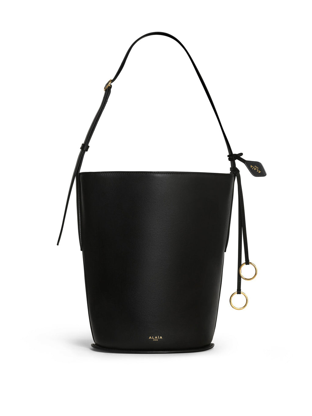 Alaïa’s Hip Bucket Bag is crafted from smooth calfskin leather in the brand’s signature anatomical curved silhouette. Designed with an adjustable strap, it features ring metal charms embossed with the logo, combining functionality with a distinctive sculptural form.