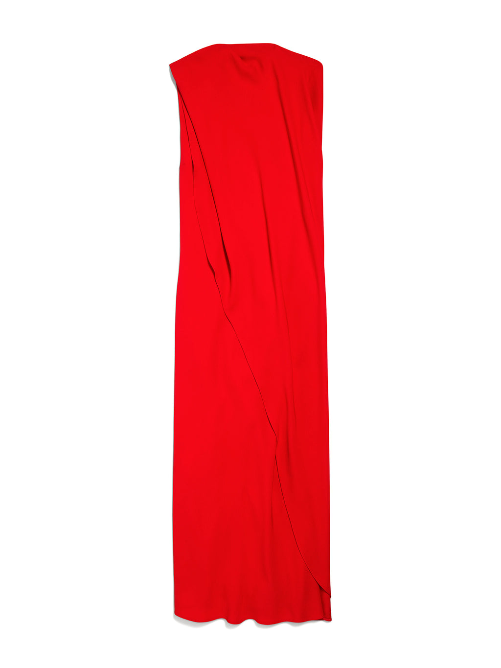 The Draped Maxi Dress by Balenciaga, from Look 17 of the Summer 2026 Runway show, embodies the house’s command of fluid form and controlled asymmetry. Cut from silk and wool crepe in a striking sunset red, the silhouette falls gracefully, guided by an elongated panel that drapes over the shoulder and cascades along the body. This sculptural gesture introduces movement and tension, offset by the clean, sleeveless base beneath. With its open back and sense of drama, the piece is an an exploration of how fabric alone can shape presence.