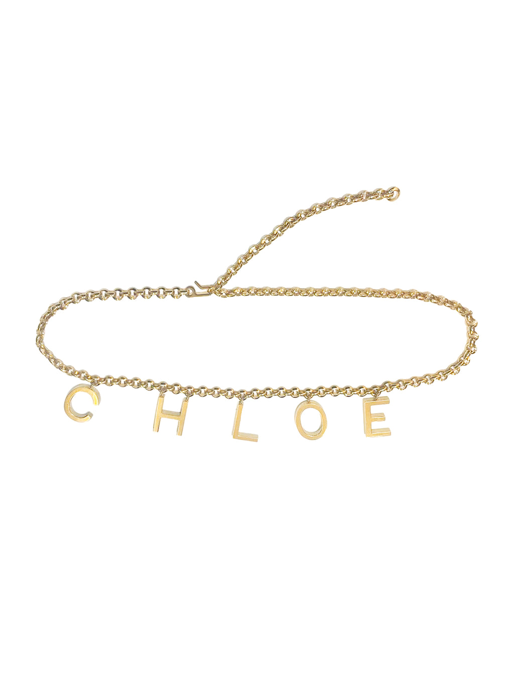 Chloé Letters Jewelry Belt in vintage gold brass expresses the Chloé signature through letter charms. Seen on the Winter ’25 runway. -