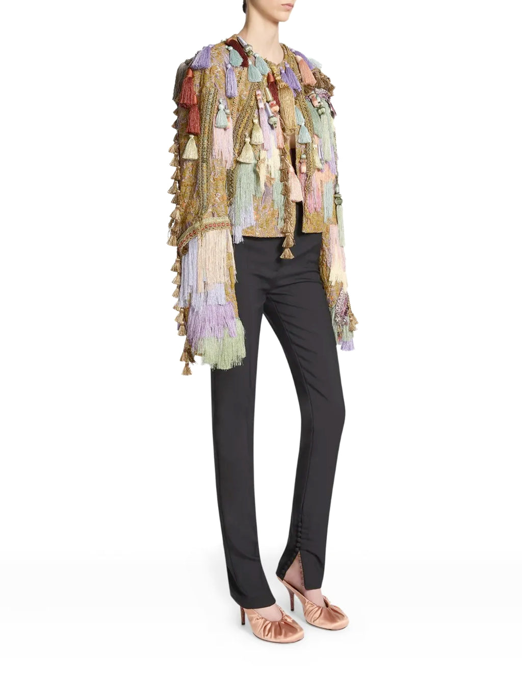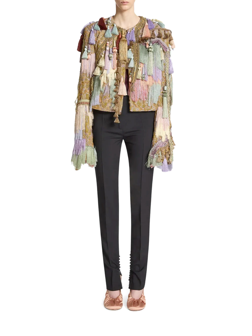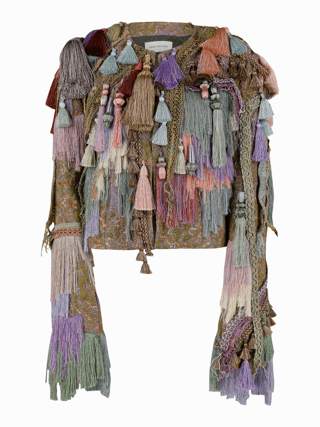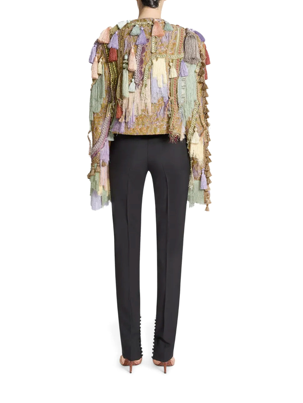 As seen on the AW25-26 Runway, Dries van Noten’s Baftanos Embellished Jacket is crafted in textured viscose cloqué with allover tassel detailing that creates movement and depth. The cropped silhouette is structured with padded shoulders, making it a statement layer over streamlined trousers or a sleek skirt.