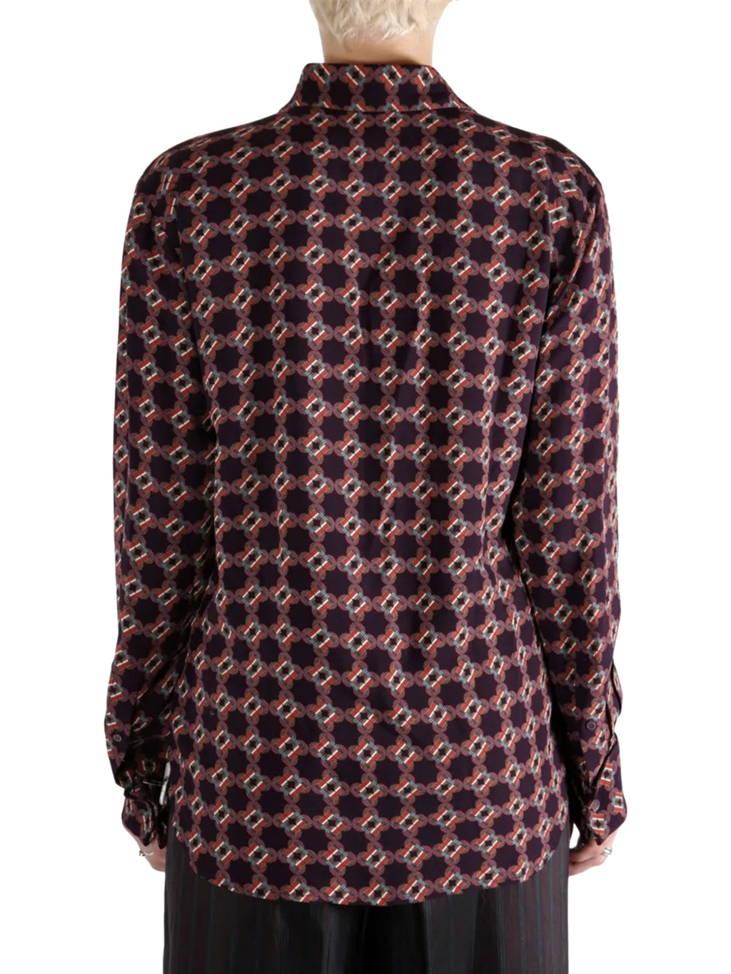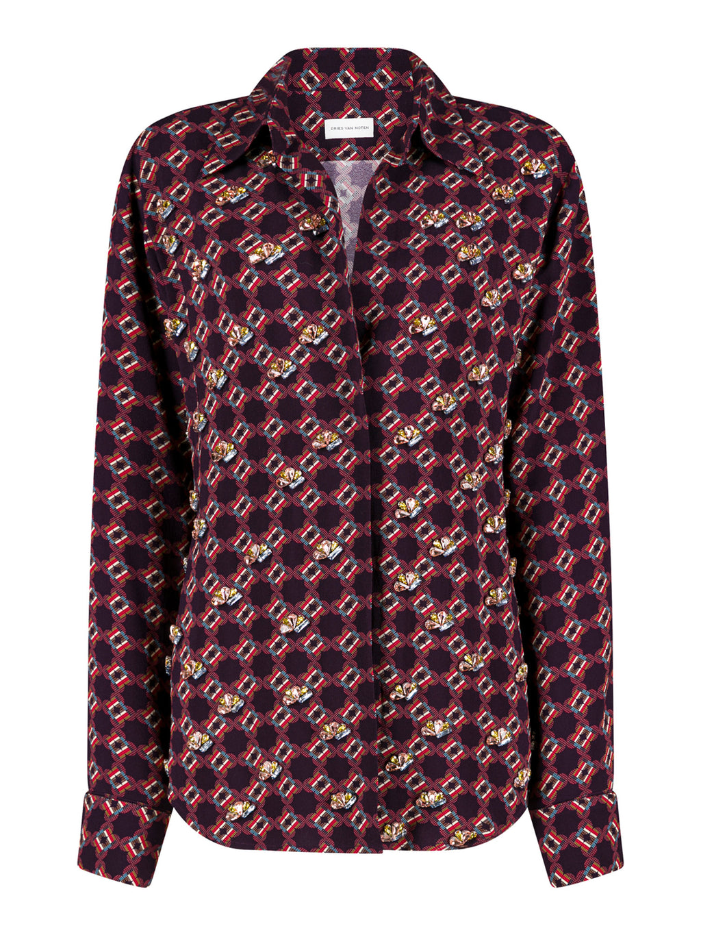 Dries Van Noten’s Celindra shirt reimagines a classic silhouette with geometric print and embellishment. The design fuses sharp tailoring with decorative detail, a balance of structure and ornament that defines the house’s language. -