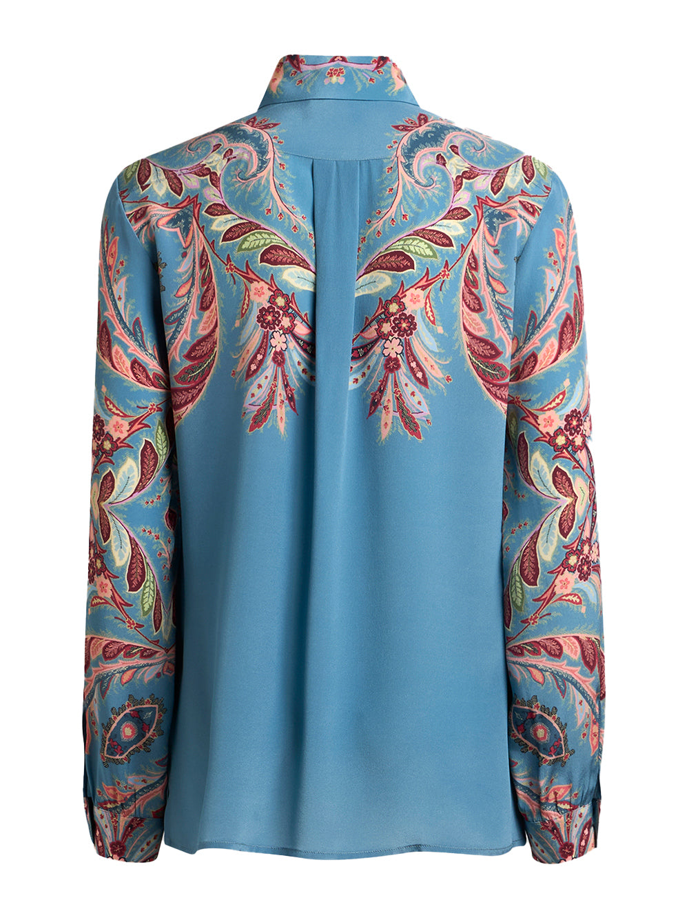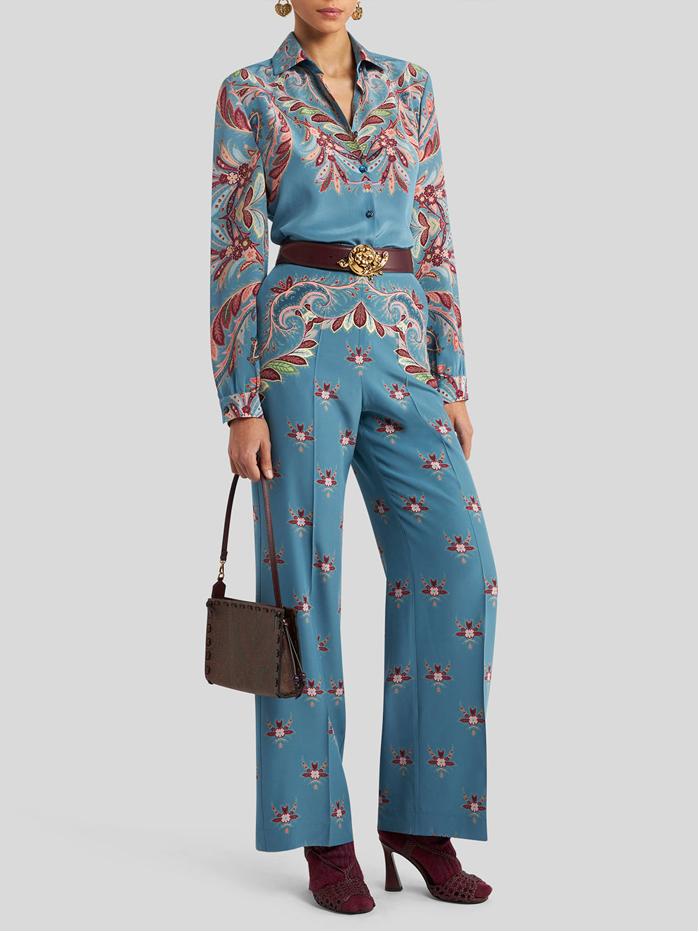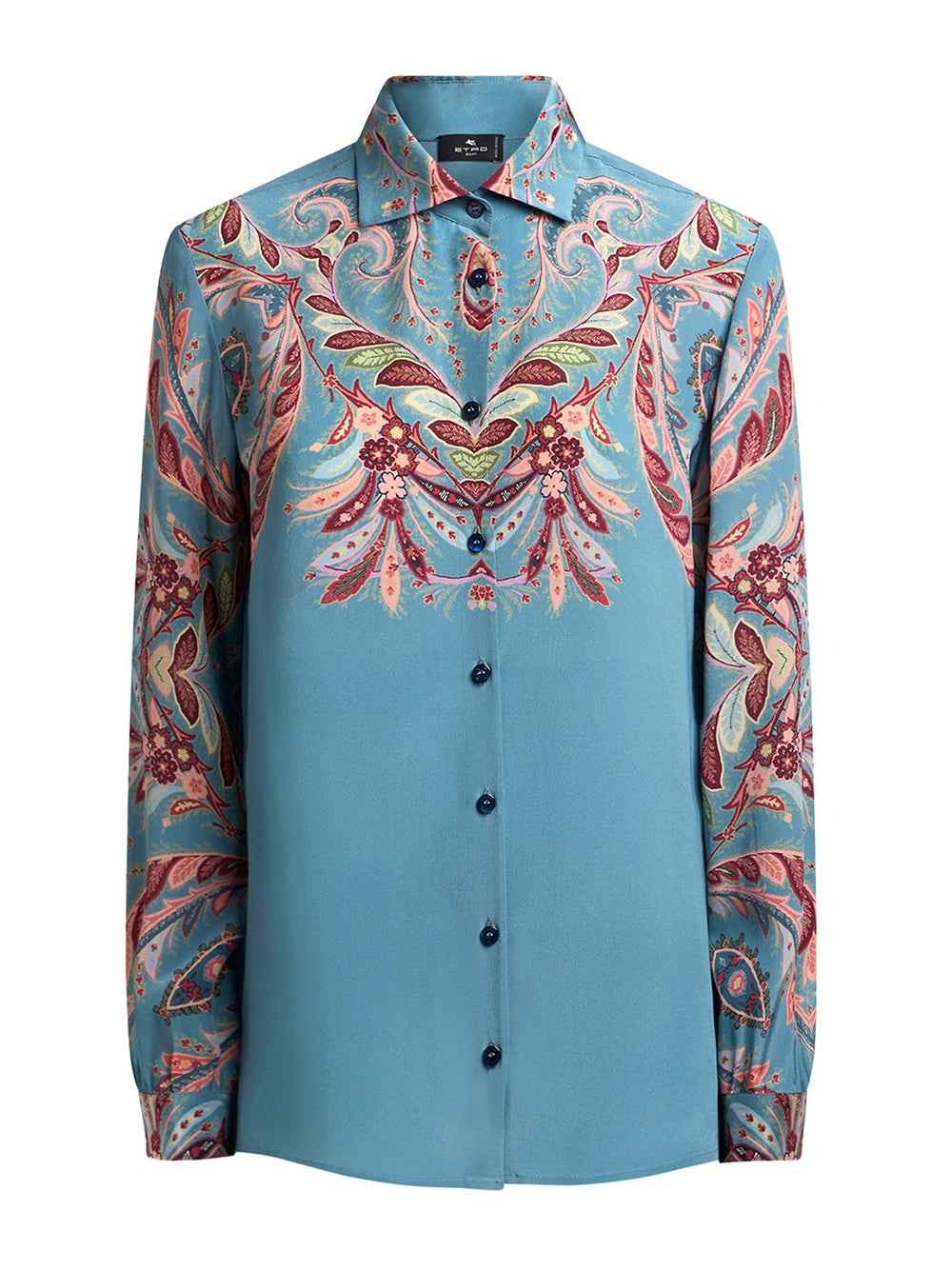 The Paisley Silk Shirt by Etro is crafted from fluid silk satin and detailed with the house’s iconic paisley print at the collar. Designed to pair with the matching Floral Silk Flared Pants, it channels Etro’s signature mix of pattern and polish. -