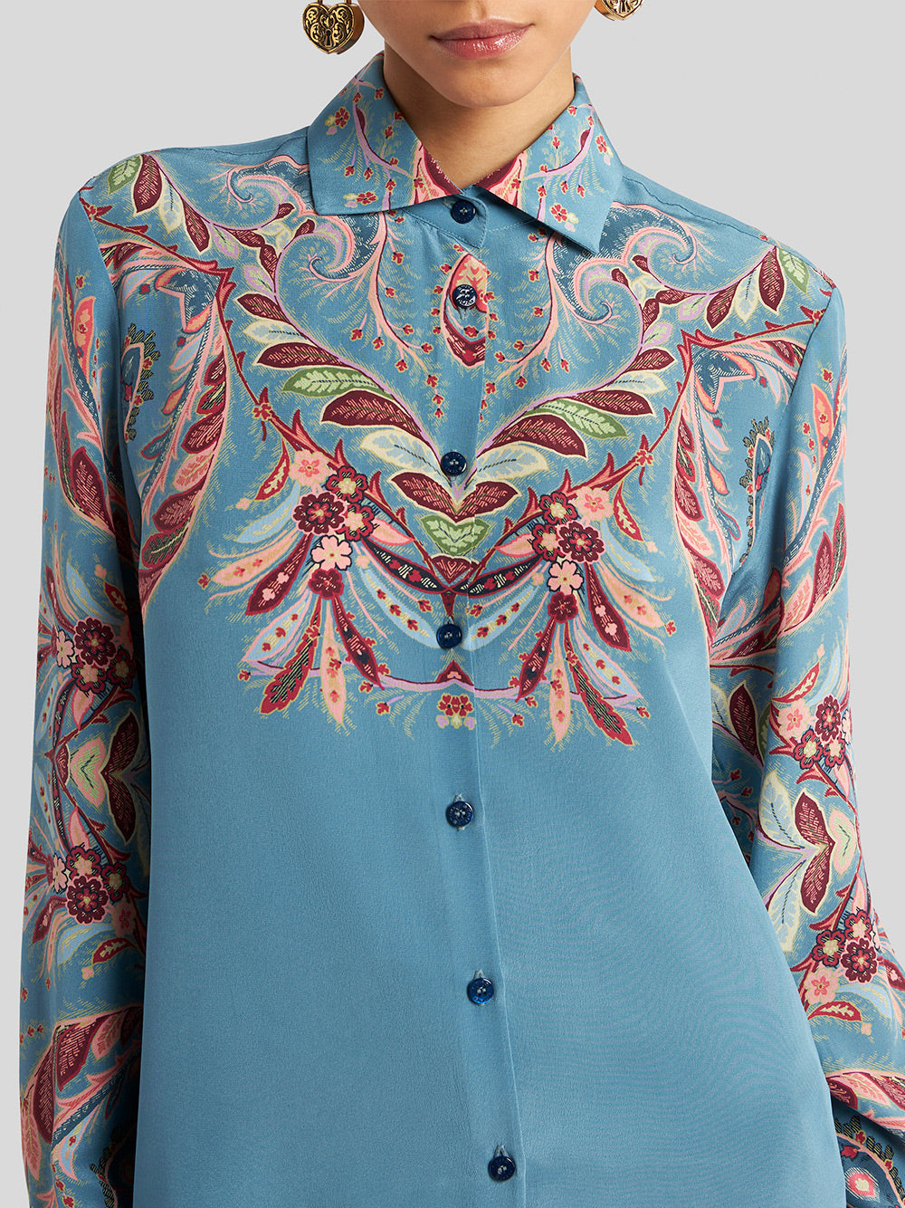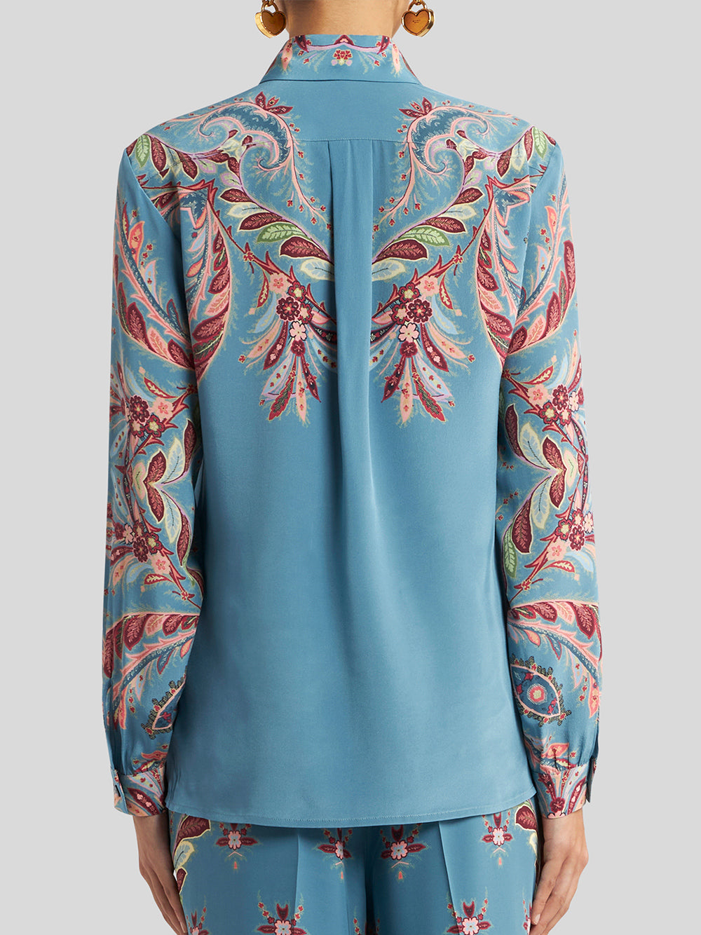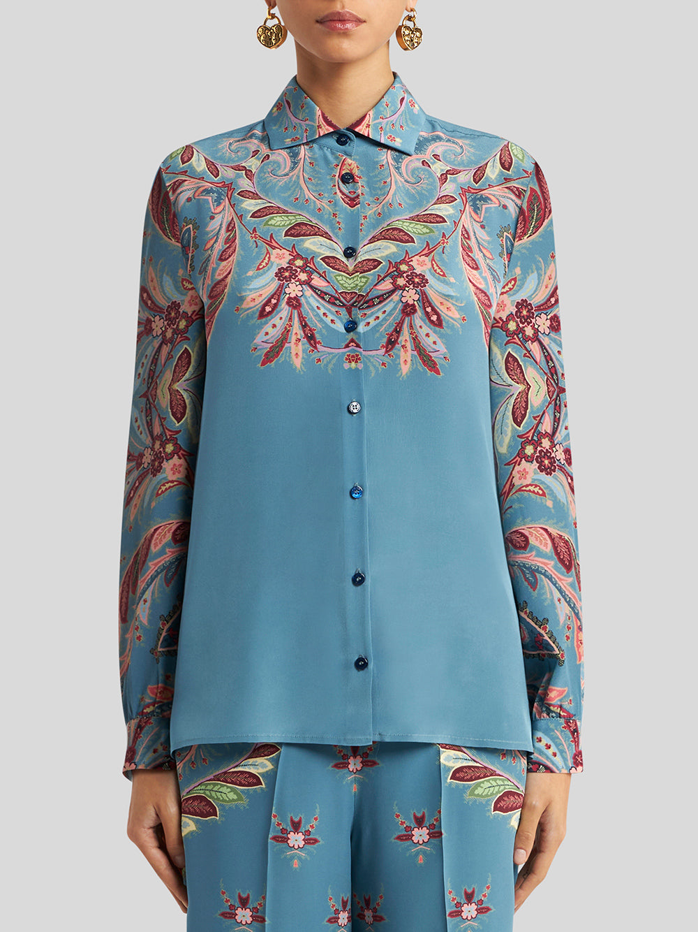The Paisley Silk Shirt by Etro is crafted from fluid silk satin and detailed with the house’s iconic paisley print at the collar. Designed to pair with the matching Floral Silk Flared Pants, it channels Etro’s signature mix of pattern and polish. -