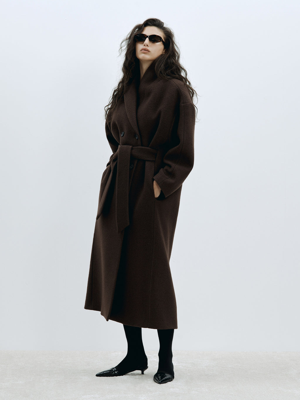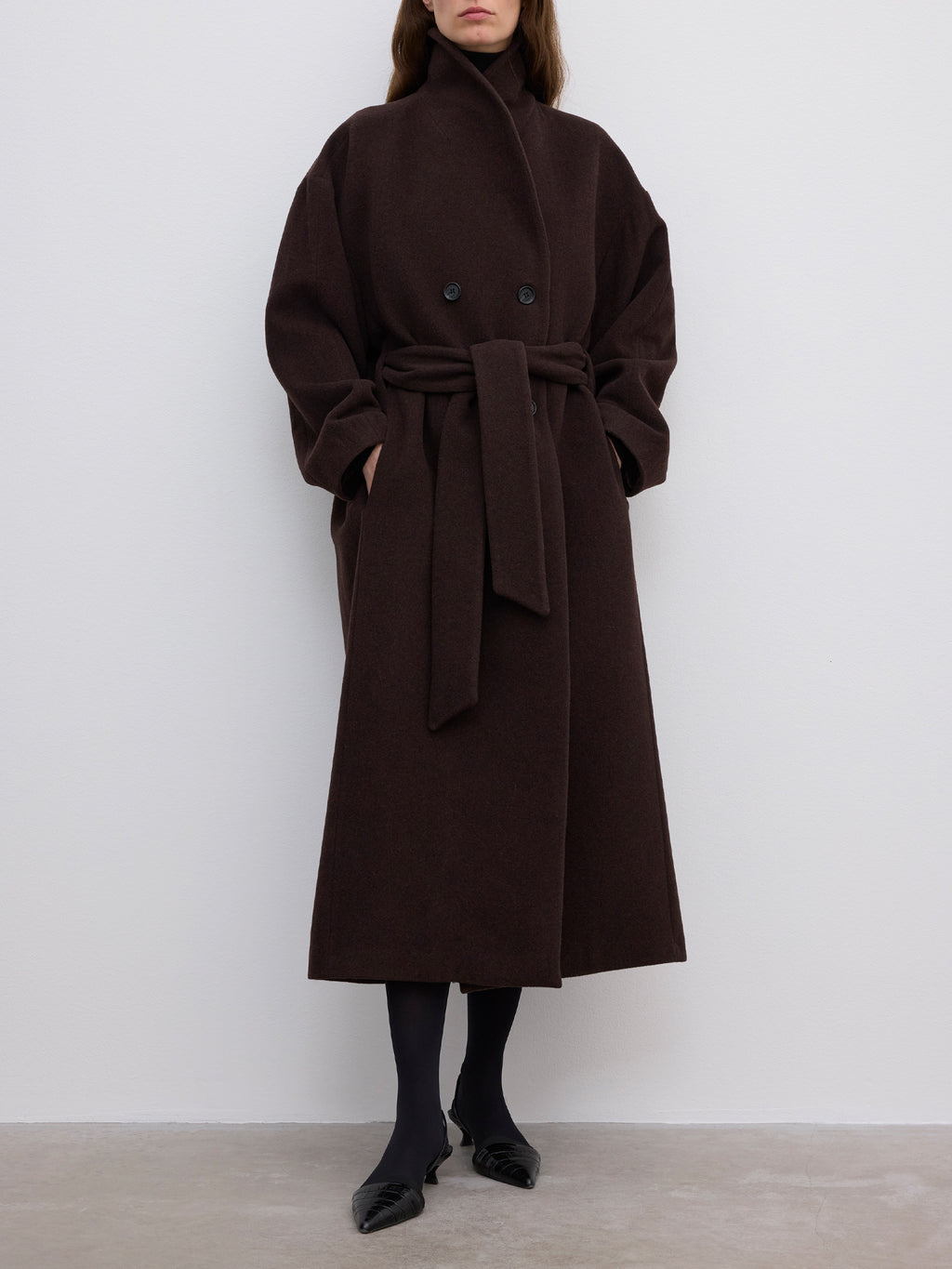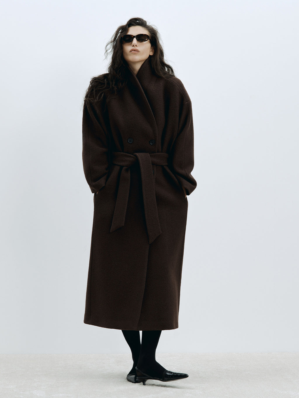 The Relaxed Wool Coat by House of Dagmar is a double-breasted, full-length design in warming wool. Cut to a cocoon silhouette with dropped shoulders, rounded sleeves, and a shawl collar, it’s detailed with in-seam pockets, a removable belt, and handstitched finishing. Fully lined.