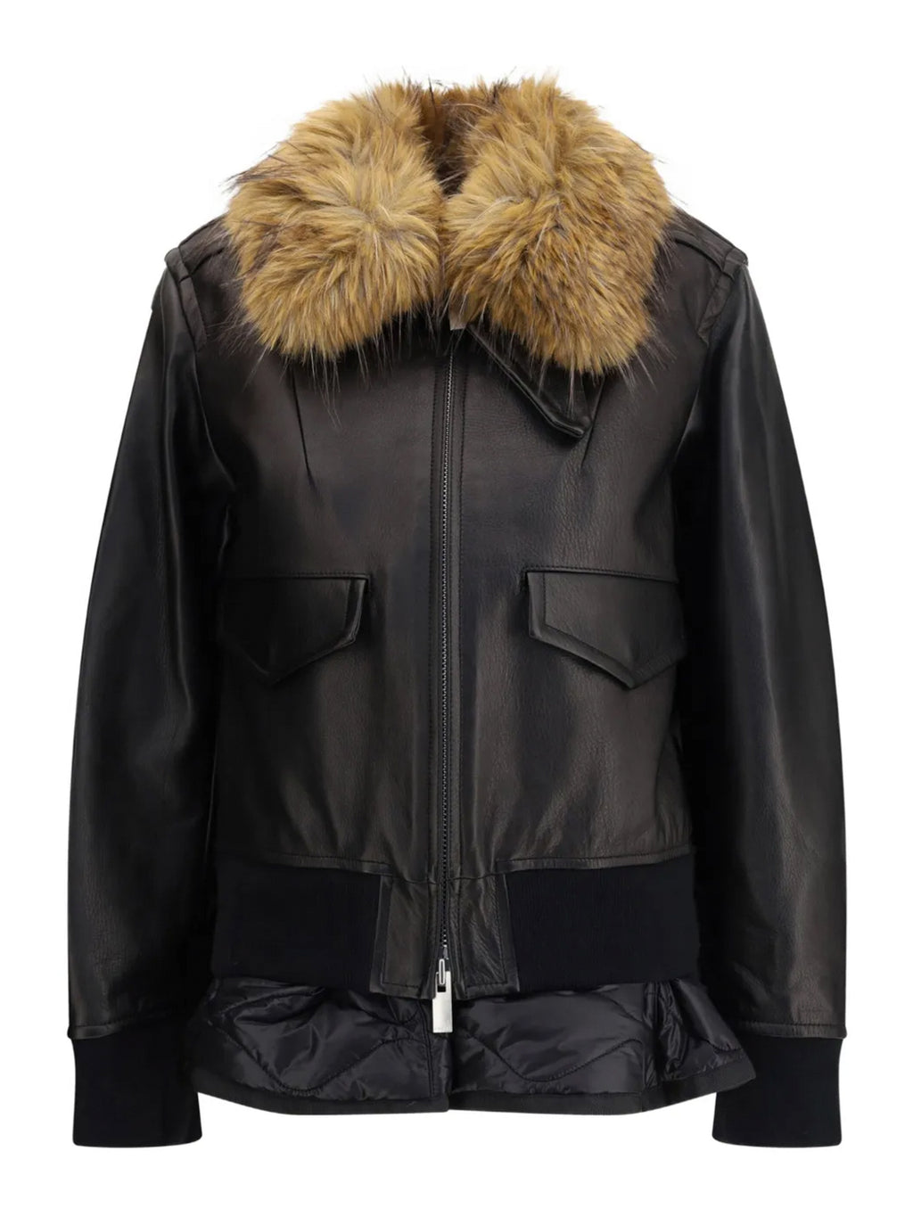DescriptionSacai’s Layered Leather Blouson redefines the classic aviator through the brand’s signature lens of contrast and construction. Crafted from supple cowhide, the jacket features front flap pockets, ribbed cuffs, and a paneled silhouette that reveals a fully lined interior. The result is a piece that feels both heritage and forward-looking—anchored in utility yet elevated by design.