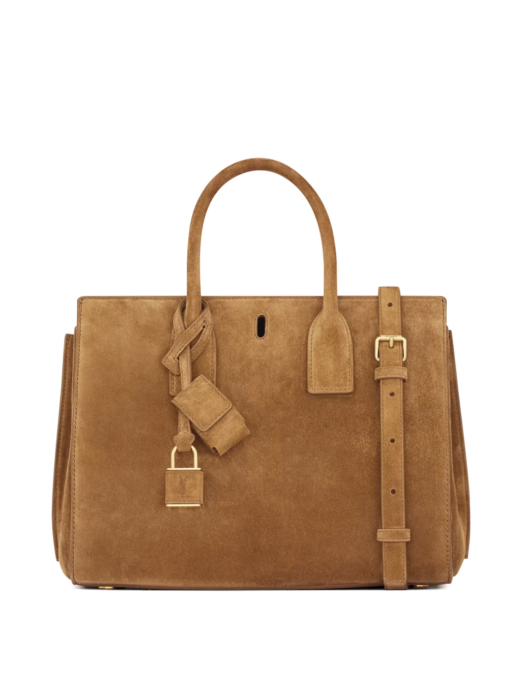 Saint Laurent’s Sac De Jour reintroduces the iconic handbag in a sleek East/West format for a modern update. Crafted with structured lines, it features top handles, expandable accordion sides, a toggle hook closure, and a detachable leather-encased CASSANDRE padlock. Interchangeable suede and canvas straps offer versatile carry options, making this an effortless choice for everyday styling and travel alike. -