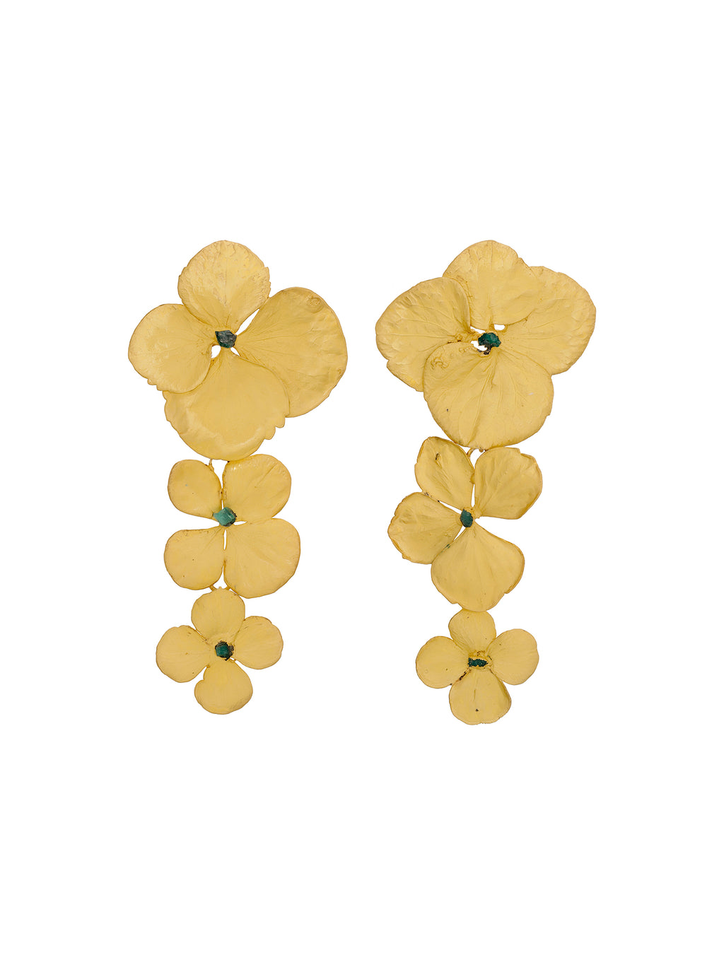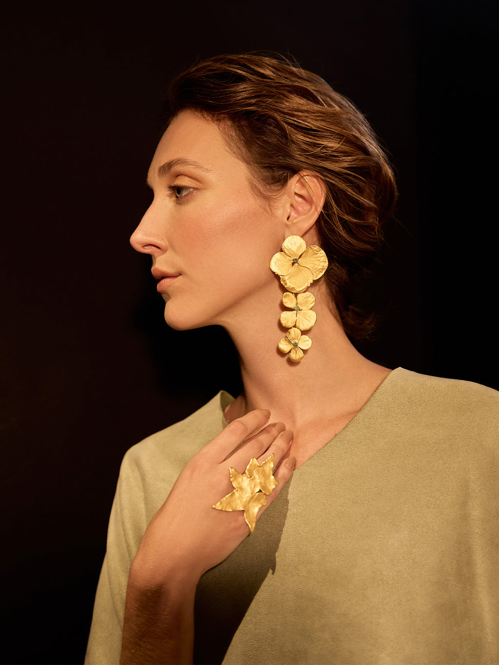 ALMA’s Triple Hydrangea and Rough Emerald Earrings immortalize three natural hydrangea blooms in graduated sizes, each preserved through the brand’s signature mold-free technique and dipped in 24k yellow gold. The flowers retain their organic textures and unique imperfections, ensuring no two pieces are alike. At the center of each bloom rests a rough emerald, adding a natural accent to the golden petals. This piece is ineligible for promotional discount. -