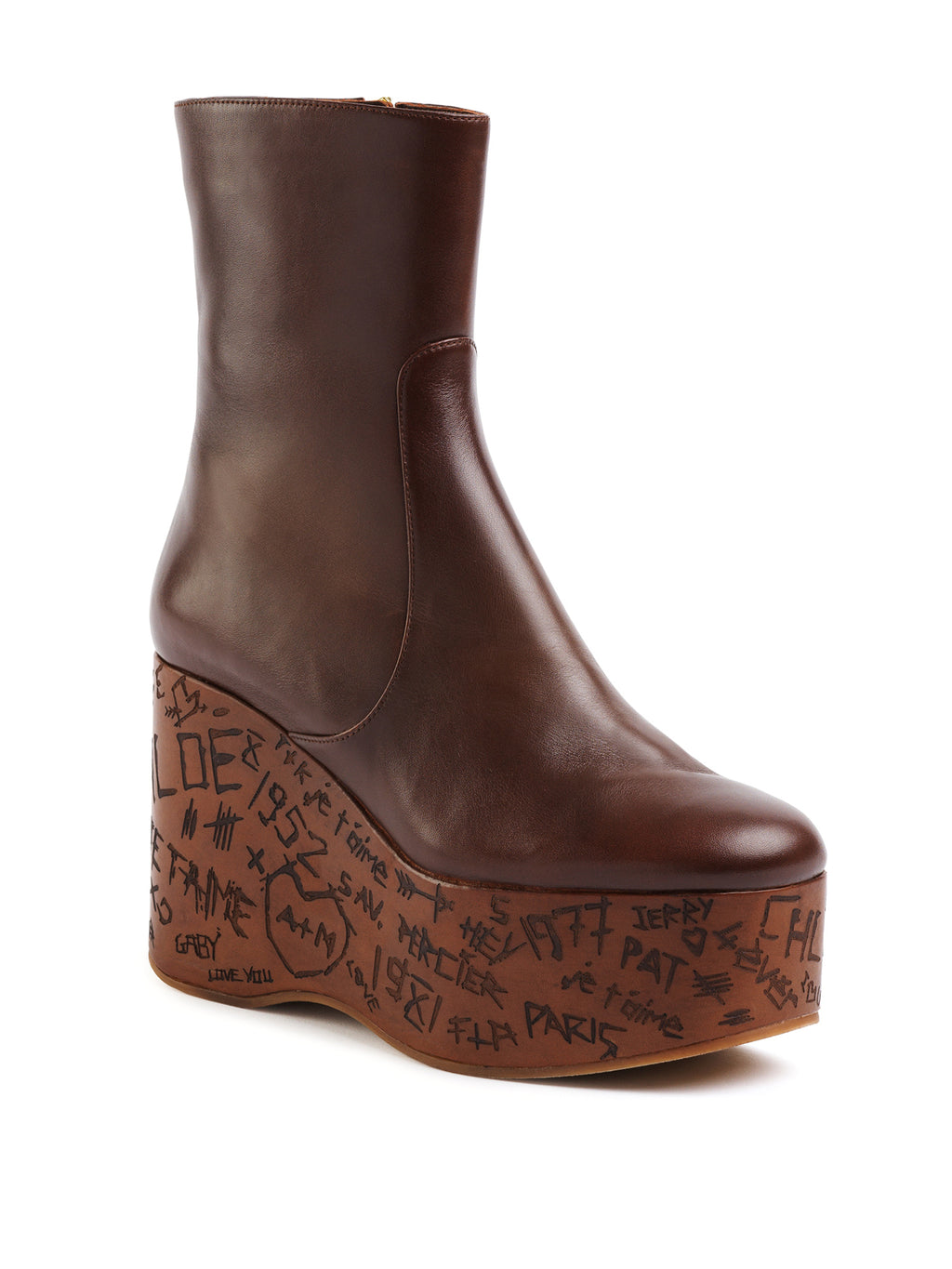 Chloé's Maxime Wedge Ankle Boots are crafted from shiny calfskin and set on a wood-effect platform, blending statement style with Chloé’s heritage details, including subtle engraved motifs reminiscent of love notes on trees. -