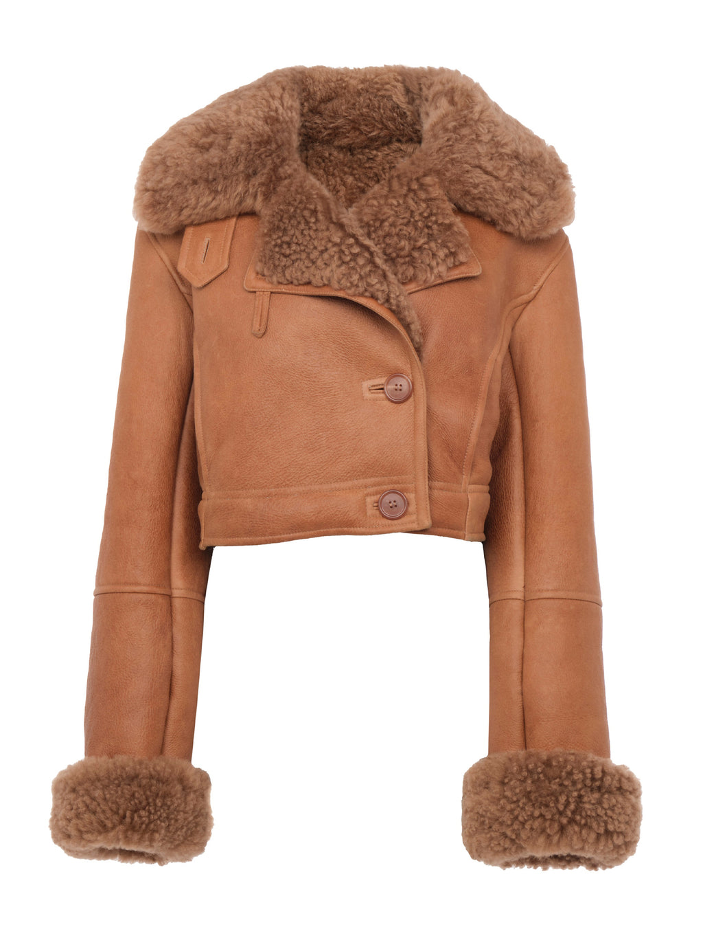 The Cropped Boxy Leather Jacket by Chloé is crafted from Icelandic wooled sheepskin in amber brown with plush shearling trim. Designed with a high neck, shoulder tabs, and engraved horn buttons.