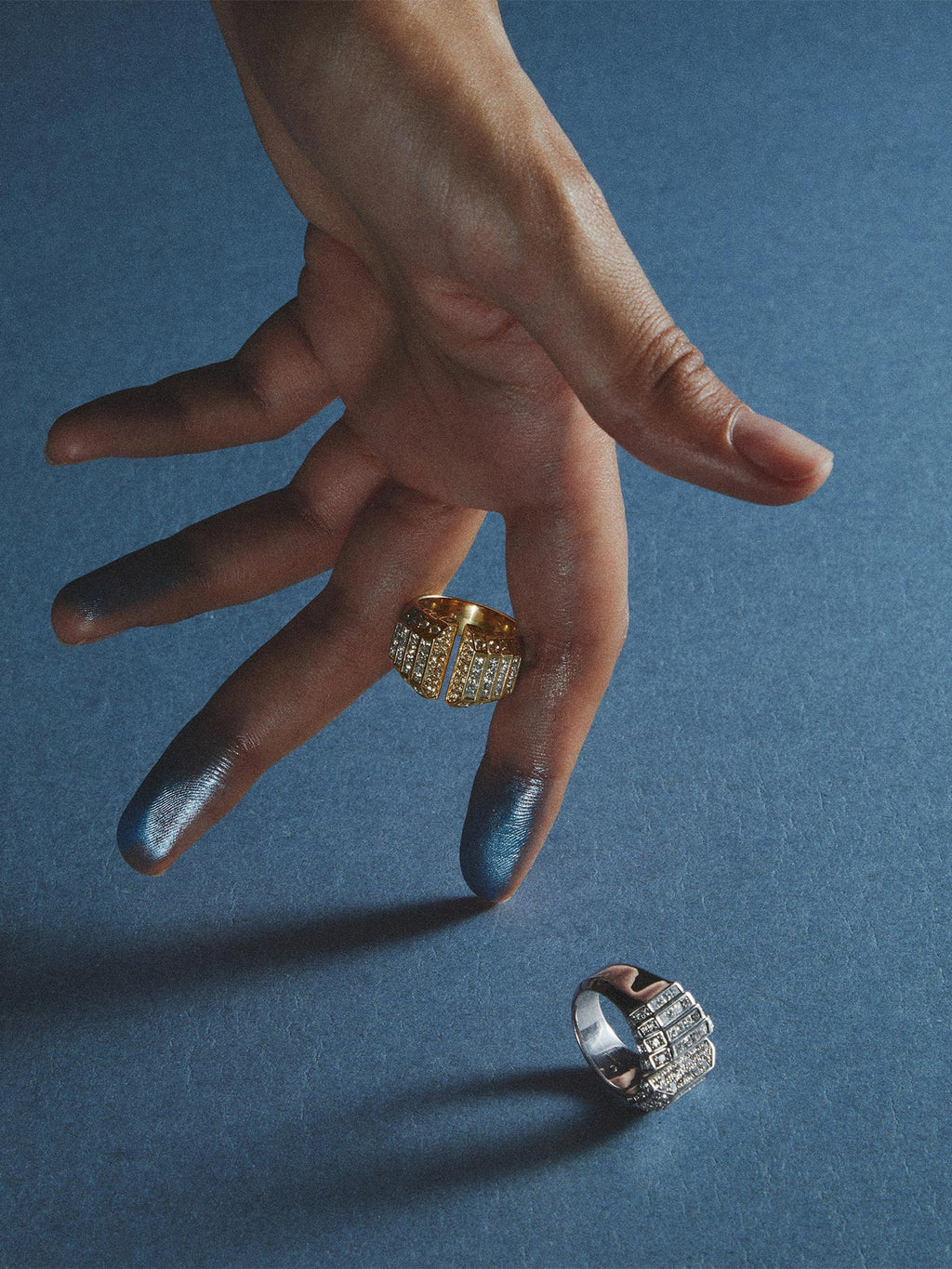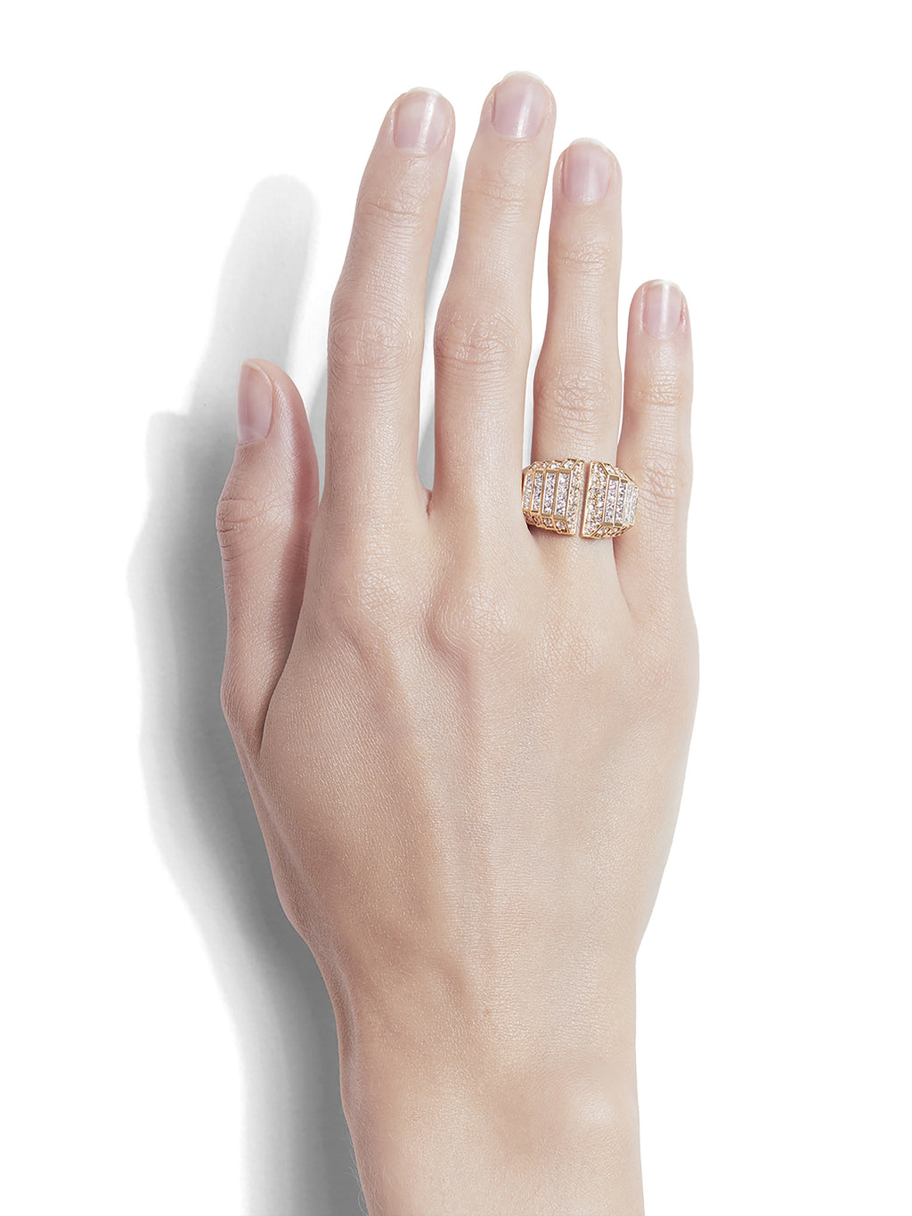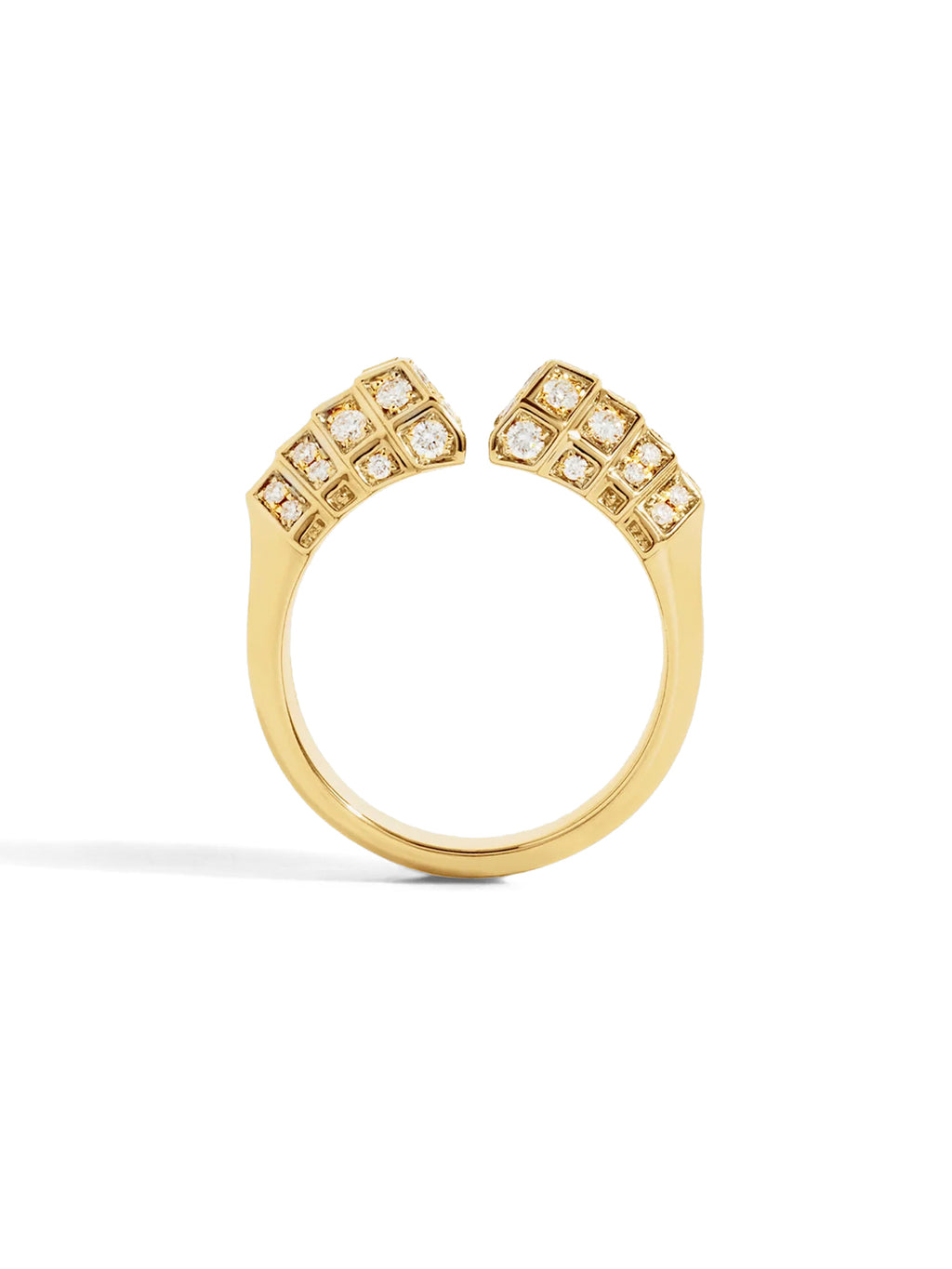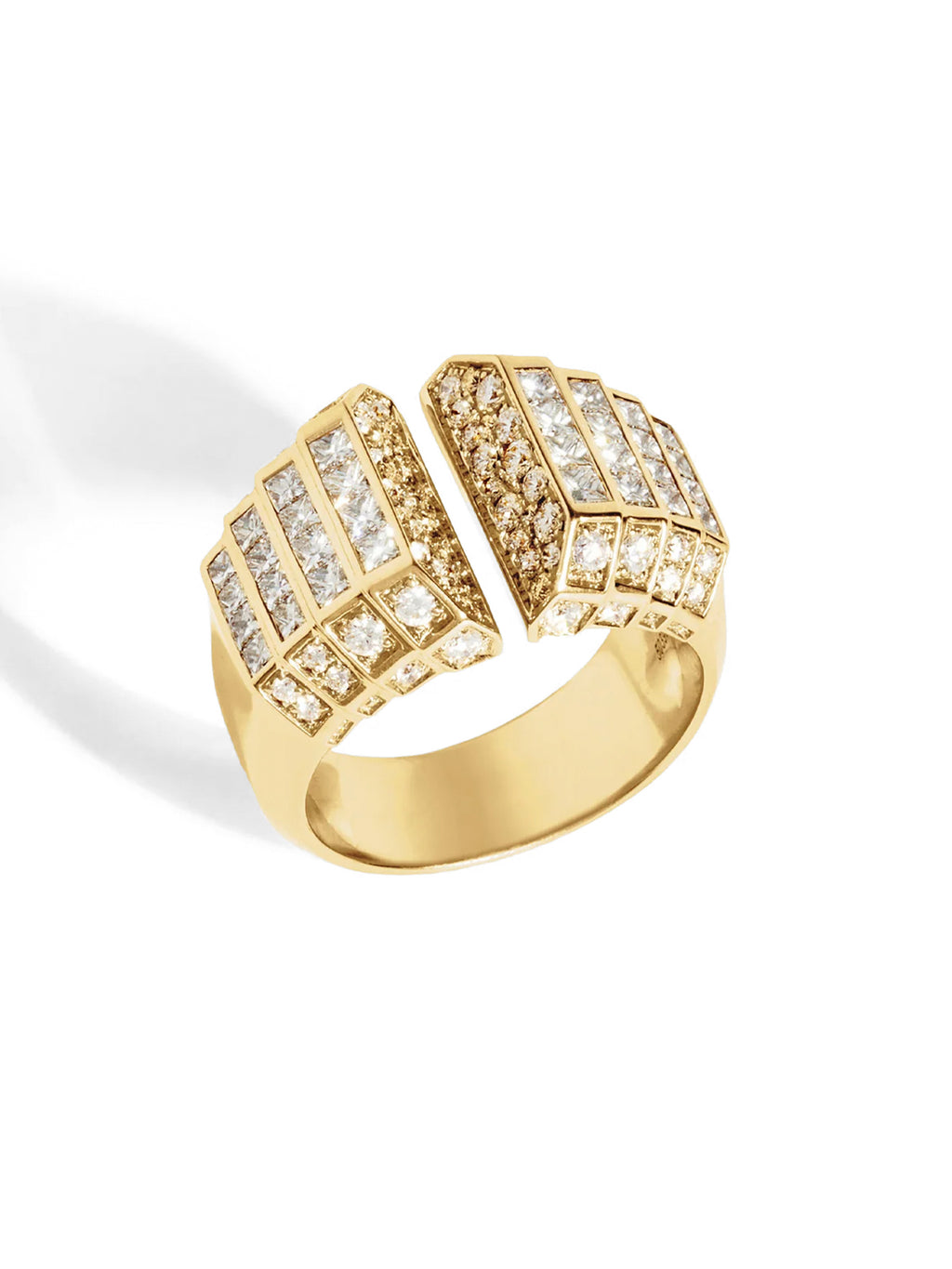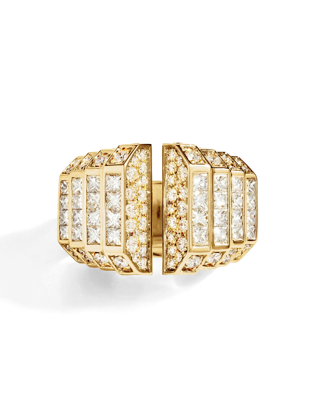 The Meaningful Ring by STATEMENT is crafted in 18k yellow gold and pavé-set with 100 brilliant-cut and princess-cut diamonds. Part of the Meaningful collection, this ring creates an architectural dialogue where the symbolism of the stones meets the meticulous work of the gold, with over 70 hours devoted to its creation. -
