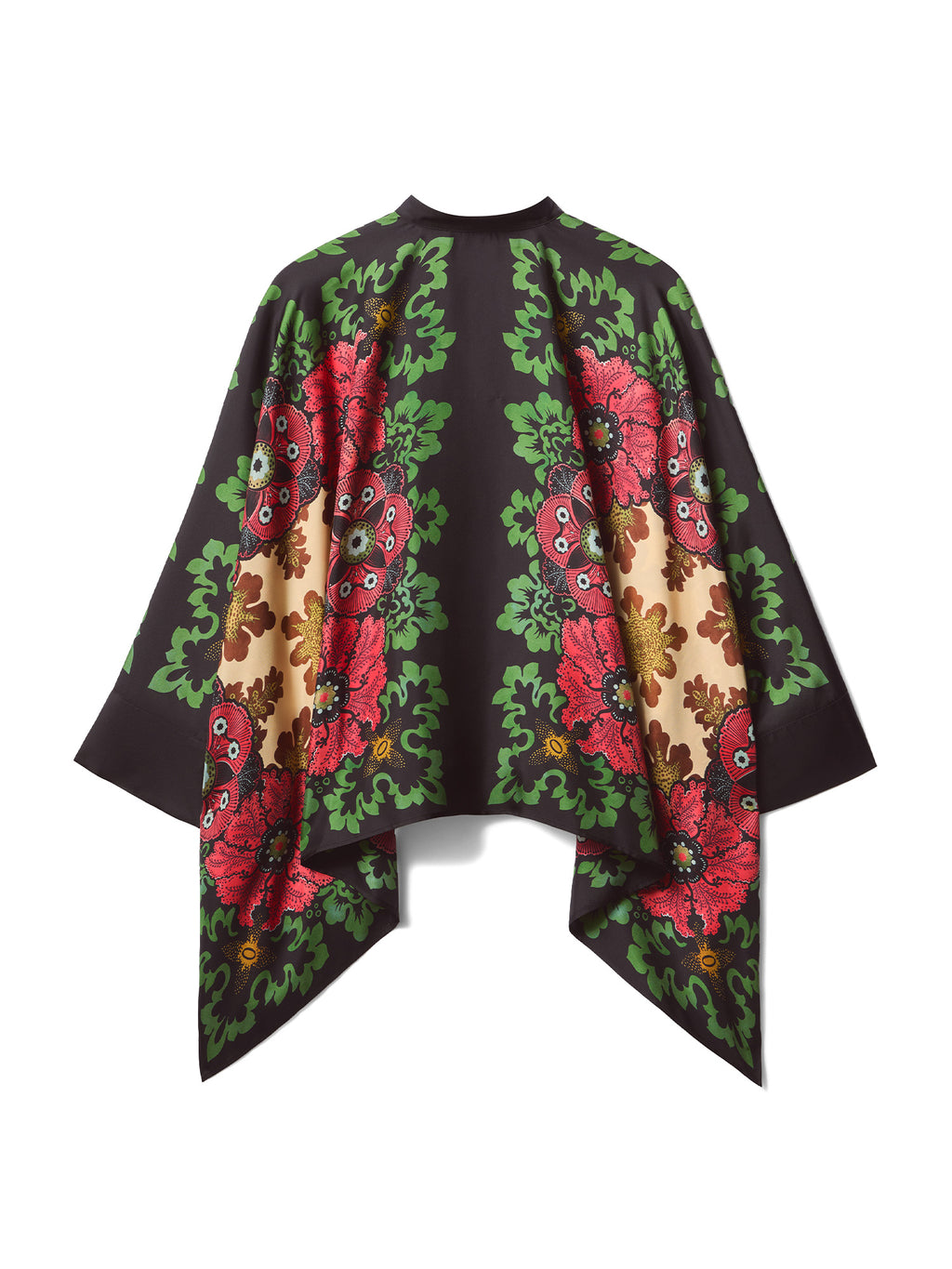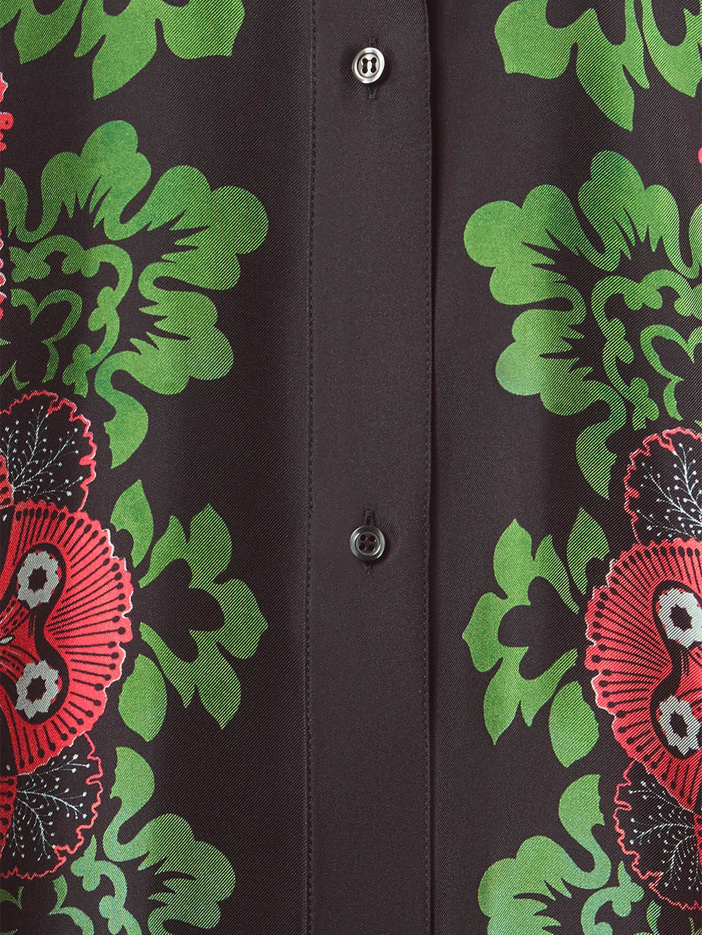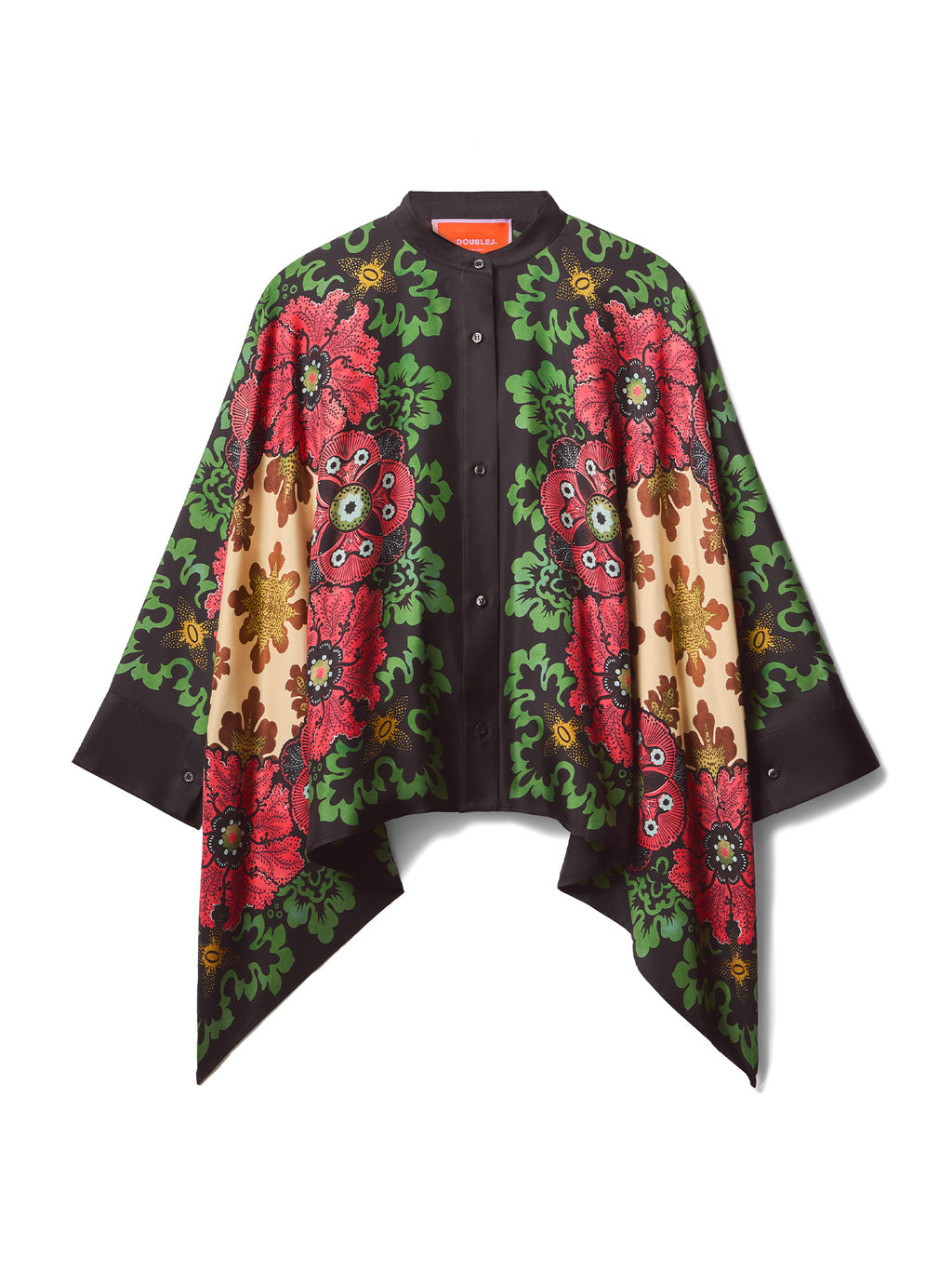 Foulard Shirt by La DoubleJ transforms an Italian-made silk scarf into a waterfall-fit shirt with a Korean collar and draped sleeves. Hand-placed blooms on glossy black silk make it versatile for pairing with jeans for daytime or matching Palazzo Pants for a polished evening look. -