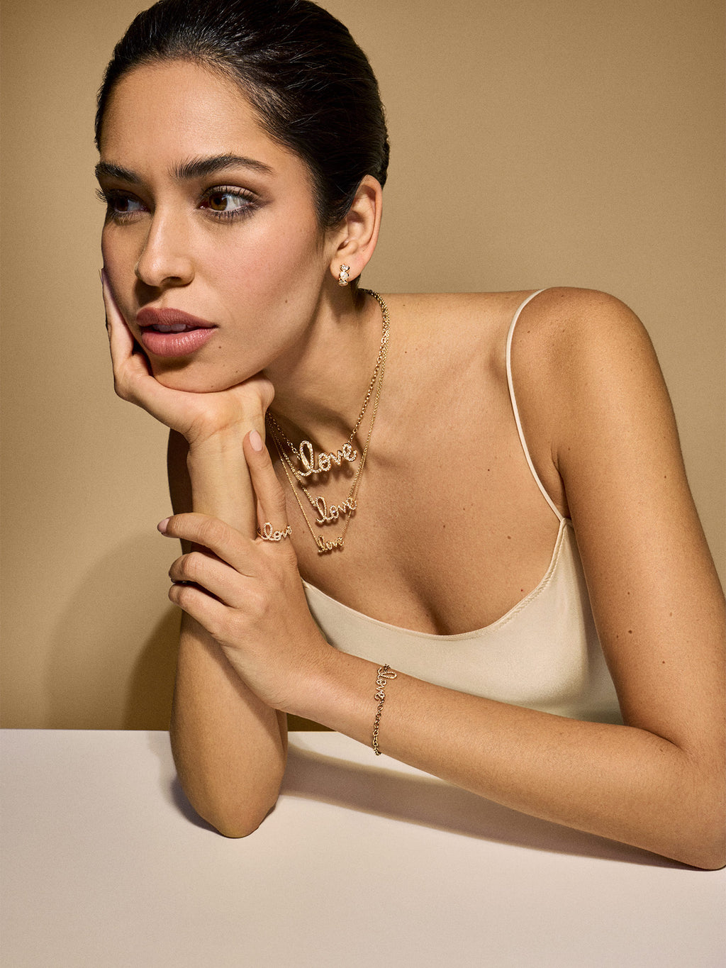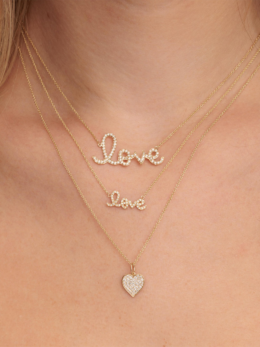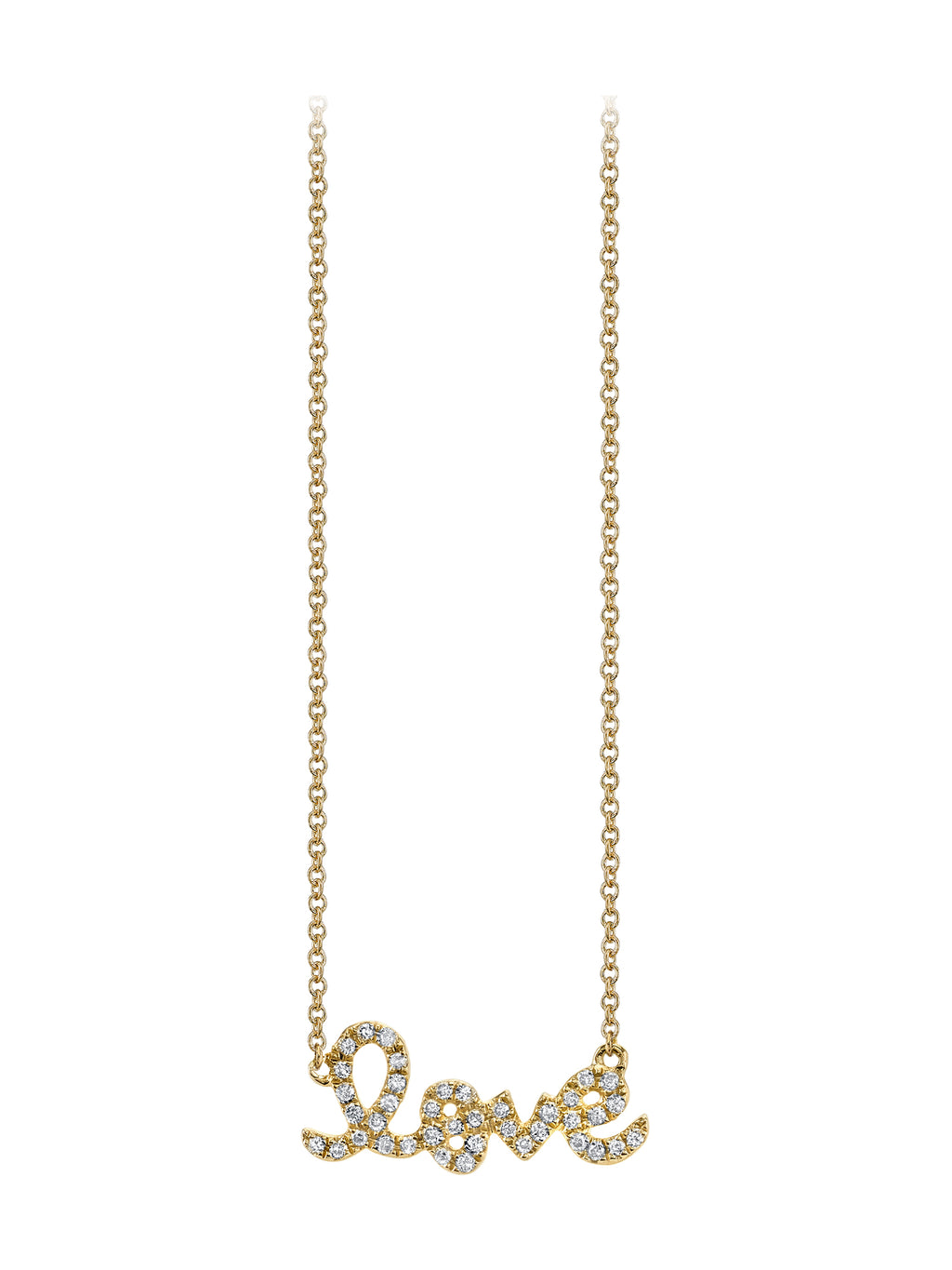 The Small Love Necklace by Sydney Evan is crafted in 14k gold with pavé diamonds spelling out “Love” in the brand’s signature hand-drawn script. A delicate piece that captures affection and elegance. This item is ineligible for promotional discount. -