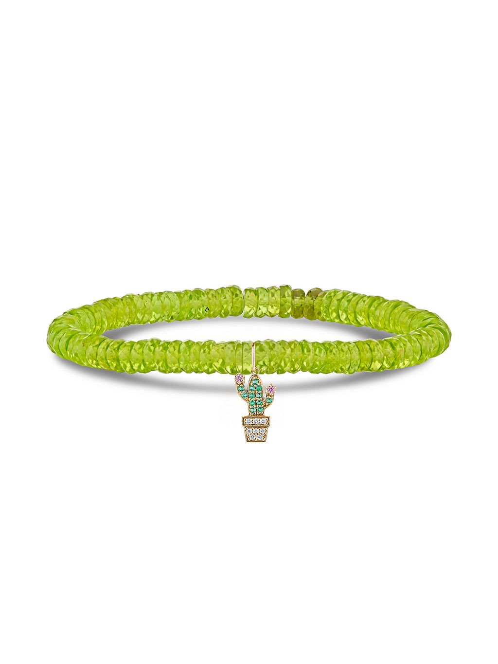 The Small Potted Cactus Charm on Peridot Beaded Bracelet by Sydney Evan features vibrant green peridot beads strung on a stretch cord, accented with a pavé cactus charm set with white diamonds, pink sapphires, and emeralds. Inquire for custom sizing requests. This item is ineligible for promotional discount.