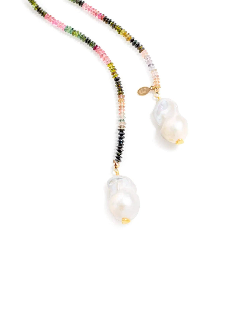 - Composition: 4MM Ombre Blue Multi Smooth Tourmalines, 18K Gold Diamond Accents, AAA Baroque Freshwater Pearls, Heart accent Head Pins