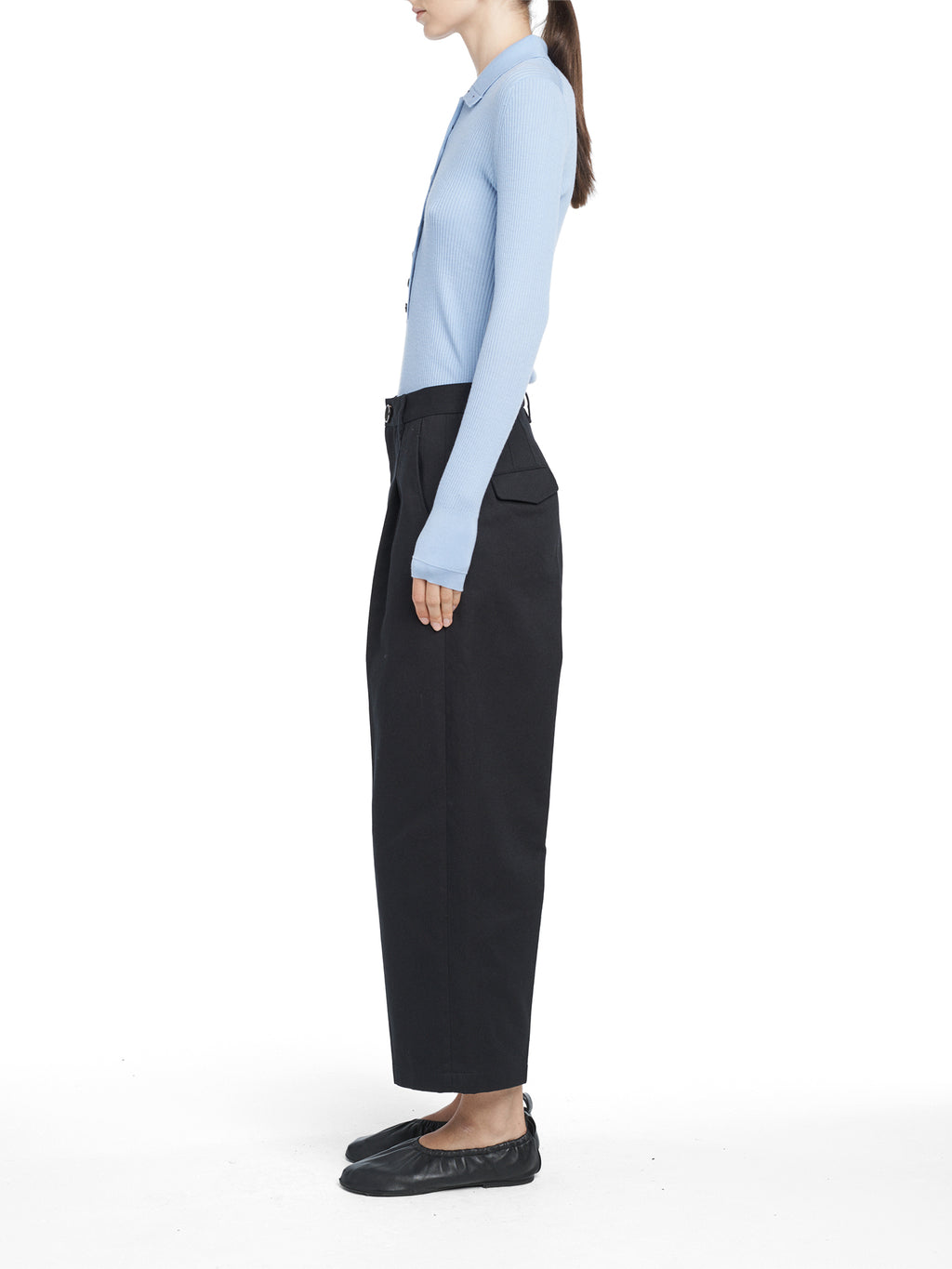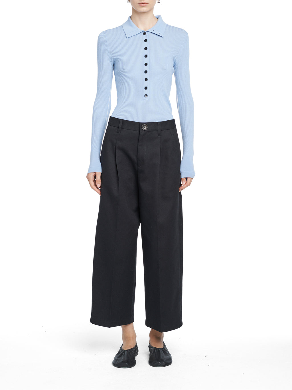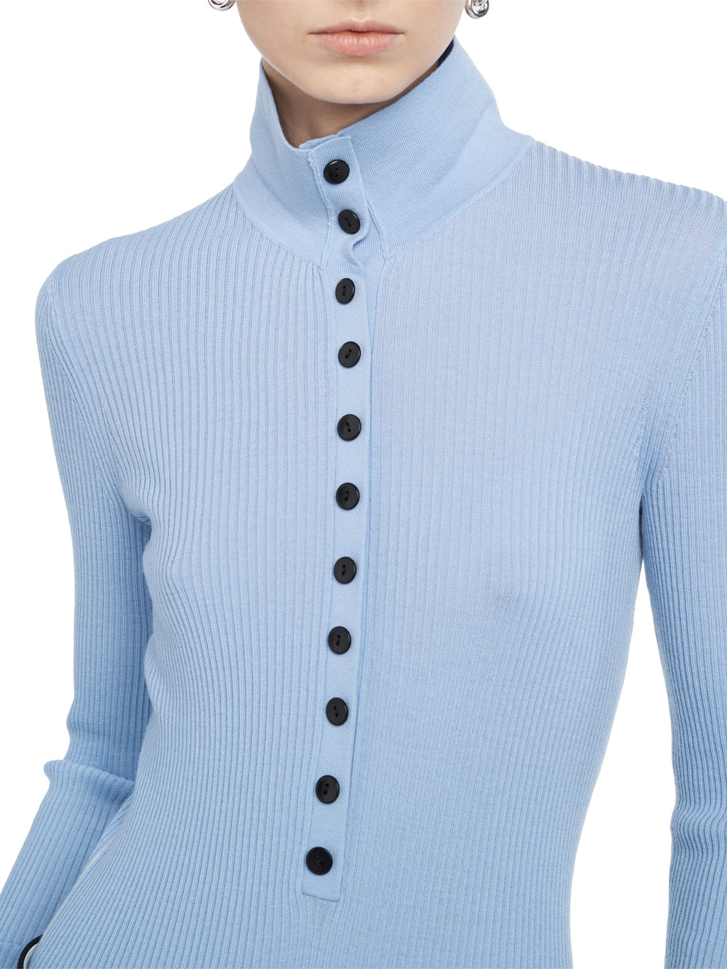 The Tiny Button Polo by Maria McManus is crafted from soft merino wool for a close-fitting, flattering silhouette. The buttoned neck can be styled as a classic polo collar or fully buttoned for a turtleneck effect, making it versatile for layering or wearing alone during colder months. -