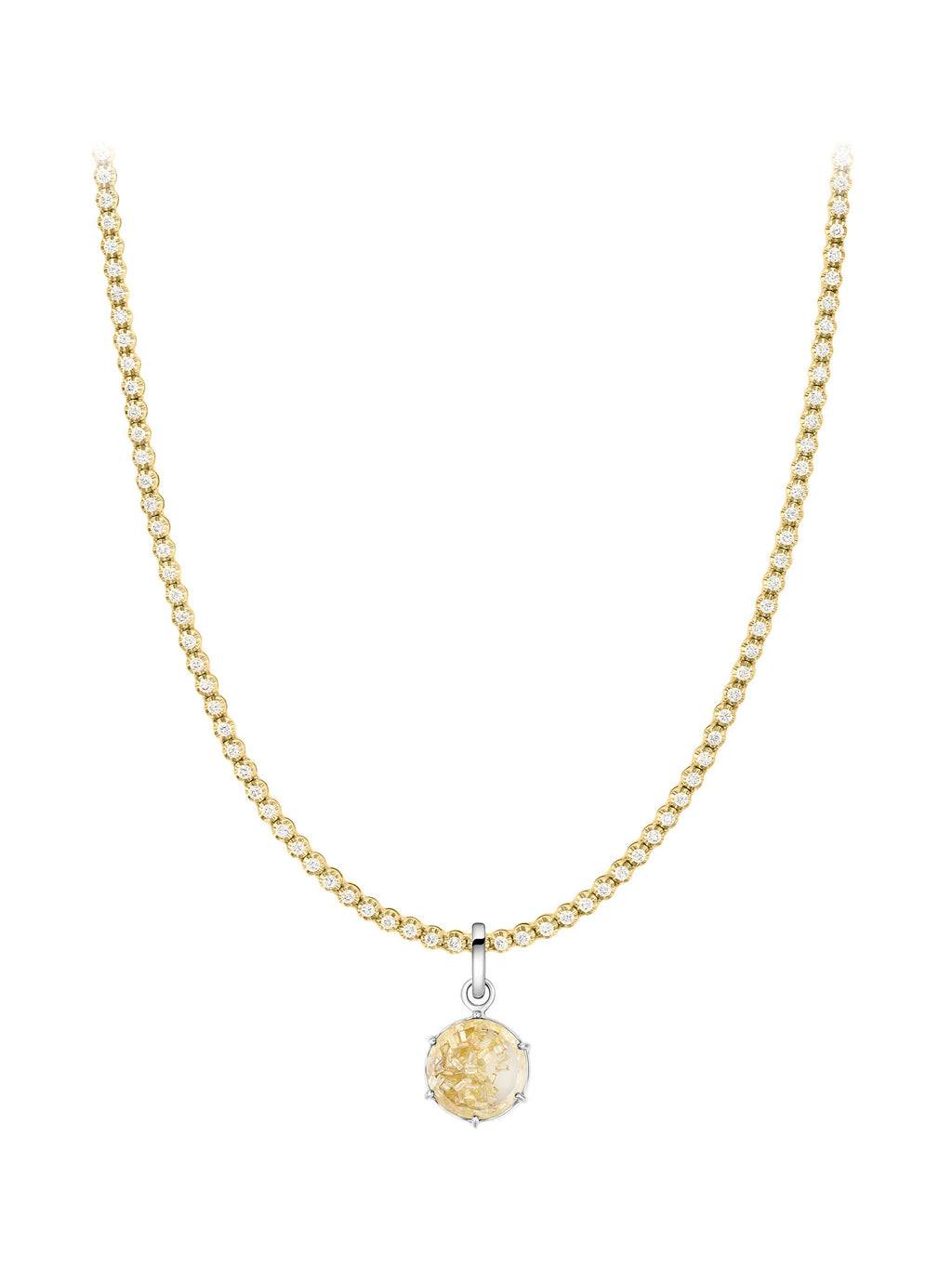 The Fancy Yellow Diamond Charm by Beatriz Werebe is set in 14k white gold and filled with yellow diamonds that move freely within the pendant. Style it with a Beatriz Werebe chain or pair it with a simple one from your own collection. This piece is ineligible for promotional discount. -