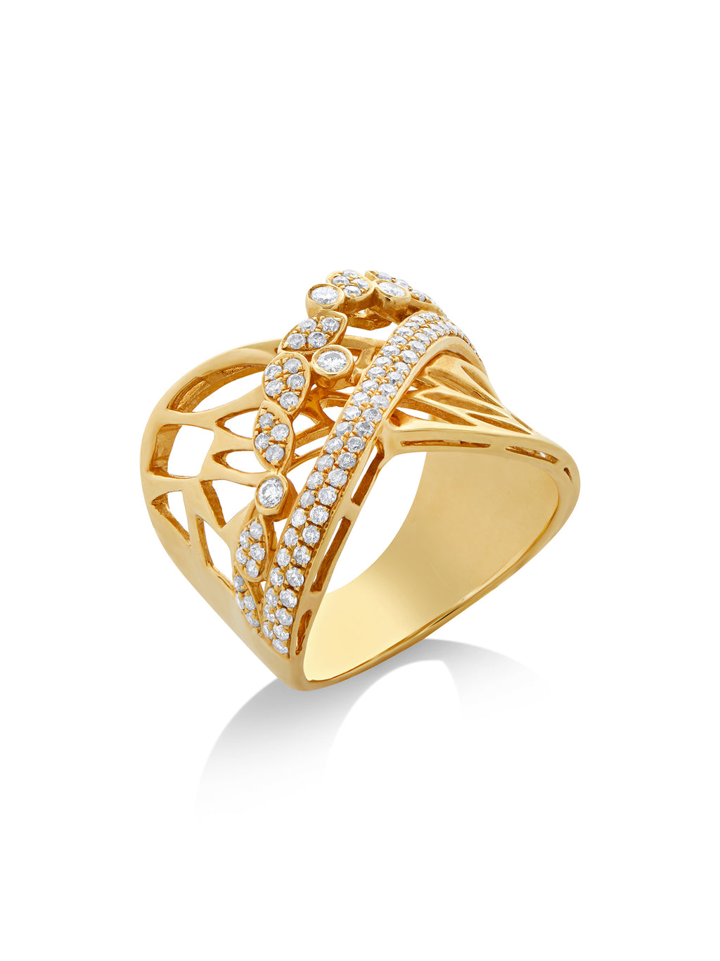 The Jungle Ring by Gaya is crafted in 18k yellow gold and illuminated with 0.69 ct of white diamonds. Its three-dimensional form balances geometric precision with organic flow, echoing the vitality of the rainforest that inspires it. A sculptural piece that celebrates Mother Earth’s creativity.