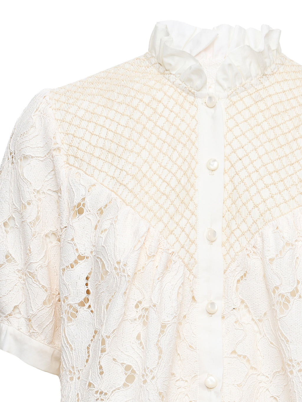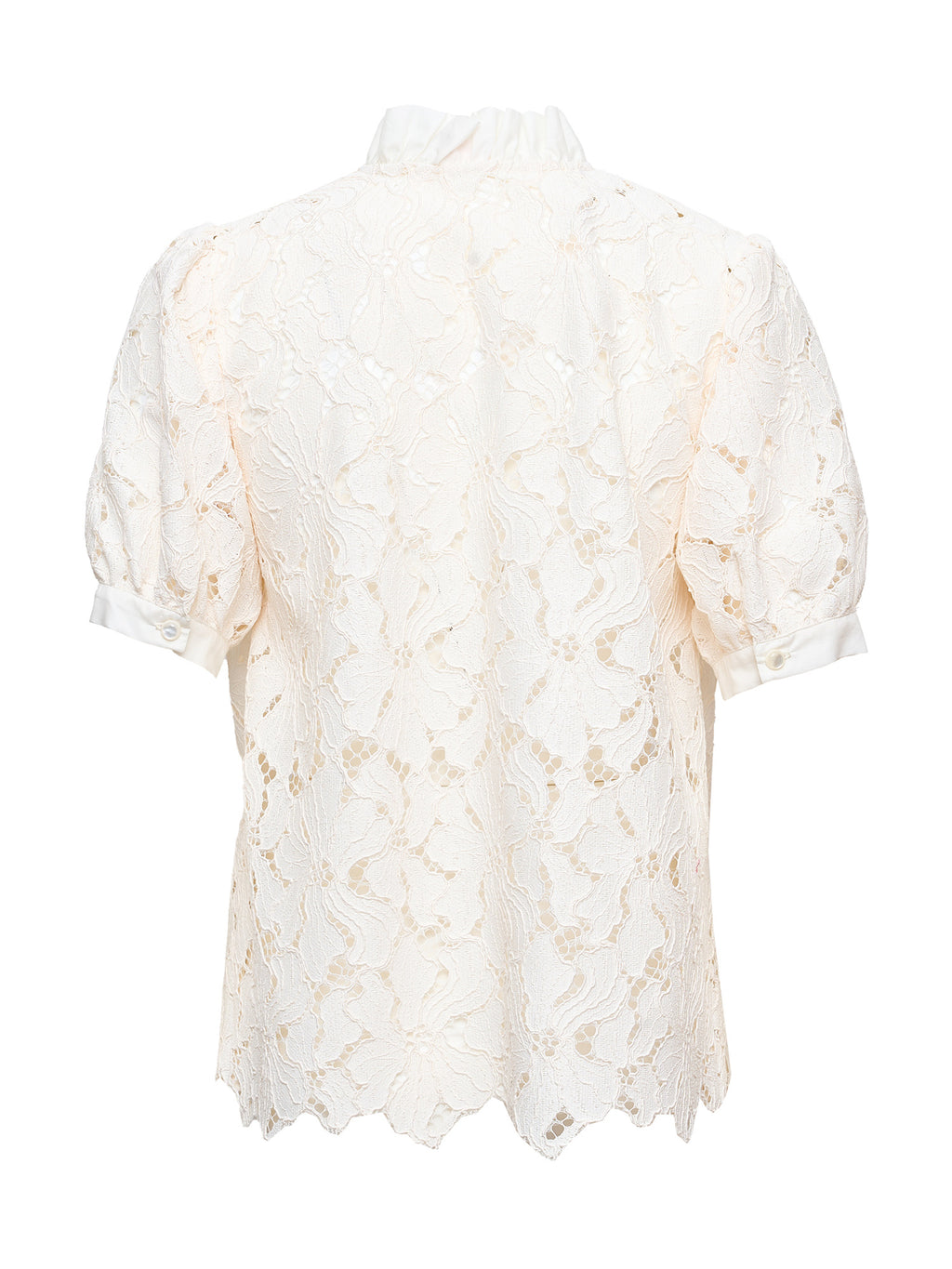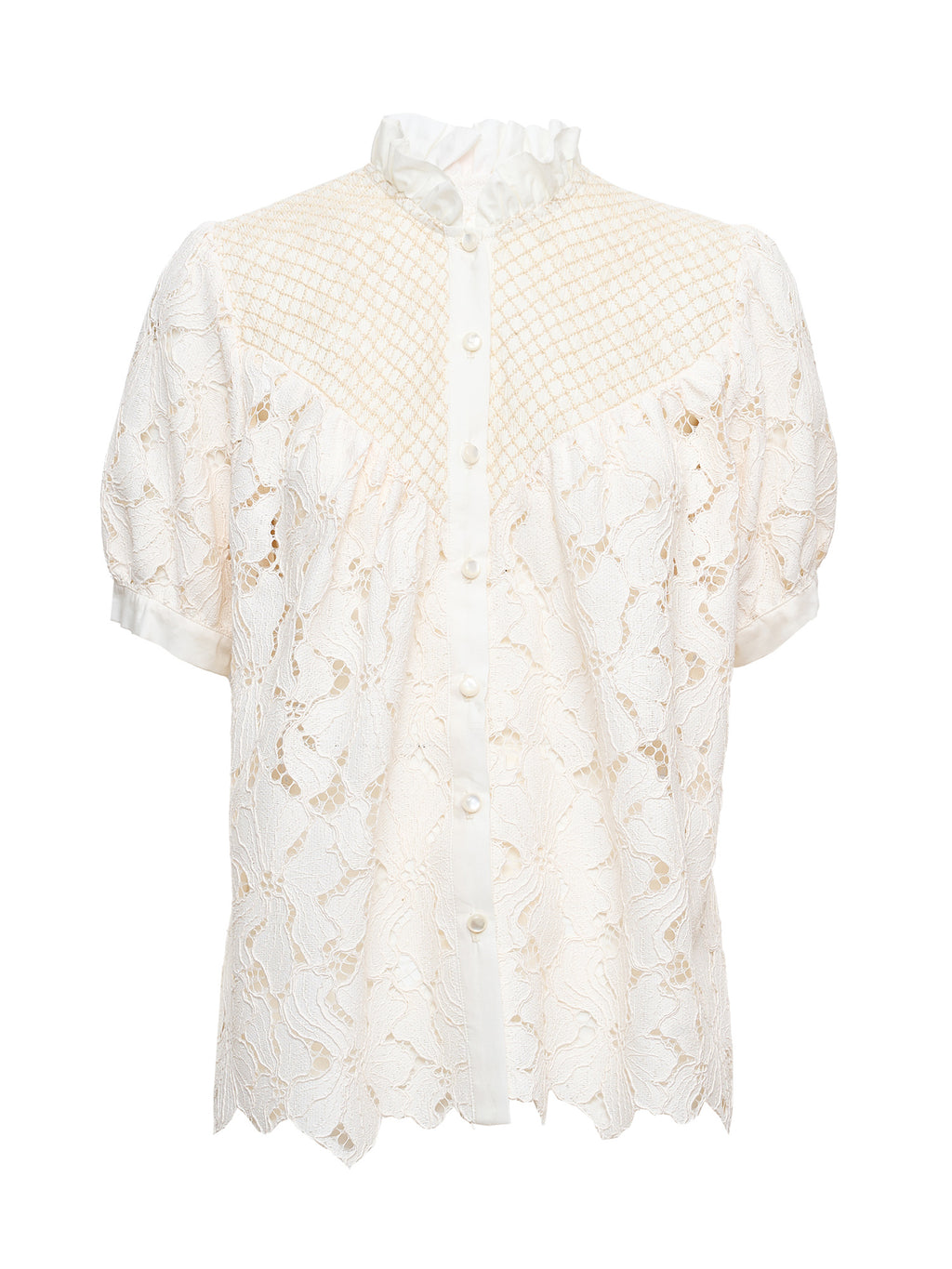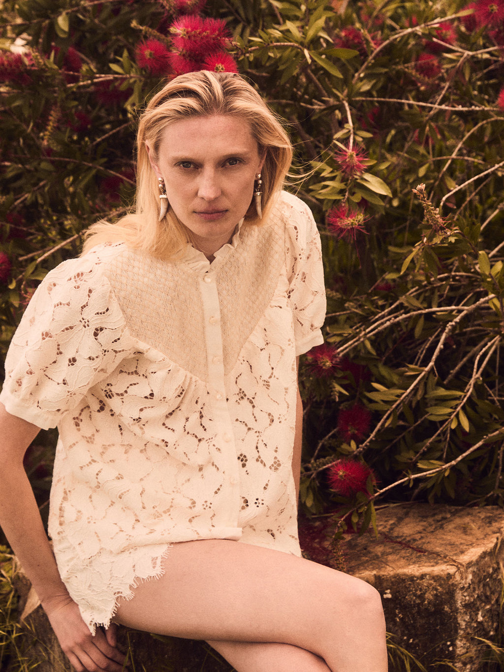 Loretta Caponi’s Iole blouse is a refined year-round staple crafted with romantic precision. Designed with a ruffled cotton neckline and a guipure lace yoke, it balances texture and delicacy with ease. Puffed sleeves add soft volume, completing a silhouette that feels both timeless and feminine. Wear it with the matching Cipro pants for a coordinated look.