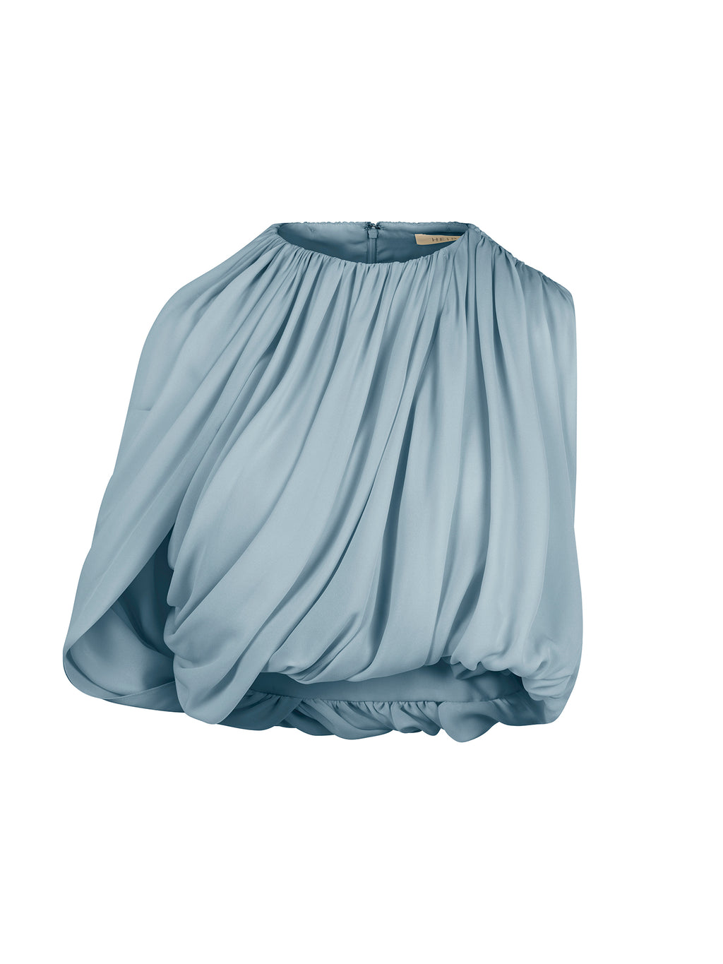 Heirlome’s Marie Top is an asymmetrical design in silk double georgette, shaped with a soft, continuous drape. Shirred fabric wraps around the left arm and meets the back hem, creating a subtle sweep around the body. The silhouette is fully lined in silk and finishes with a center-back zipper that maintains a clean, refined line.