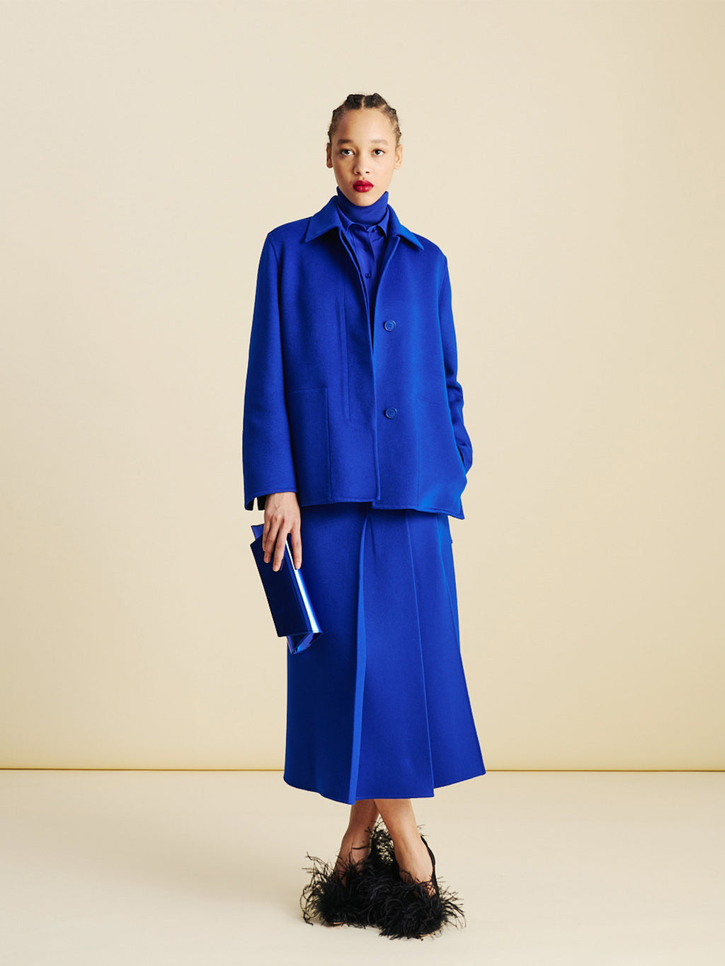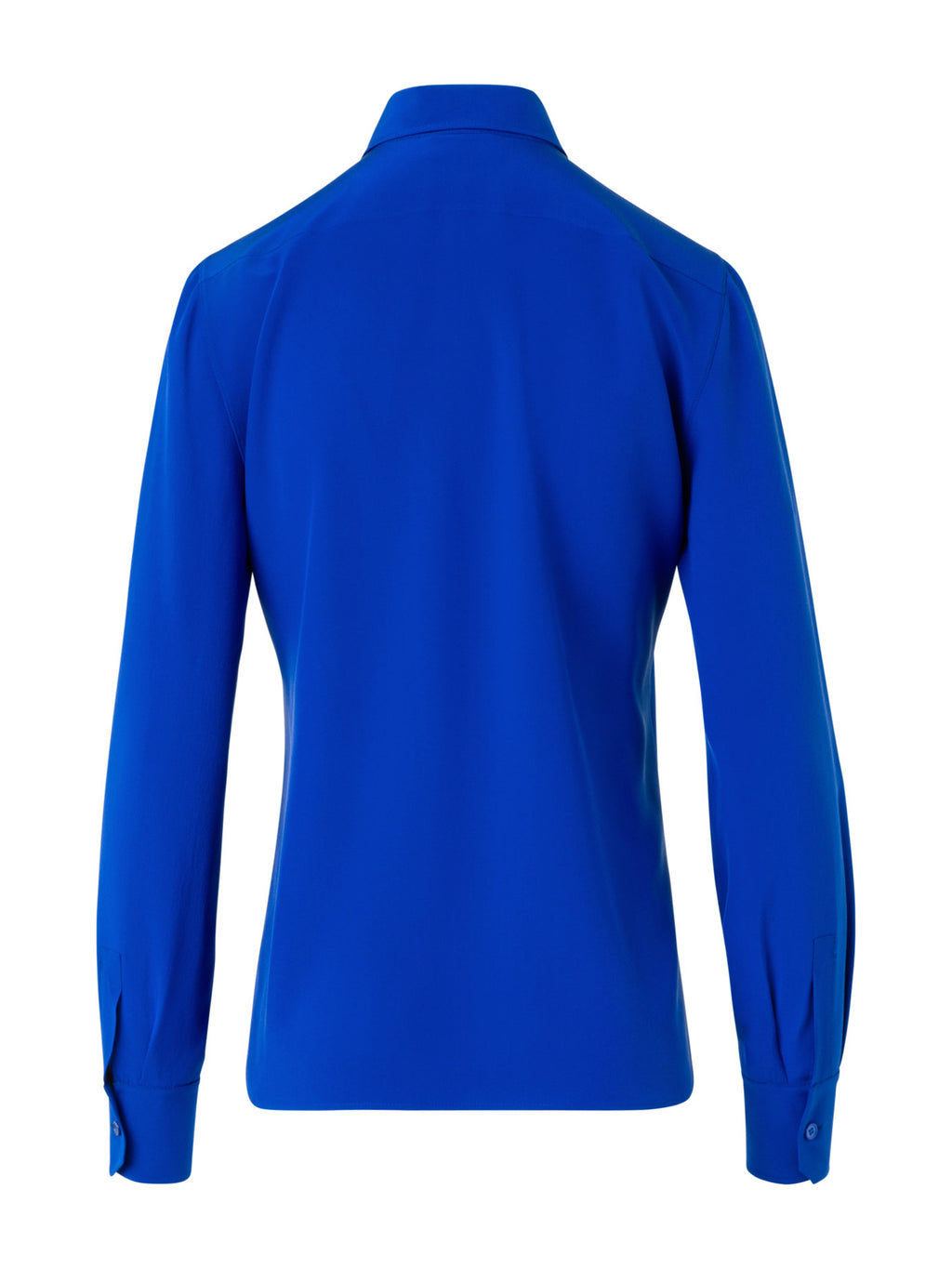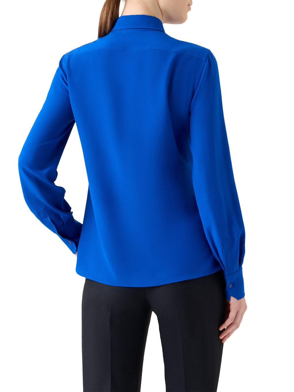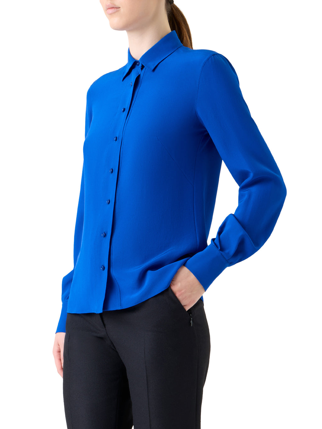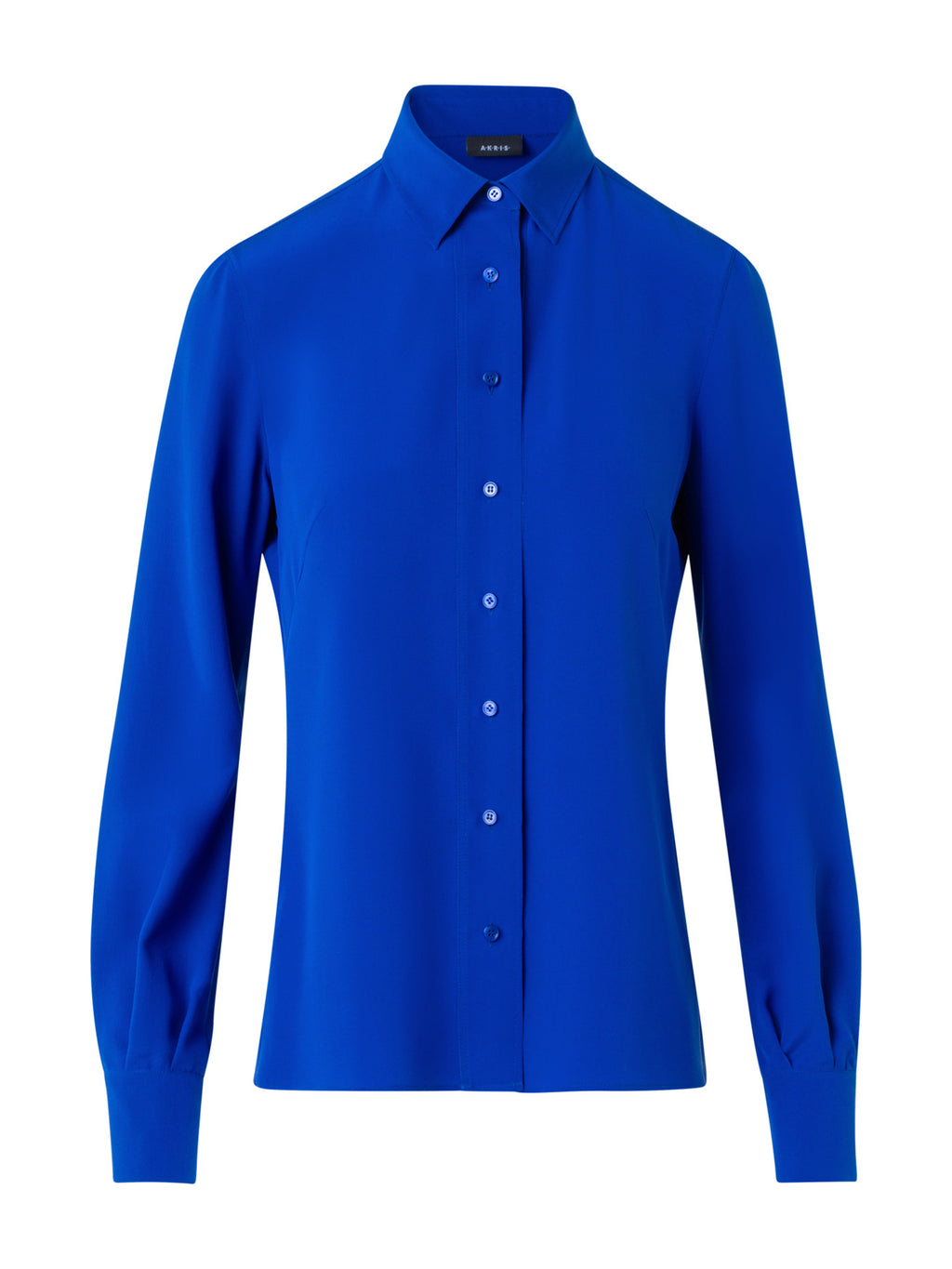 This blouse by Akris is a classic royal blue button-down crafted in silk crepe. Designed with a shirt collar, long sleeves, button closure, and side slits, it offers a refined, versatile layer.