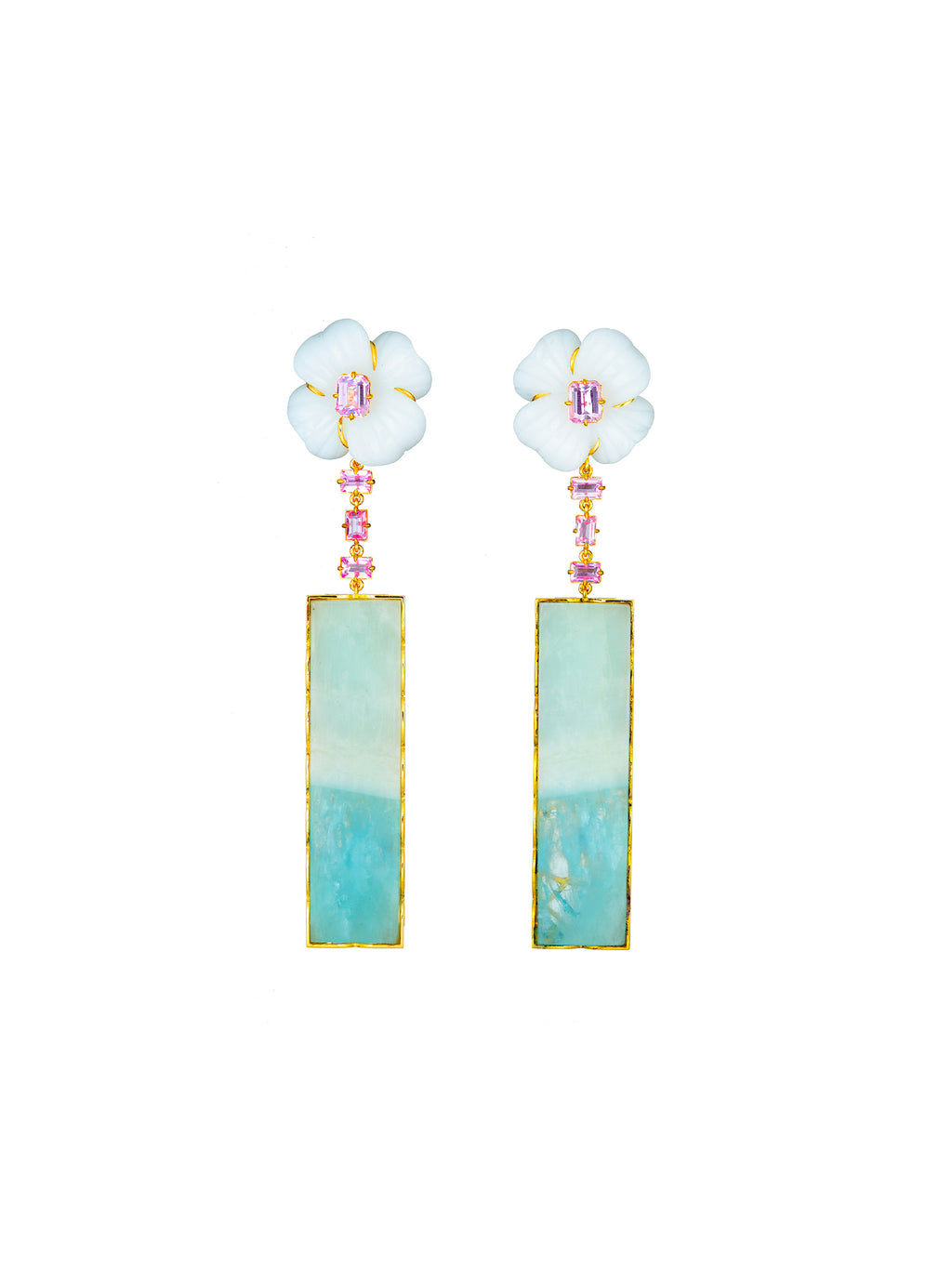 The Blue Aquamarine Earrings on White Agate Flower with Pink Sapphires by GuitaM showcase a striking play of color and form. Feminine shapes and tones of pink, white, and blue come together in this bold statement piece, set in 18k yellow gold. A one-of-a-kind design. -