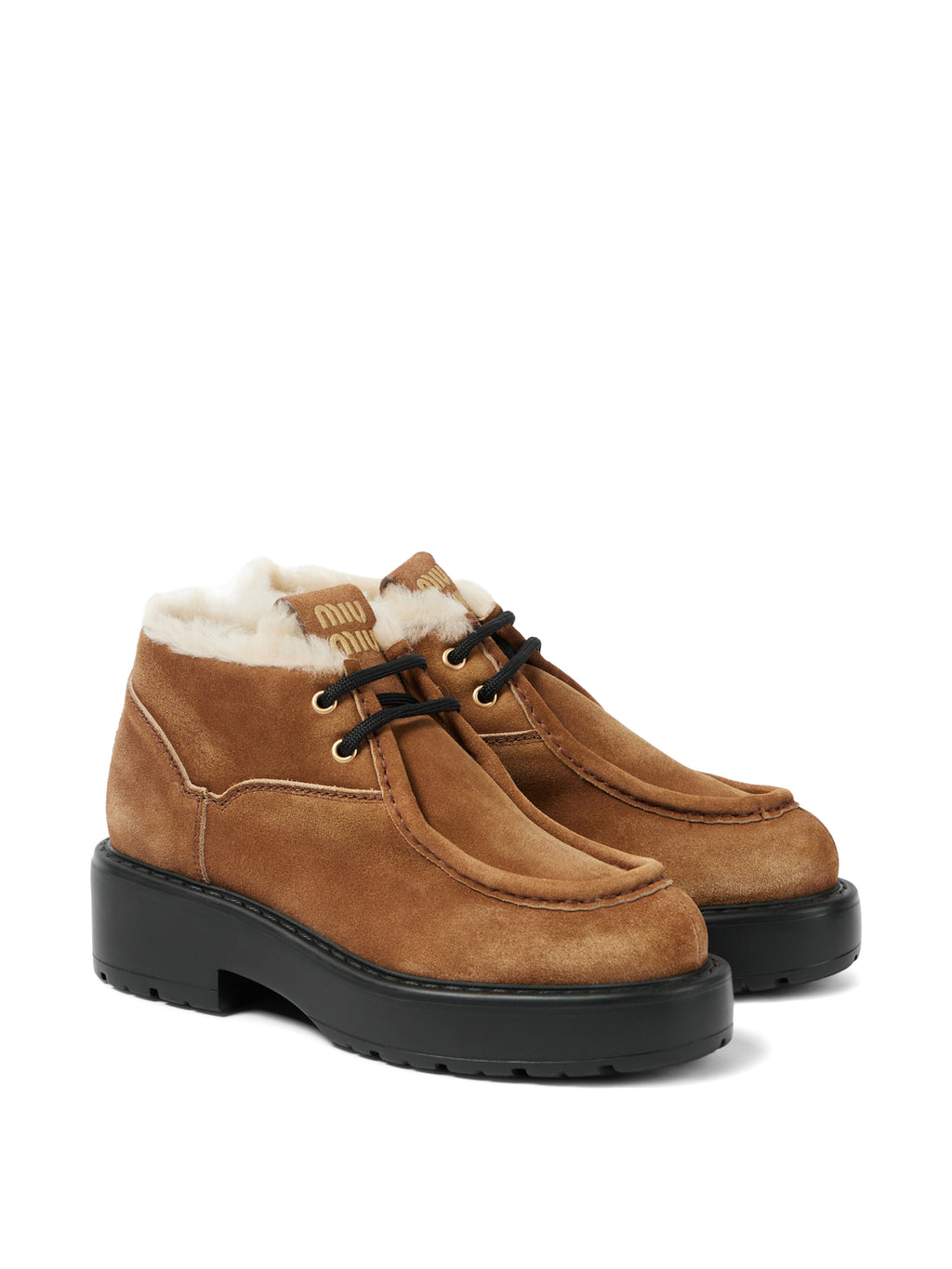 Miu Miu’s Shearling-Trimmed Suede Ankle Boots combine rugged comfort with luxe detail. Crafted from soft suede with an almond toe and chunky rubber sole, the lace-up silhouette is lined with cozy shearling for warmth and style. -
