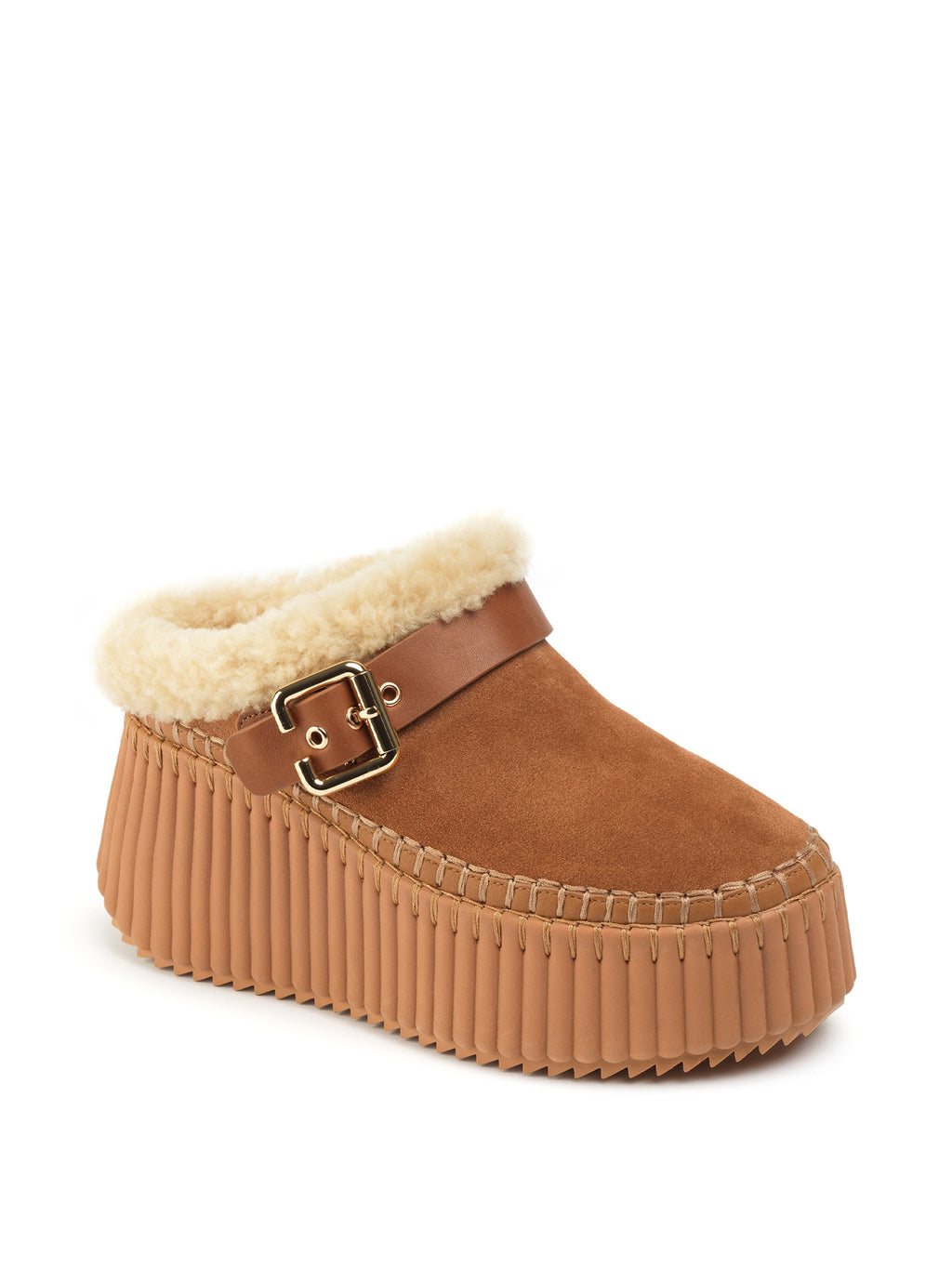 Chloé's Nama Wedge Mules are crafted from suede calfskin and shearling, featuring a leather strap with Chloé’s signature Paddington buckle. Set on a lightweight recycled platform, they are finished with meticulous blanket stitching that takes 4.5 hours to complete by hand. -