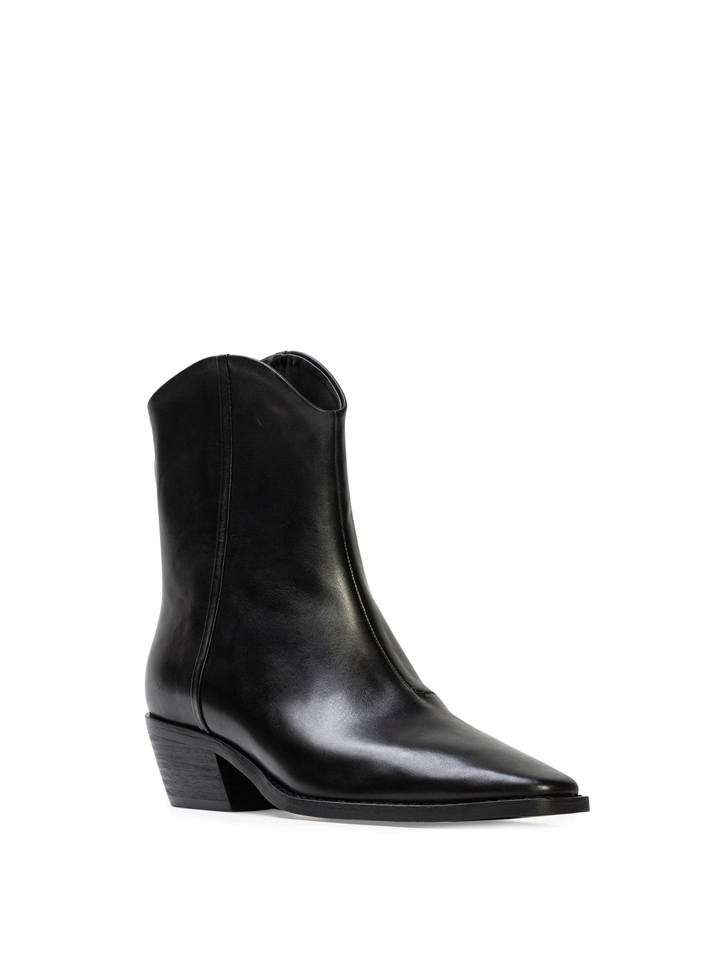 The Reed Boots by Black Suede Studio reinterpret the classic Western silhouette with a modern sensibility. Crafted from smooth baby calf leather, they feature a snipped toe and stacked angled heel, delivering a style that works effortlessly with both denim and dresses. -