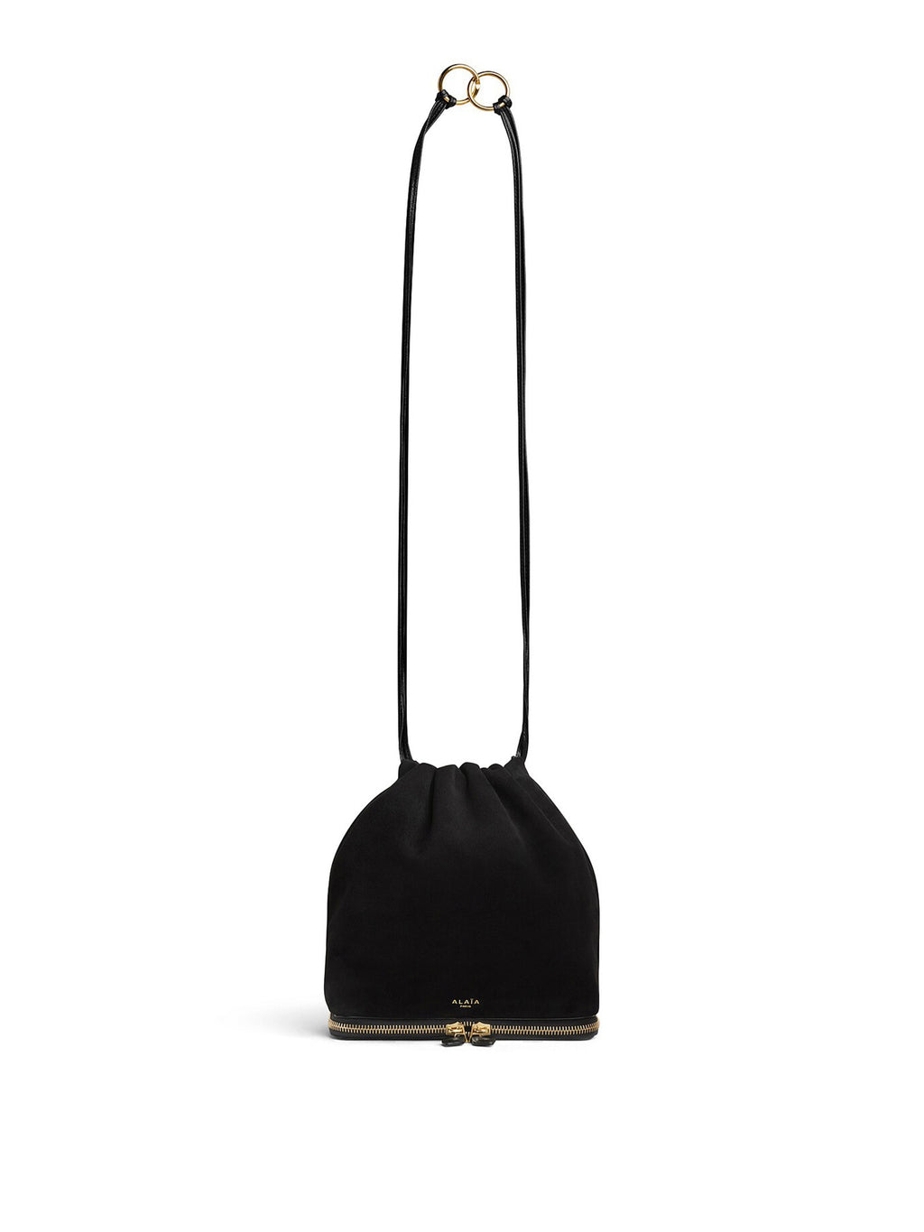 Alaïa’s Le Pochon Bag is a versatile drawstring bag crafted from suede and shiny goatskin leather. Designed for hand carry or worn on the shoulder or crossbody with attachable drawstring straps, it features a zip-closure wallet compartment for secure storage. -