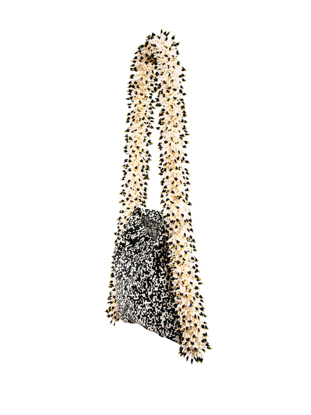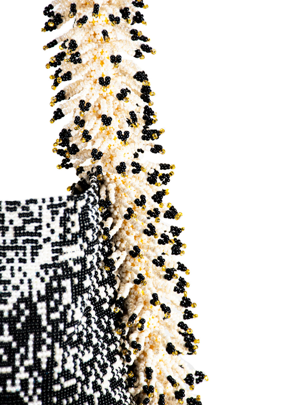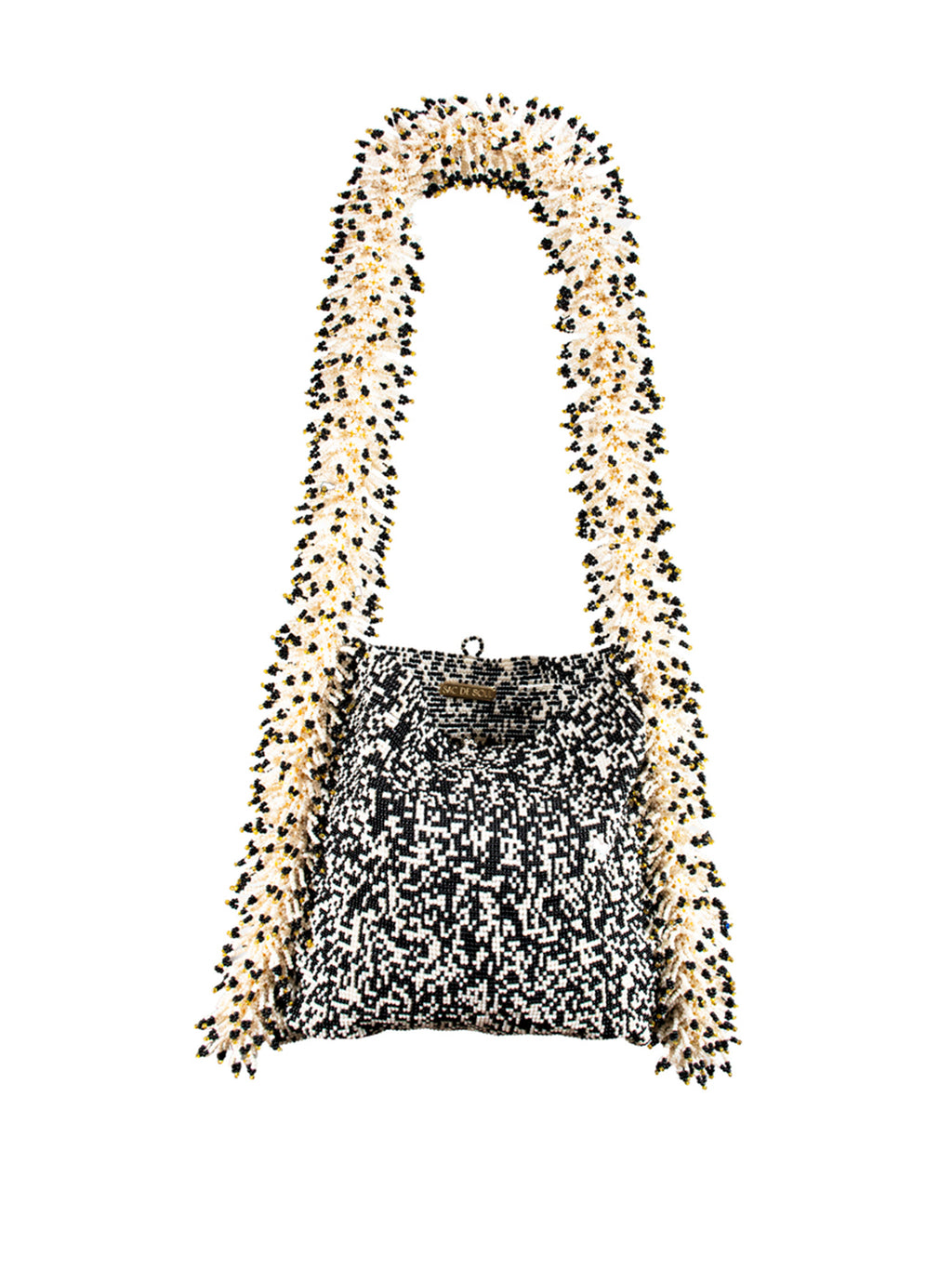 Sac de Soul’s Camila Bag pairs a white, grey, and black beaded arrangement with a striking three-dimensional handle. Hand-woven by Guatemalan artisan women using ancestral techniques, it’s crafted from over 32,000 Czech glass seed beads and shaped into a structured square silhouette. A legacy design made to endure, it’s both art and accessory. The dust bag is produced by Mieelo, a women-led social impact business dedicated to creating meaningful opportunities for women in Guatemala.