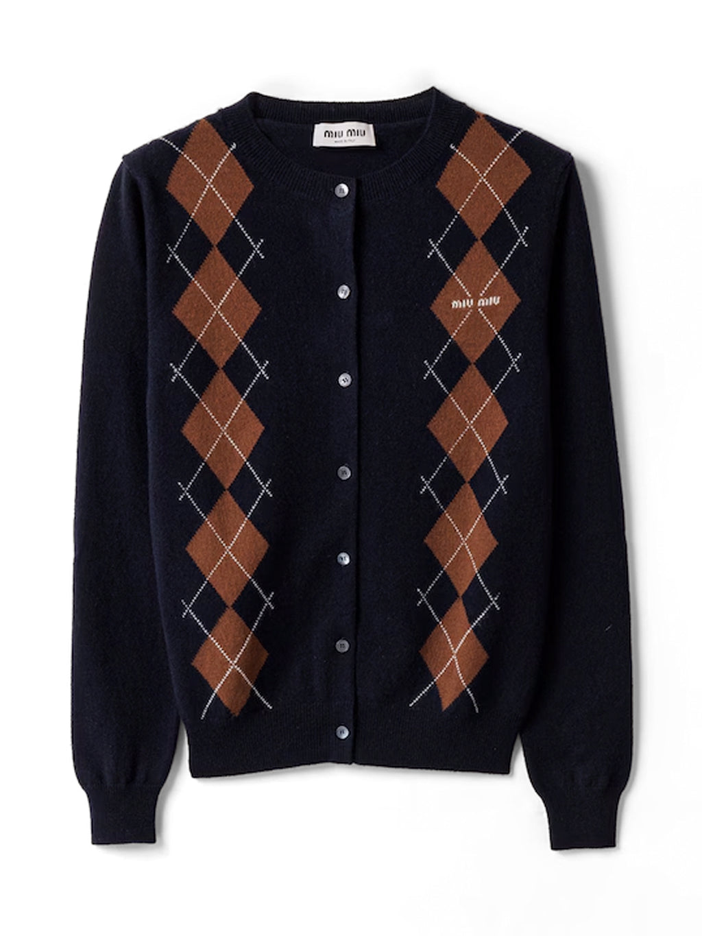 Miu Miu’s Cashmere Cardigan lends a playful note to a classic silhouette with its argyle intarsia knit and subtle logo detail. Crafted for a slim fit with ribbed trims and a button closure, it’s a soft yet polished layer for everyday wear. -
