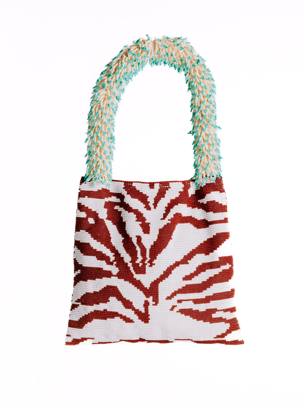 Sac de Soul’s Zebra Clash of Prints Bag pairs a burgundy and white zebra pattern with a contrasting aqua-and-white beaded handle for a striking visual mix. Hand-woven by Guatemalan artisan women using ancestral techniques, it’s crafted from over 32,000 Czech glass seed beads and shaped into a structured square silhouette. A legacy design made to endure, it’s both art and accessory. The dust bag is produced by Mieelo, a women-led social impact business dedicated to creating meaningful opportunities for women in Guatemala. -