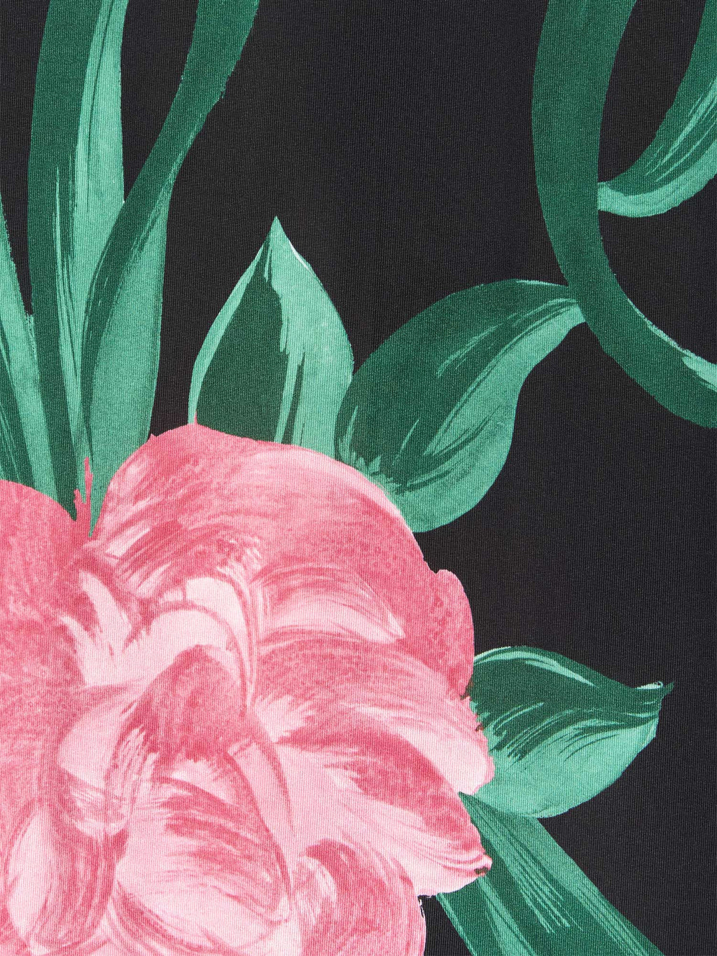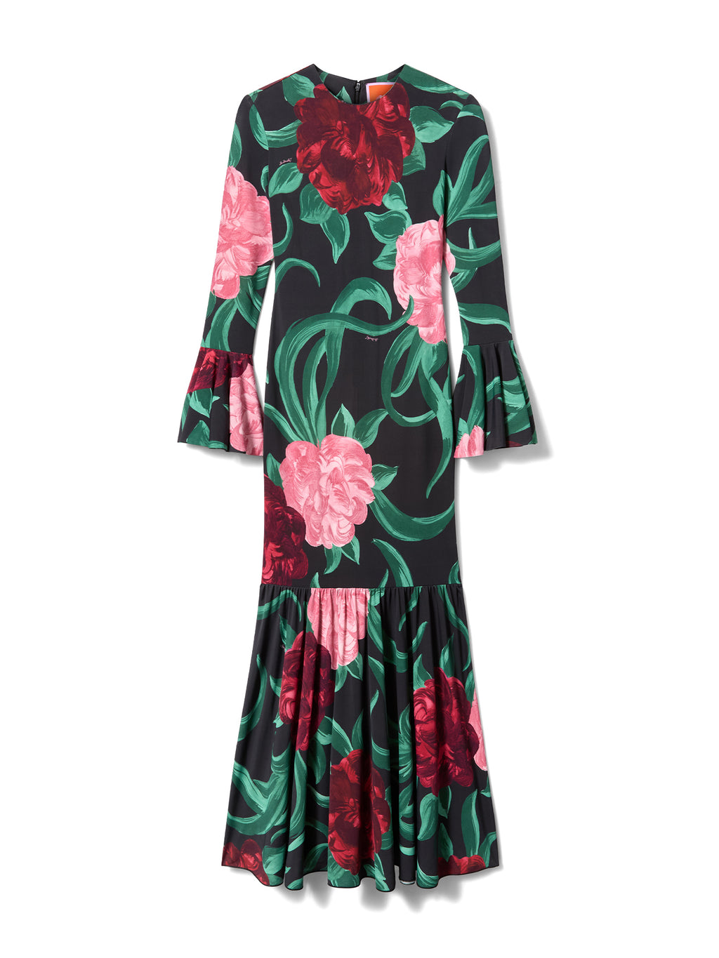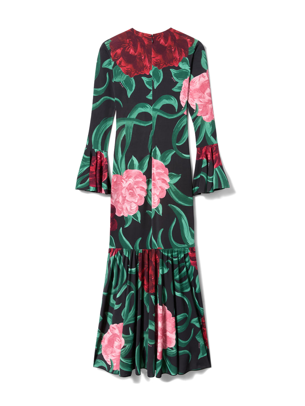 The Alba Dress by La DoubleJ is a sleek, figure-skimming silhouette cut from fluid jersey that drapes smoothly over the body without feeling restrictive. Designed to flatter from every angle, it features dramatic flared cuffs and a softly flounced hem that create a subtle hourglass effect in motion. The black base is brought to life with an oversized peony print, balancing sensual simplicity with the collection’s signature joy and visual impact. -