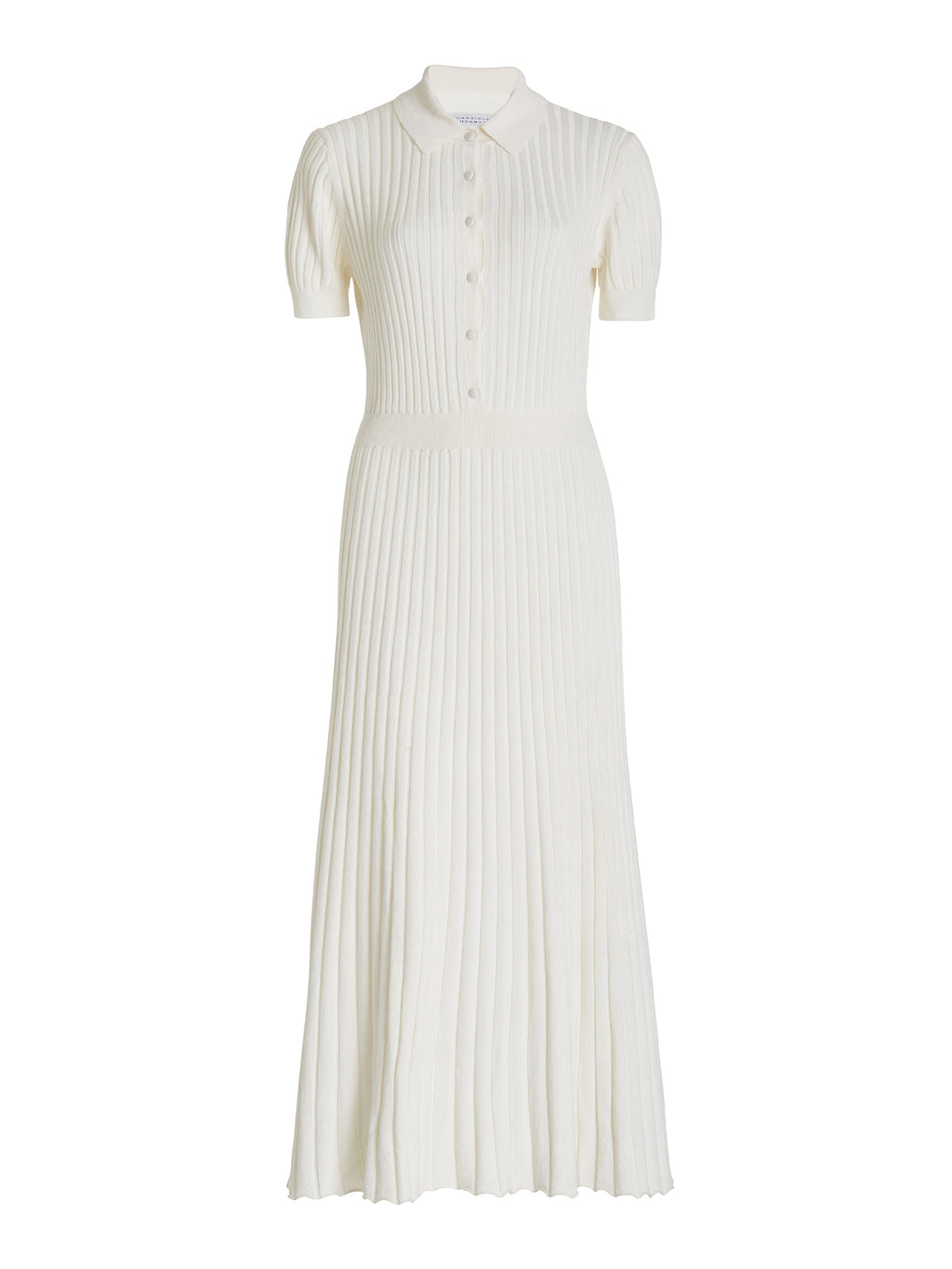 Gabriela Hearst’s Amor Dress is crafted in a cashmere-silk knit. The ribbed short sleeves, refined collar, and self-covered button placket bring a sense of modernity to a timeless silhouette. -