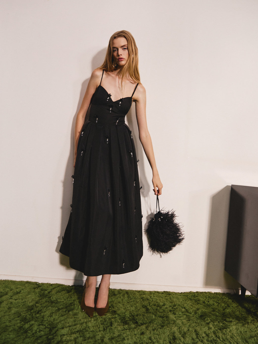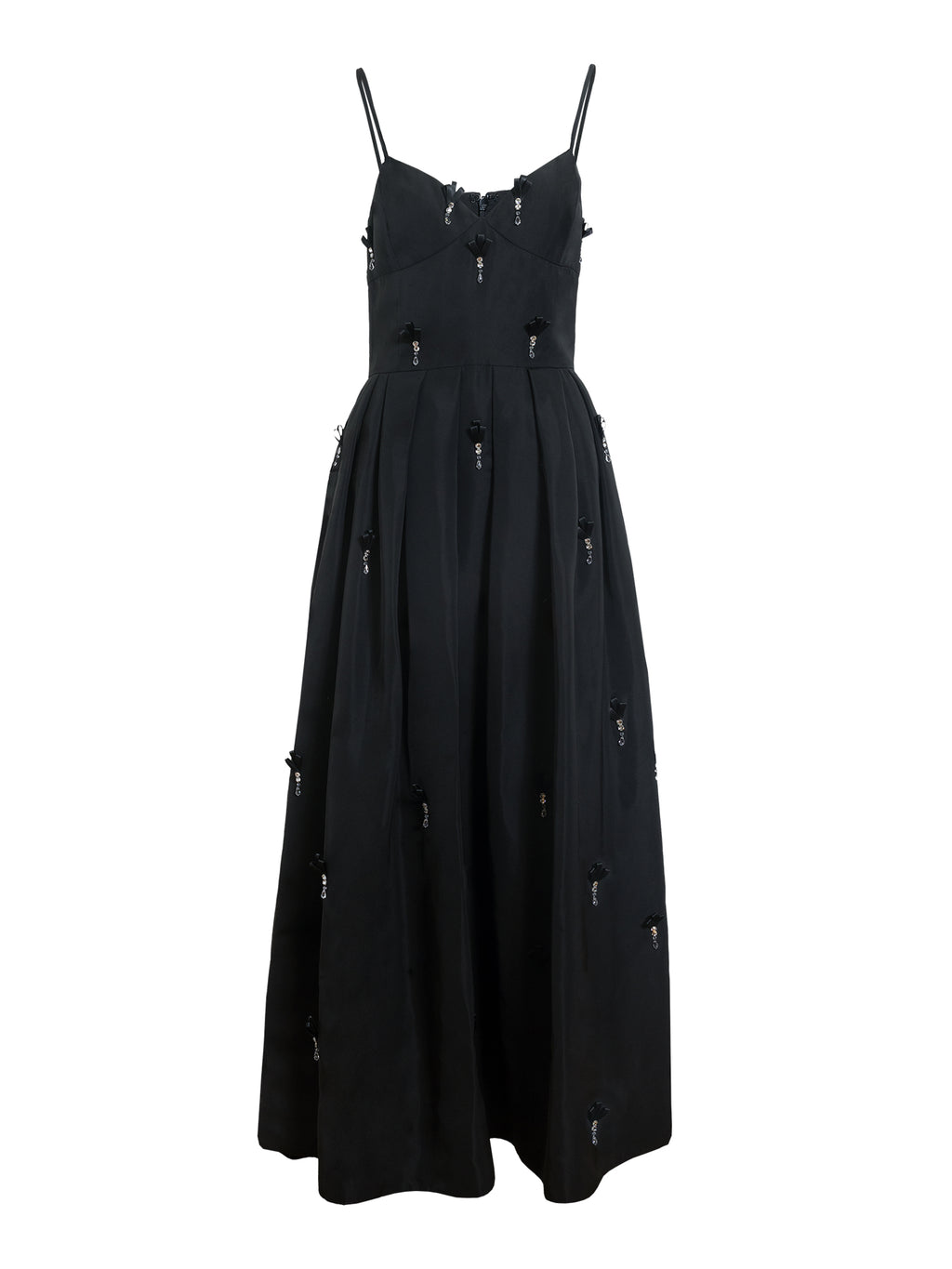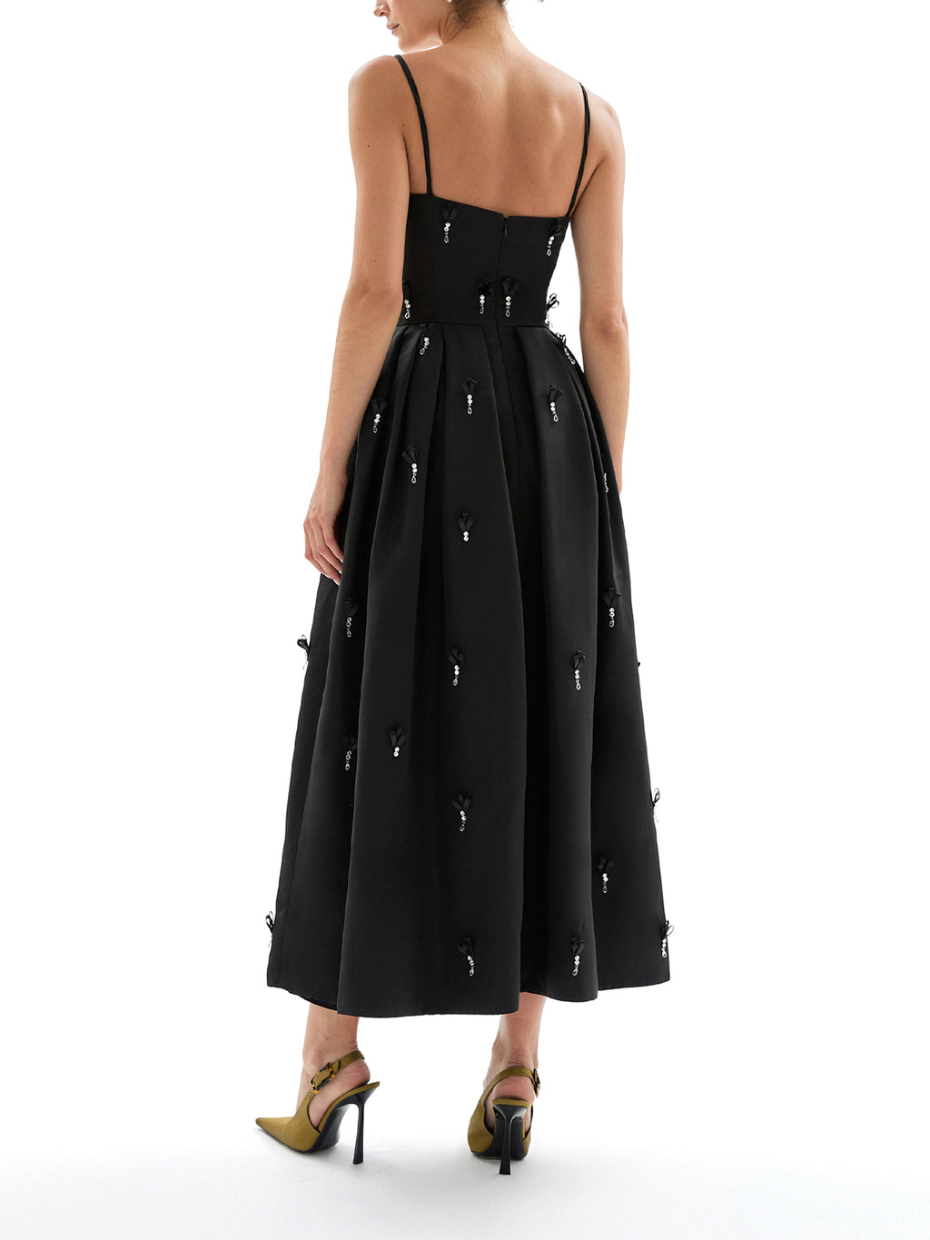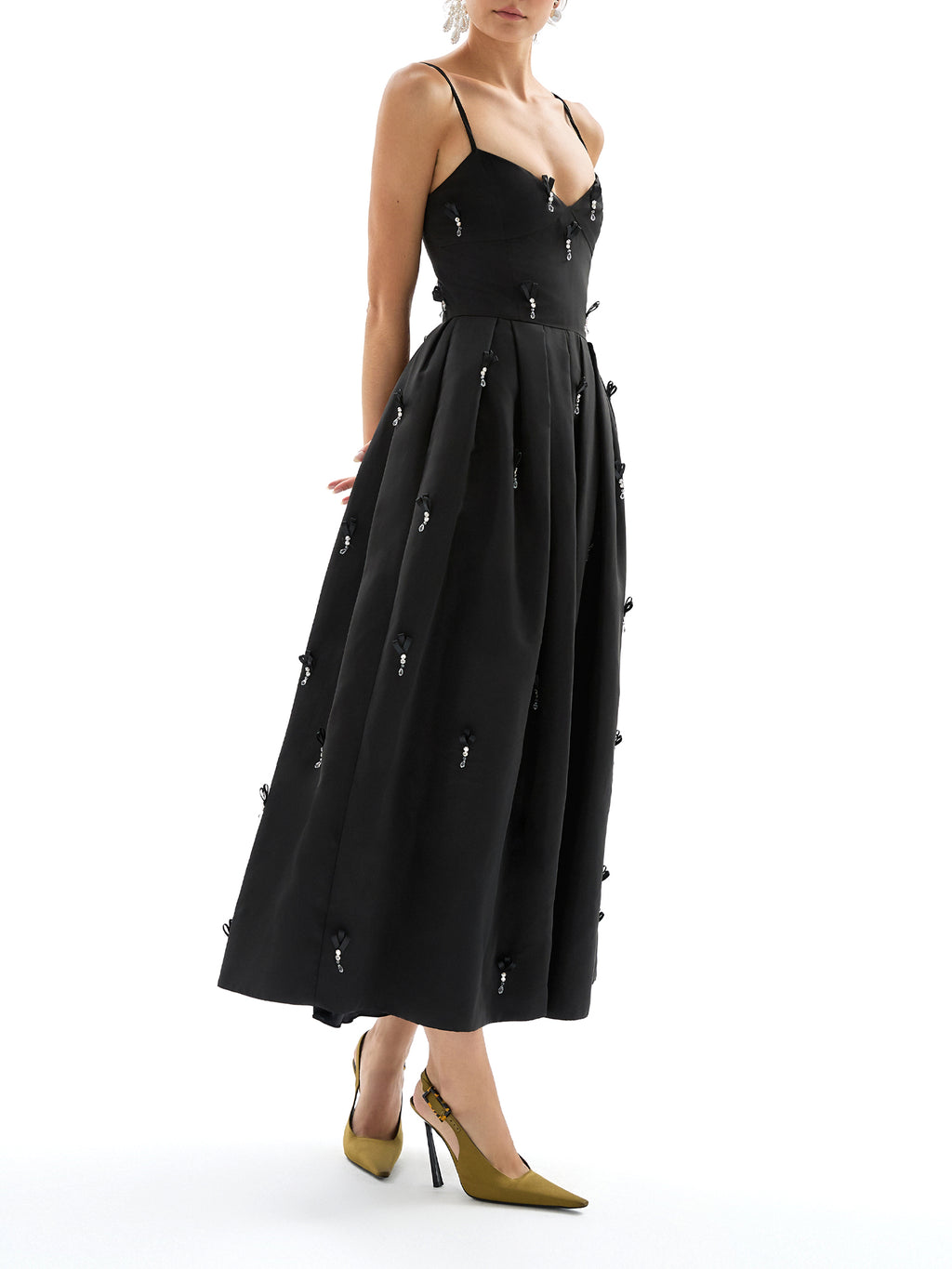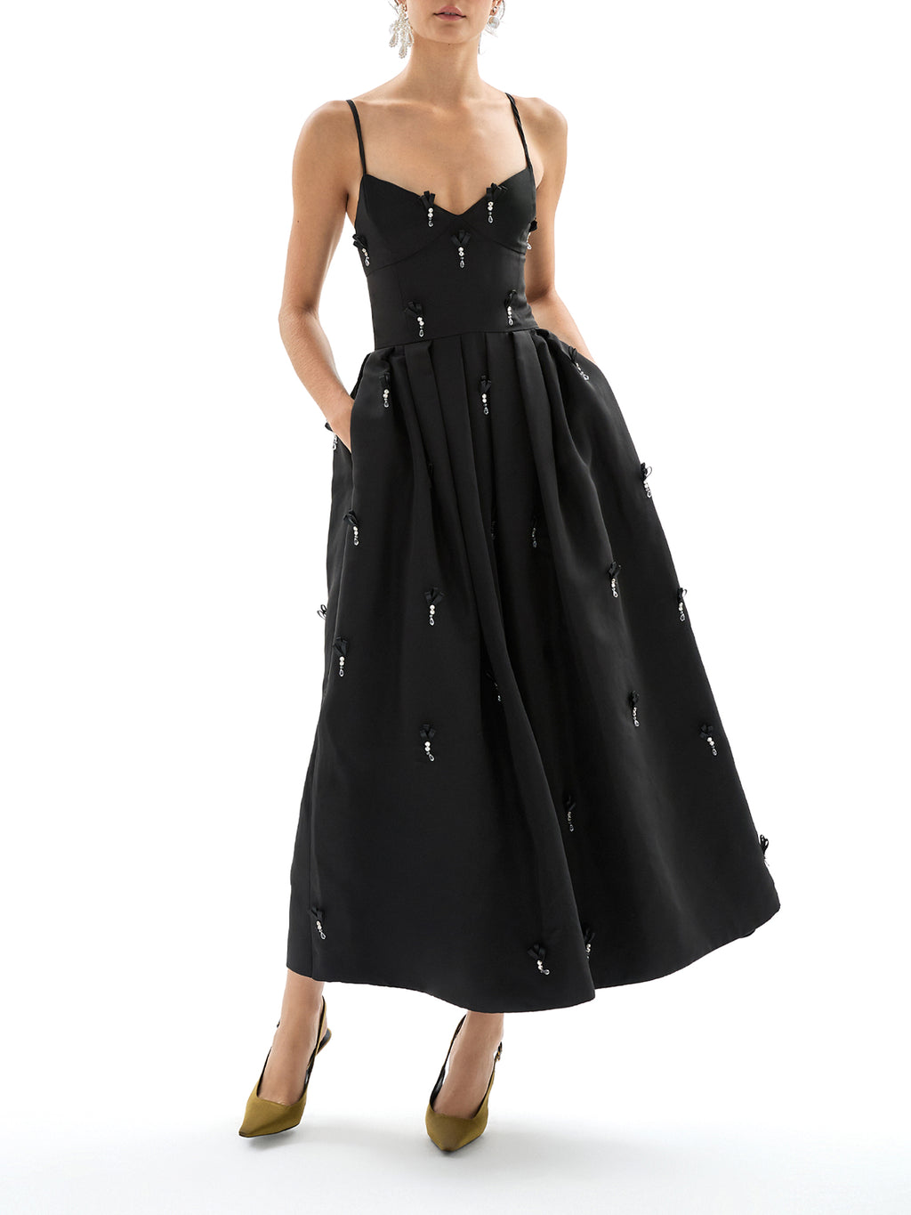 The Annette Midi Dress by Delphine offers a romantic, sculpted silhouette. Crafted from memory faille, it features a sweetheart neckline, pleated waist, and on-seam pockets. Finished with hand-cut ribbon embellishments with crystal stones. -