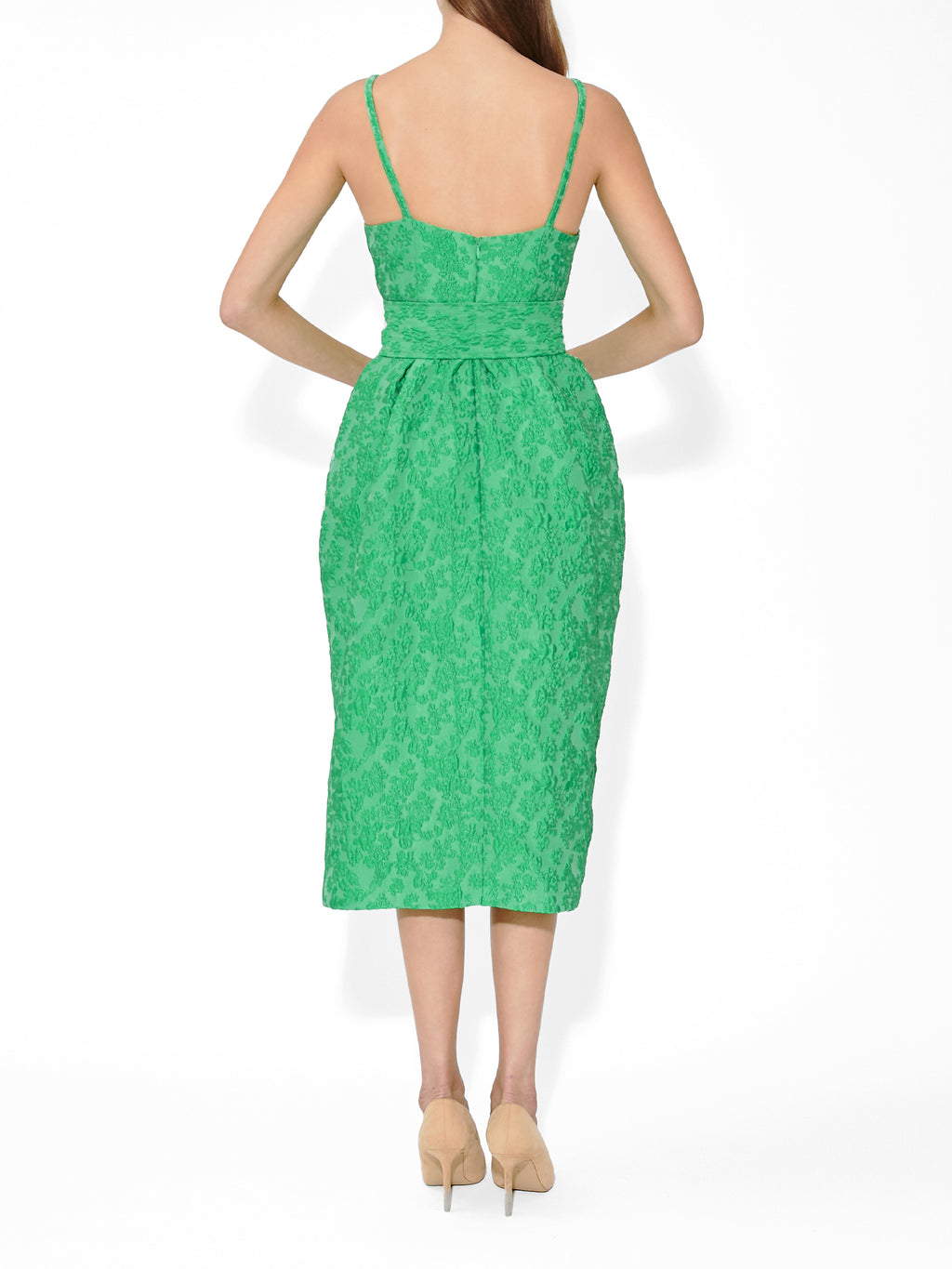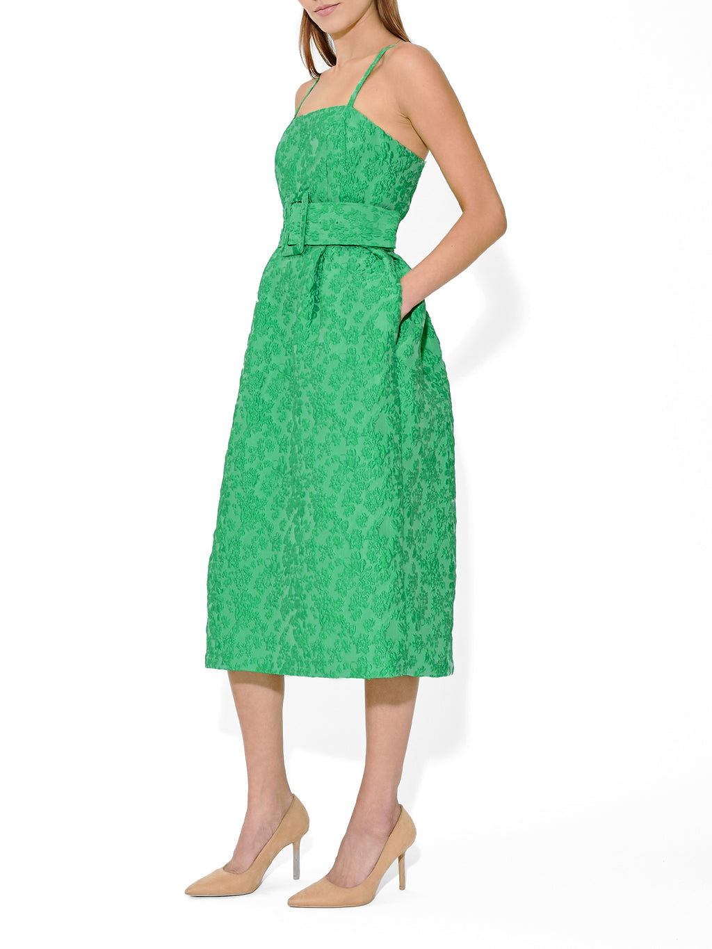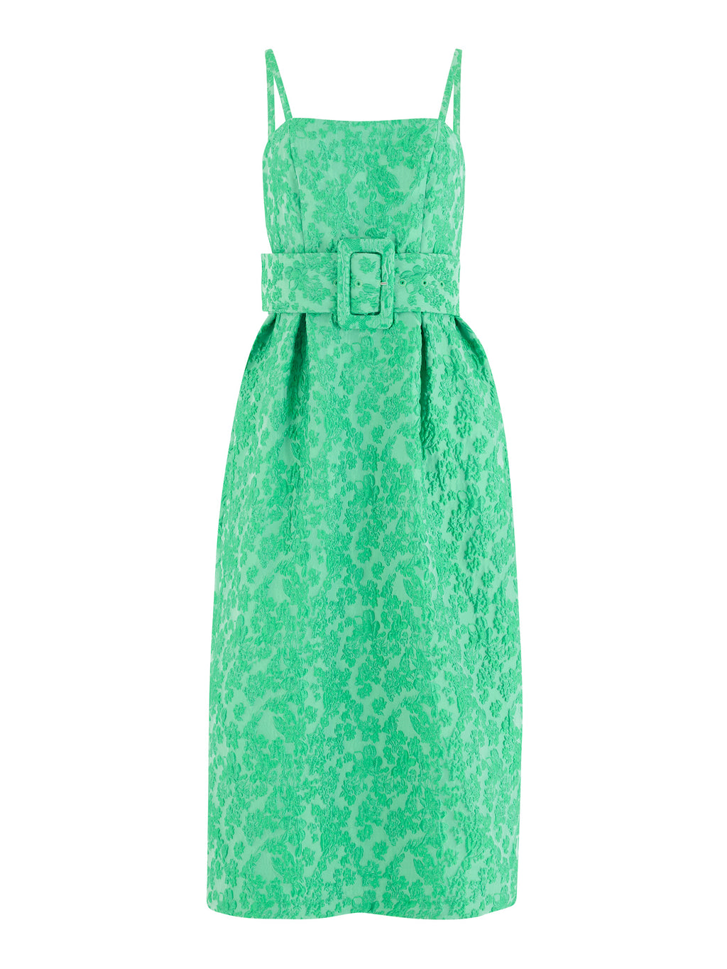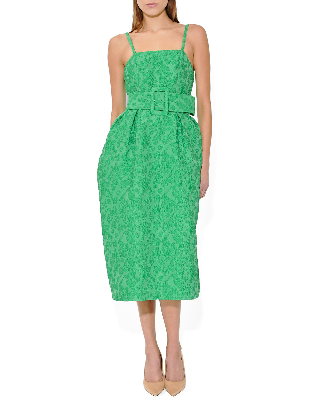 The Wildflower Cloqué Artichoke Belted Dress by Rosie Assoulin elevates sculptural romance through texture and color. Slim straps and a structured neckline shape the bodice, while a wide self-belt defines the waist with dramatic proportion. Cloqué fabric in luminous green with wildflower-inspired relief adds depth and dimension, and soft pleats allow the skirt to fall just below the knee, creating a striking, enduringly feminine silhouette.