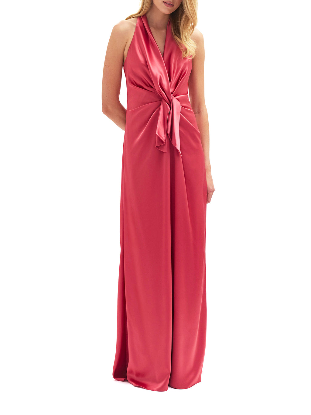 Delphine’s Ava Gown in vibrant coral features a plunging neckline and sleeveless silhouette crafted from drapey satin charmeuse for fluid elegance. Fully lined and designed with a soft drape at the center front, it is bias cut at the back to enhance movement and shape. A striking option for formal occasions. -