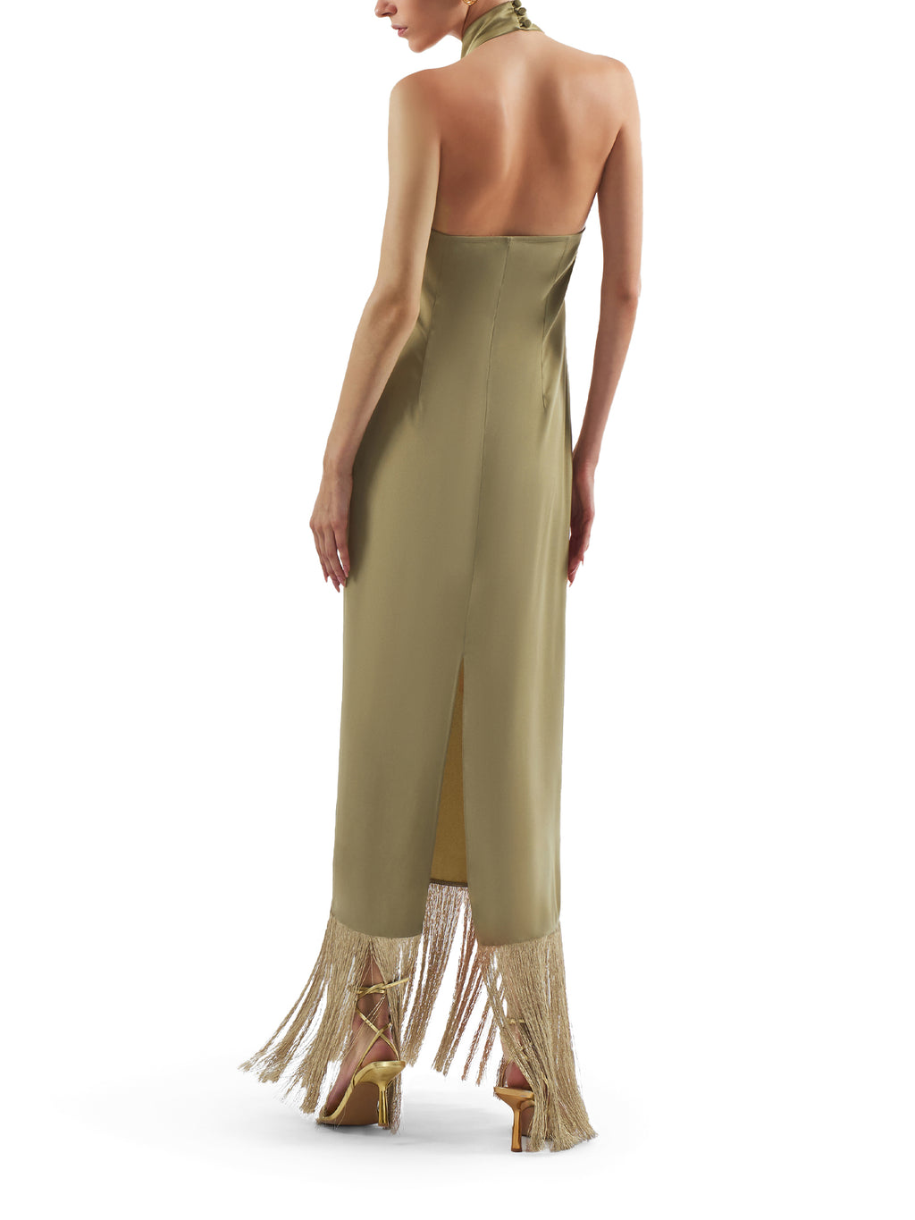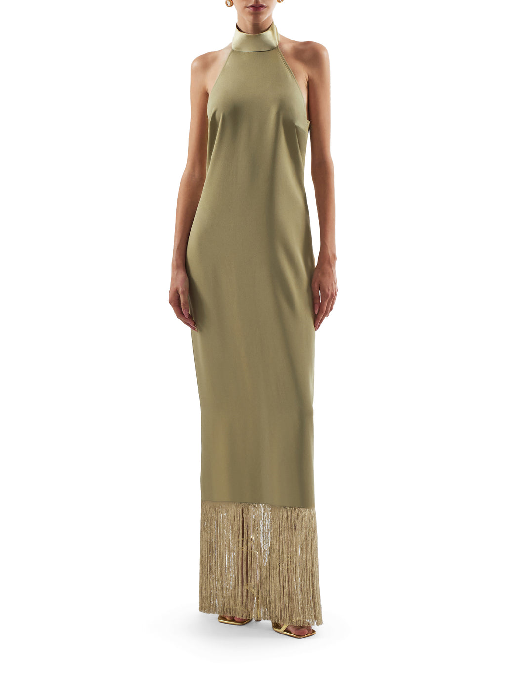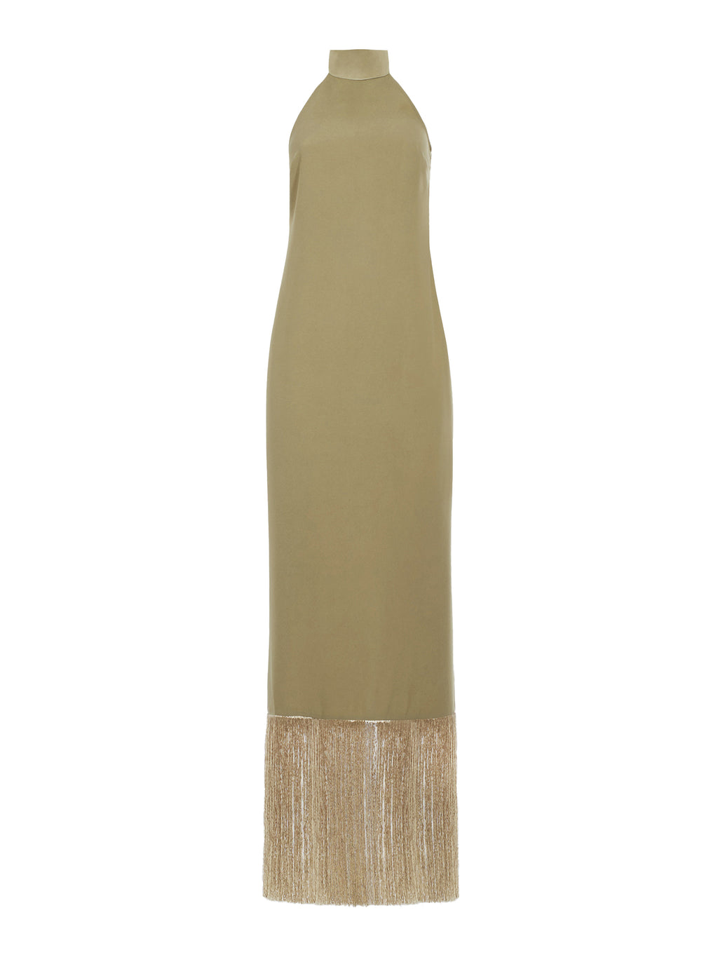 The Berlin Dress by Taller Marmo is a sleeveless halter neck silhouette cut from crepe cady in a brass tone. Finished with metallic fringes at the hem, it captures the brand’s signature blend of glamour and movement. -
