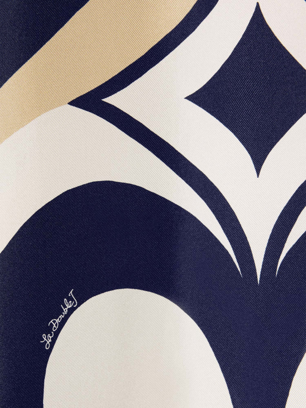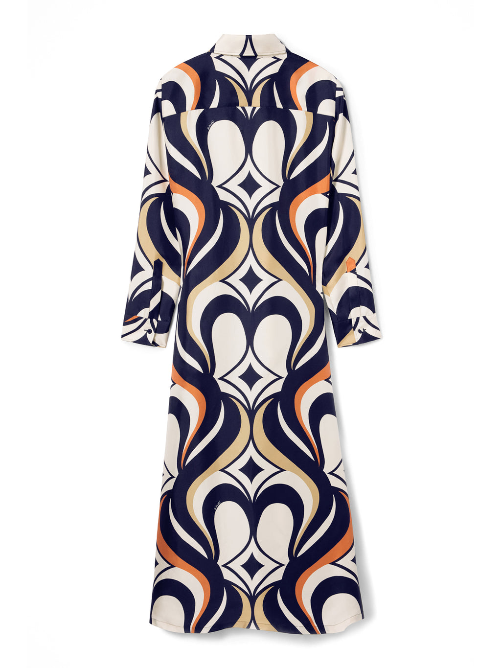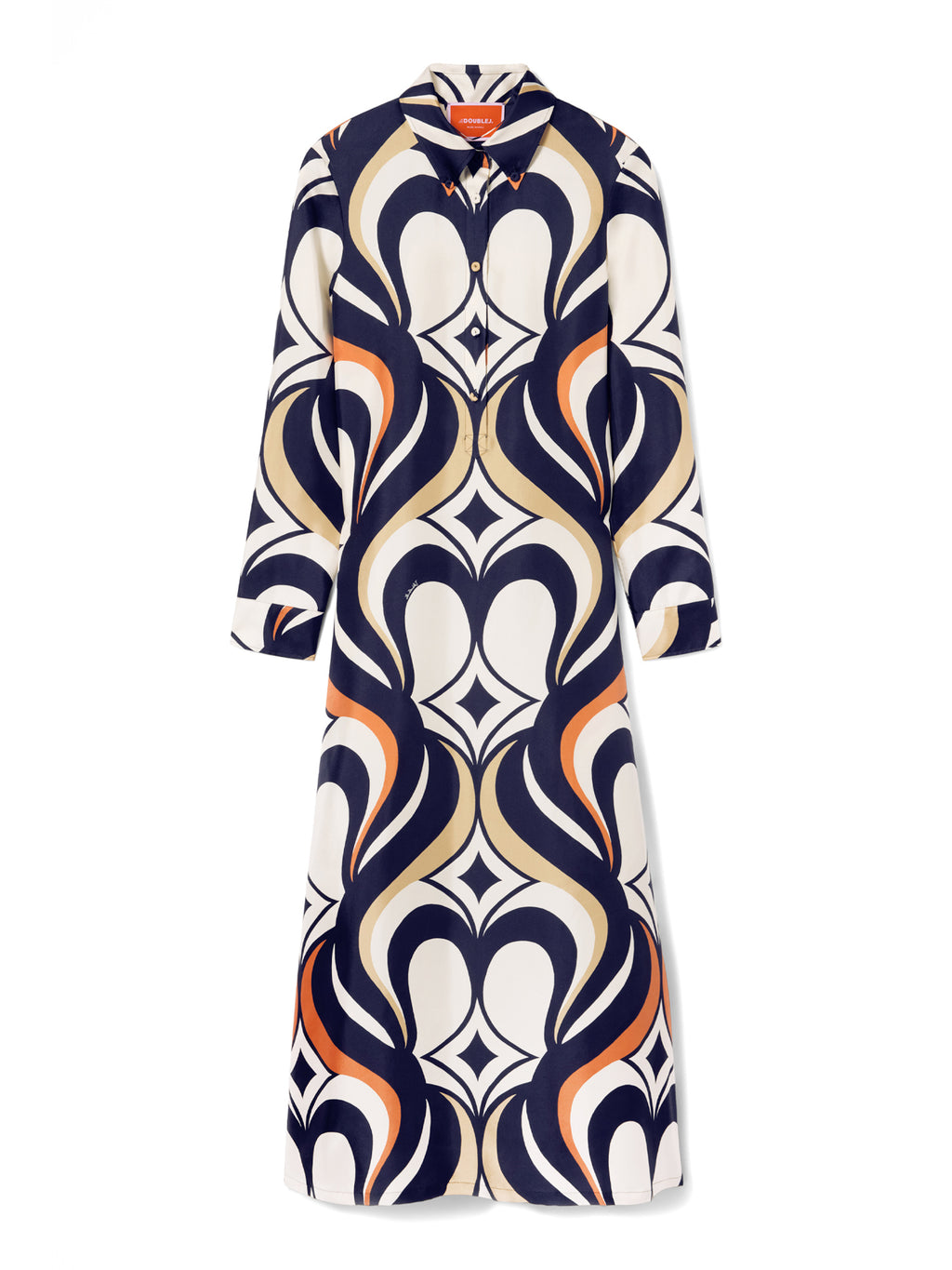 The Chemise Swing Shirtdress by La DoubleJ joins the brand’s iconic Swing family with a vibrant twist. Cut from Italian silk twill, this reimagined shirtdress features a crisp shirt collar and cuffs, with button detailing down to the waist for a tailored-meets-playful look. Shown here in the bold Jive Macro print—a retro-inspired navy, cream, and orange pattern—it’s a standout piece perfect for transitioning from city strolls to seaside aperitivos. -