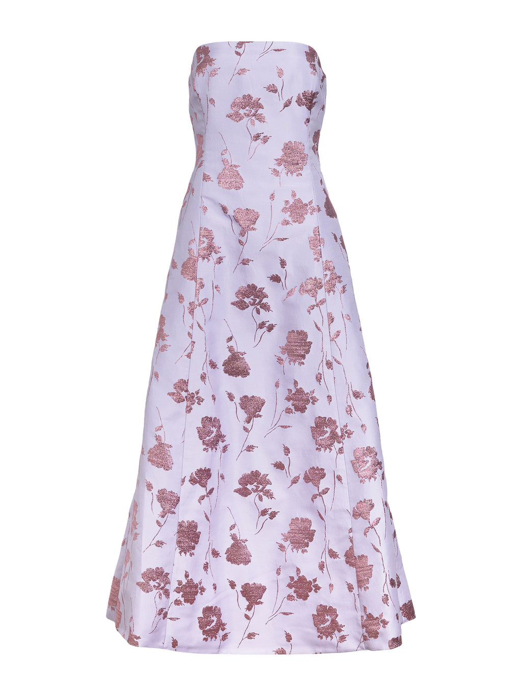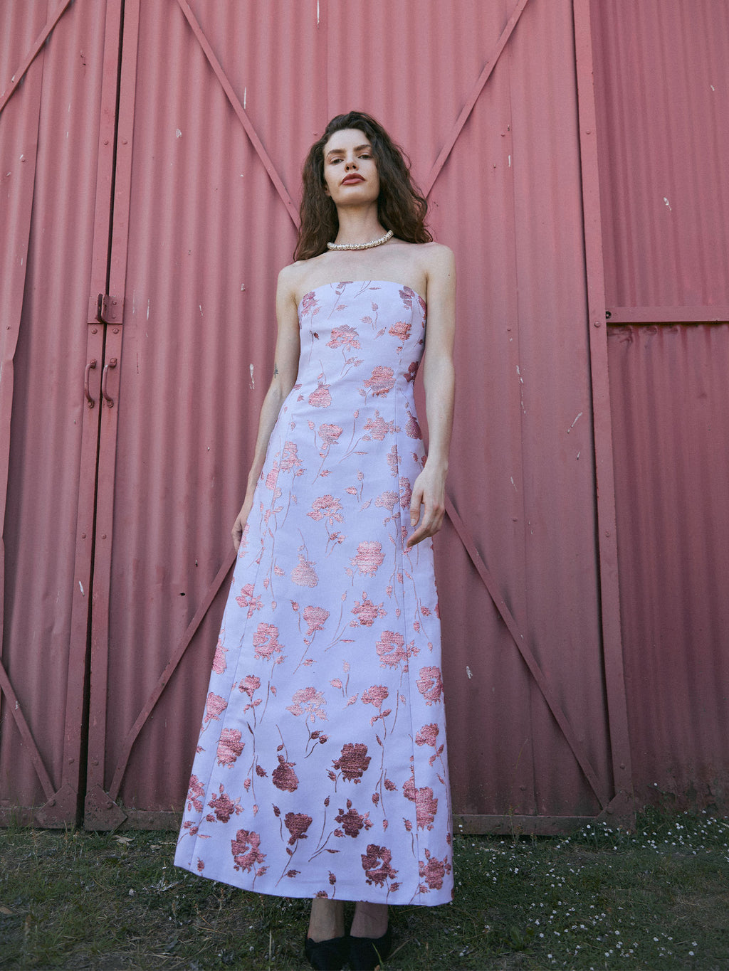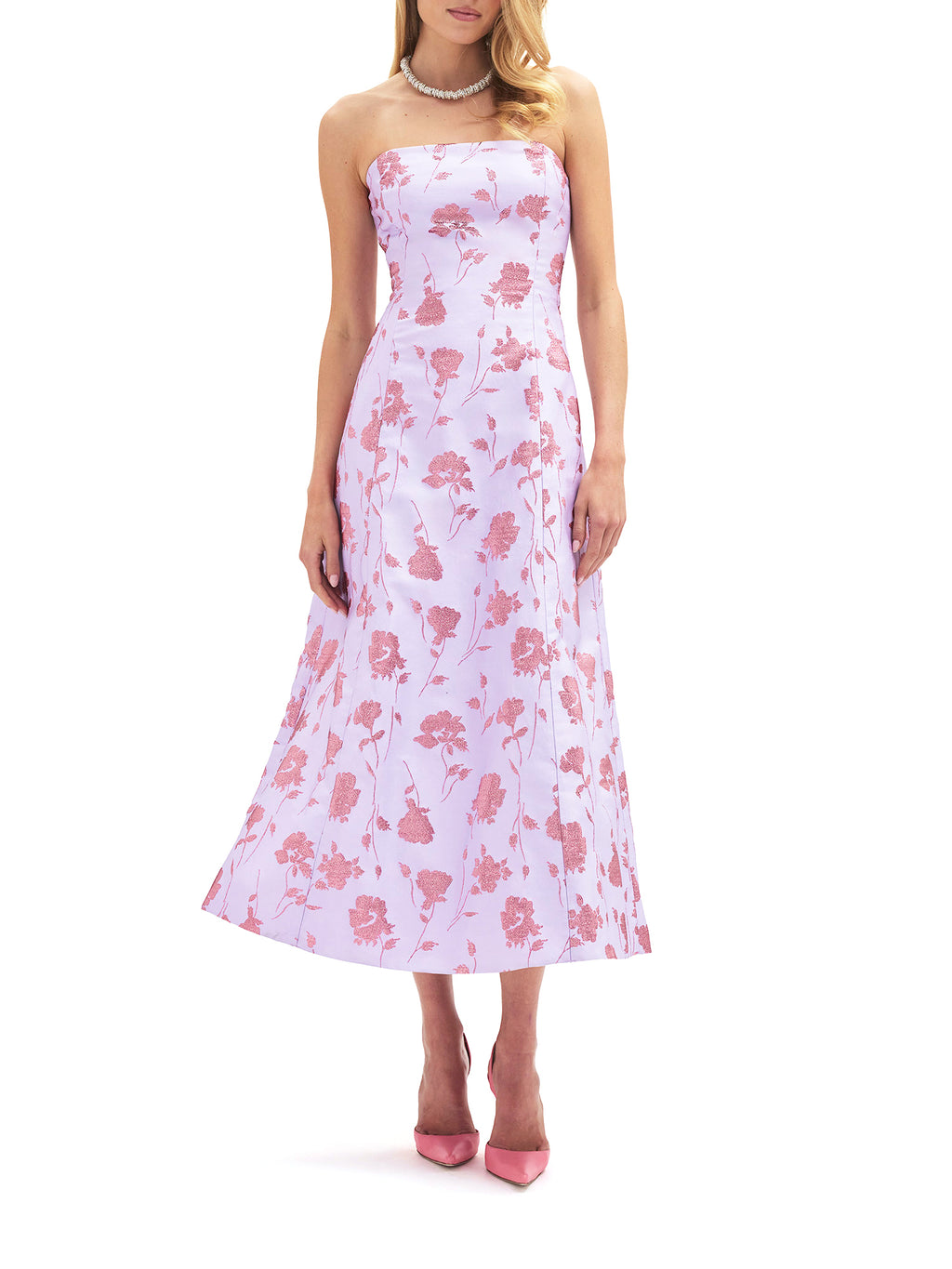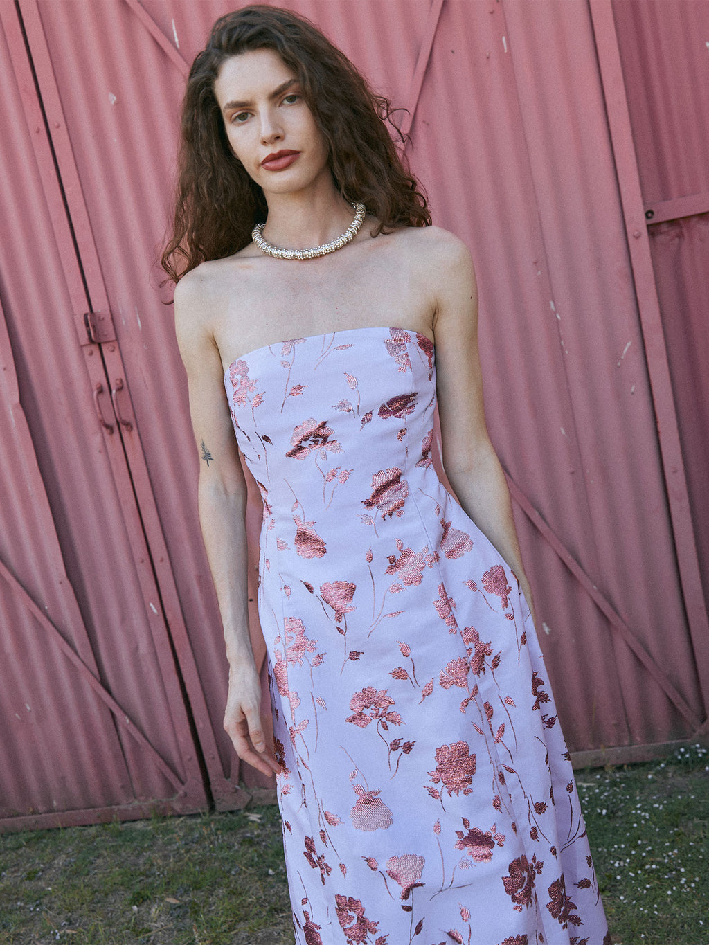 Delphine’s Colette Dress features a straight neckline and elegant fit-and-flare silhouette that falls to a full midi length. The metallic floral pattern adds luminosity, making it a refined, feminine choice for garden parties or wedding weekends. -