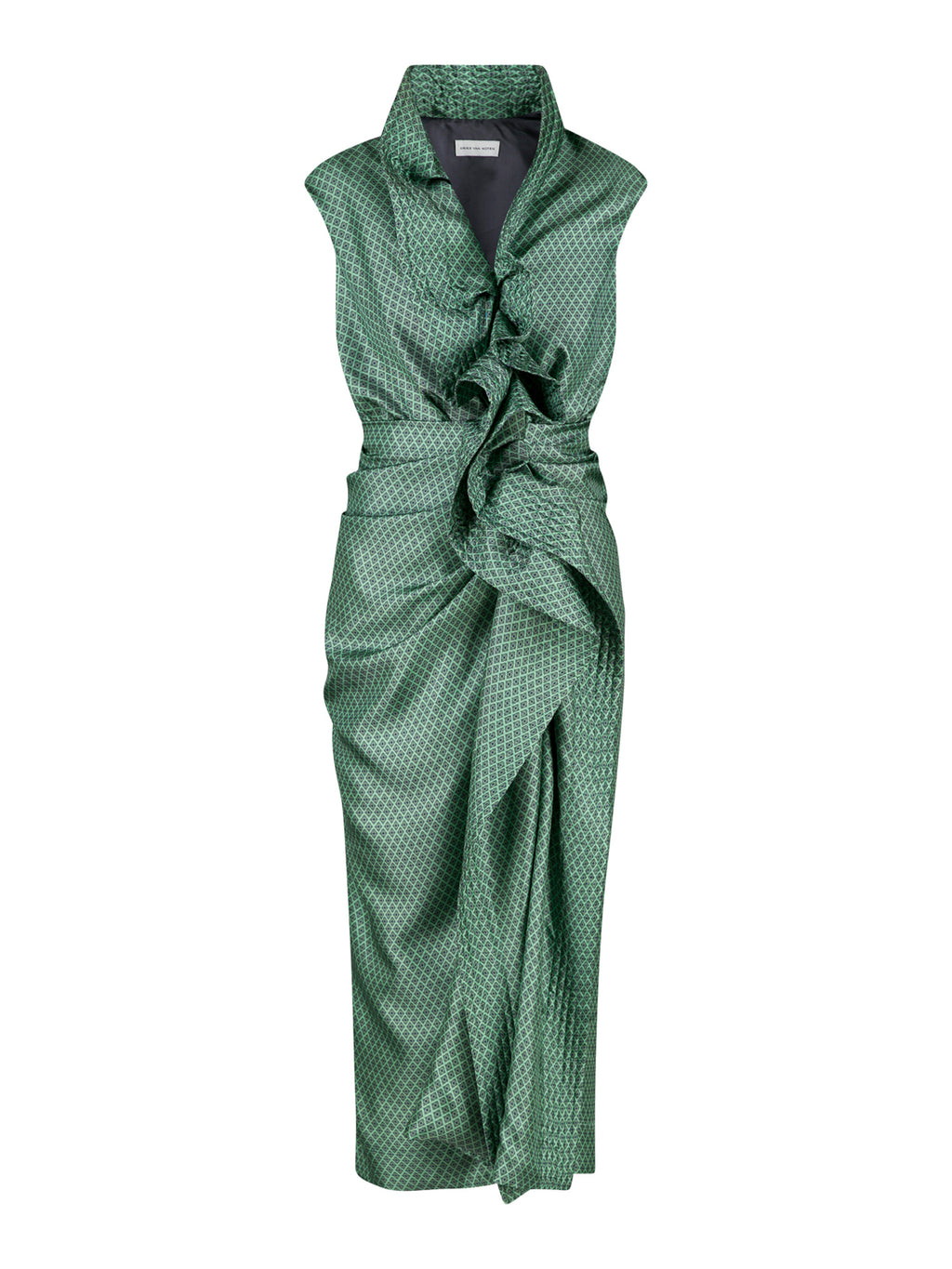 Dries Van Noten’s Davylo Dress is crafted in silk twill with a dotted mint-green motif that shimmers with texture. A high neckline and front ruffle lead into an asymmetric wrap skirt, where fluid draping creates a sculptural midi silhouette. -
