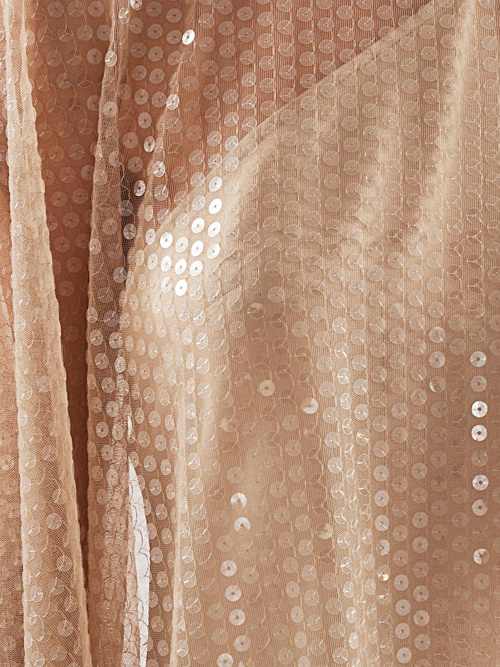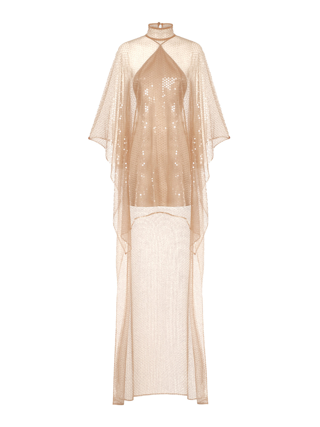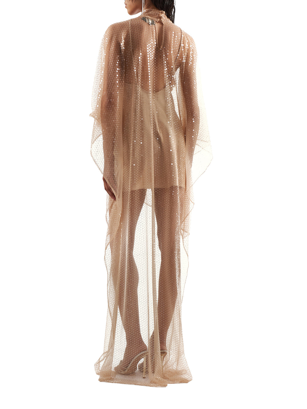 The Denver Disco Kaftan by Taller Marmo shimmers with ethereal allure. Crafted from sheer sequined fabric, it features a high neckline and a flowing high-low hem that moves beautifully with the body. Designed to be layered over separates or worn with the included halter slip dress, it captures the brand’s signature blend of glamour and ease for a striking event look.