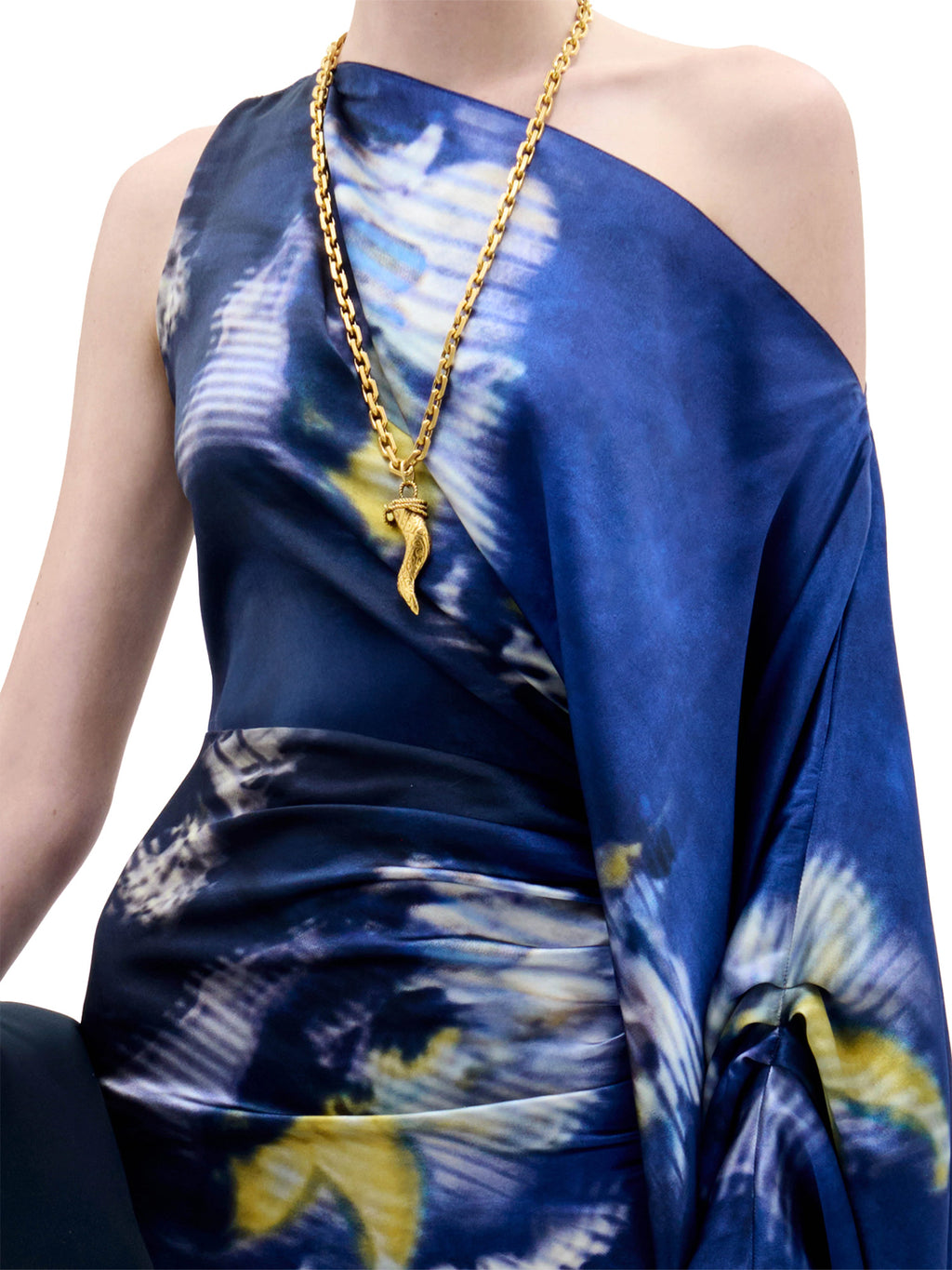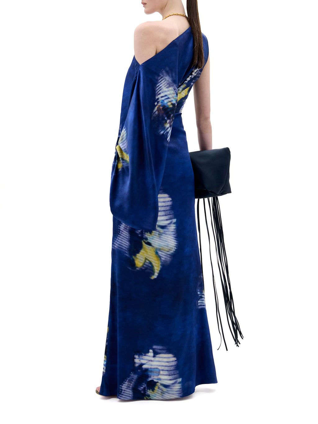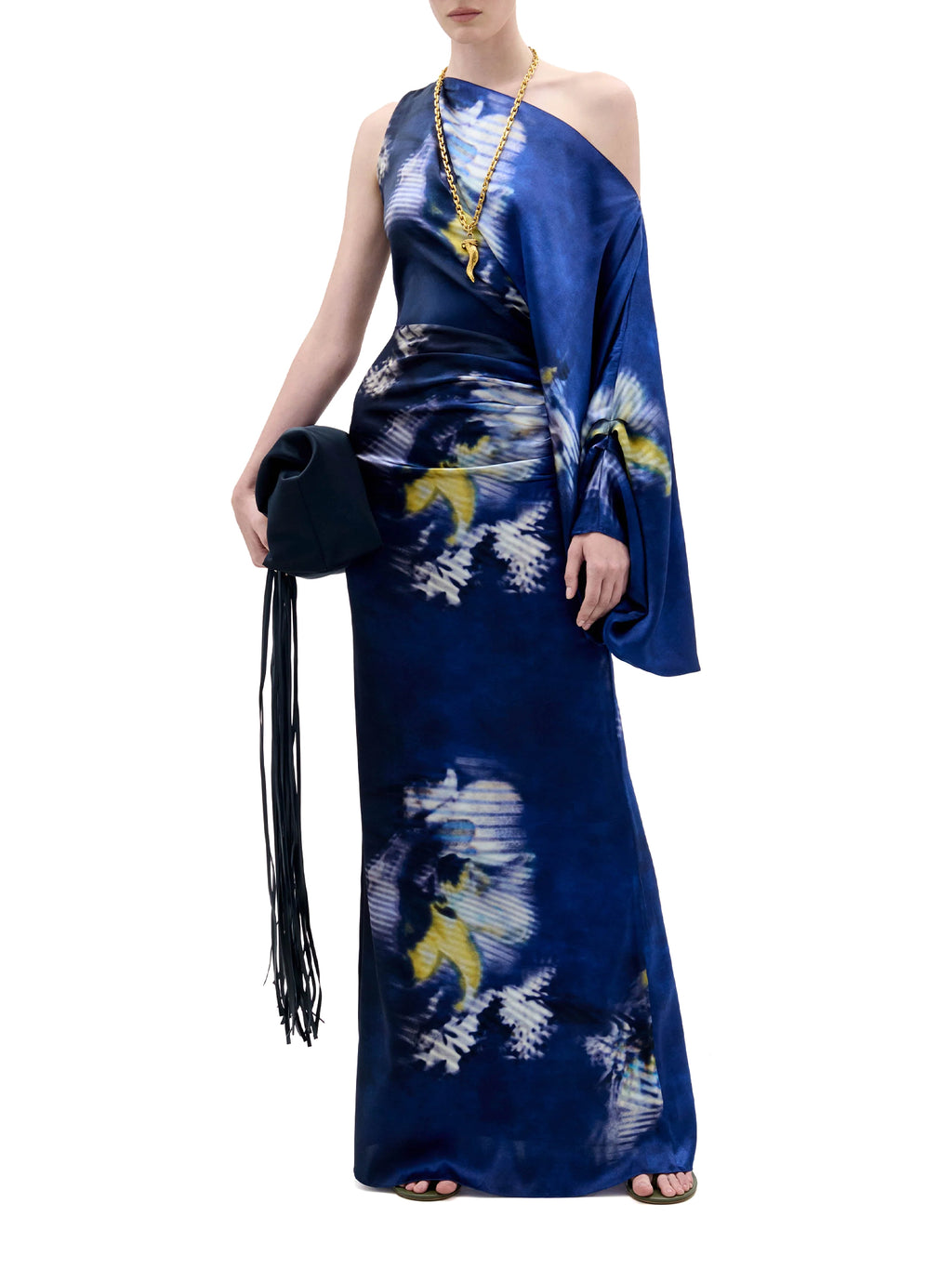 Striking and sensuous, Silvia Tcherassi's Dotty Dress embodies the brand’s signature elegance through movement and artful asymmetry. Rendered in the Midnight Flower print, the silk maxi silhouette features an asymmetric neckline balanced by a draped long sleeve that cascades along the arm. A softly gathered waist defines the figure before falling into a sleek column shape. With print placement that may vary slightly, every dress is one of a kind. Designed for evening moments that call for drama with restraint. Style with statement jewelry and minimal heels to let the silhouette and print command attention. -