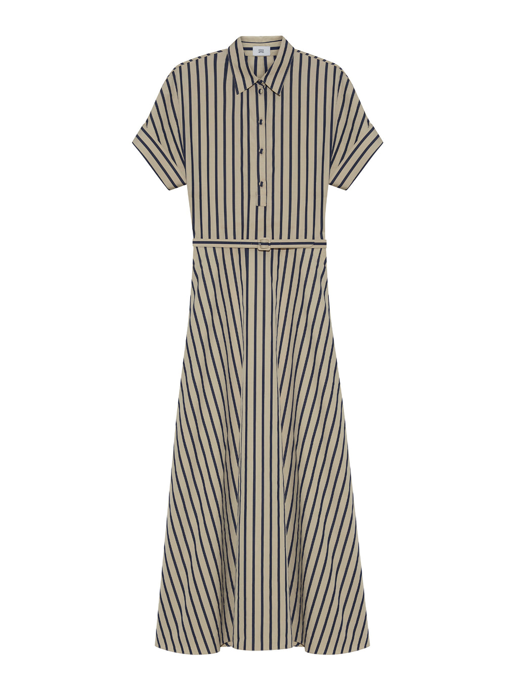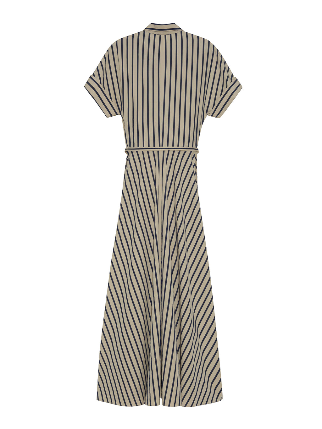 Adam Lippes’ Sadie Dress is crafted in crisp Italian cotton with navy and khaki stripes, shaped into a flattering A-line silhouette. Self-covered buttons at the center front meet a collared neckline, while a matching belt cinches the waist. Finished with discreet pockets for functionality.
