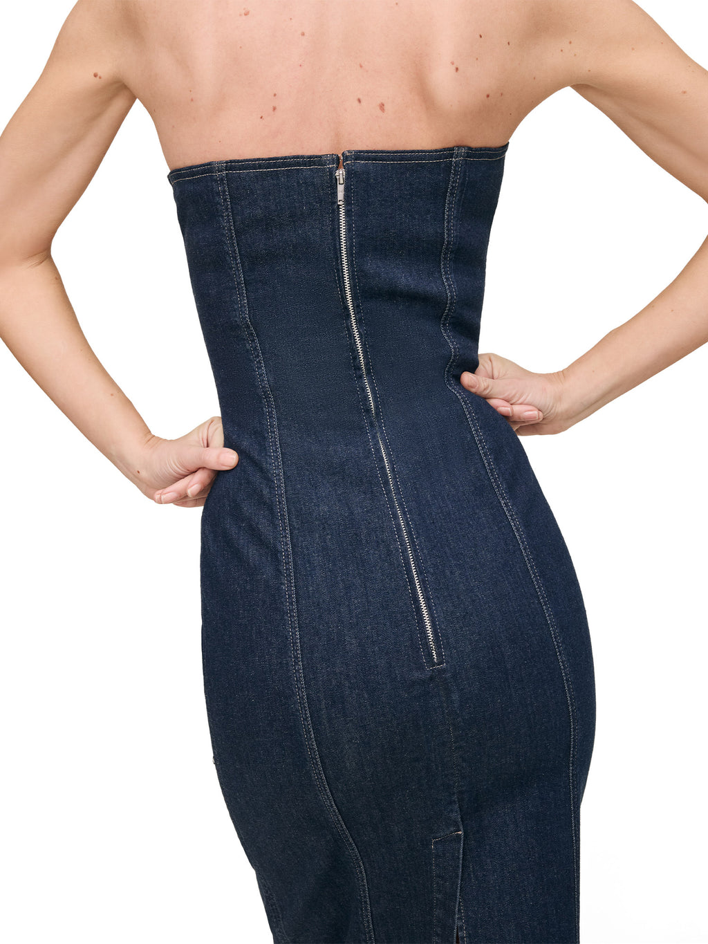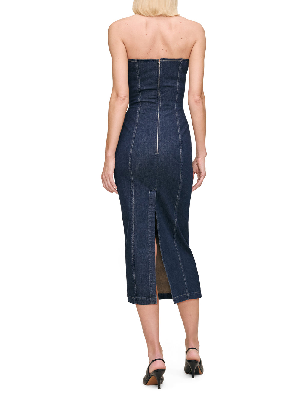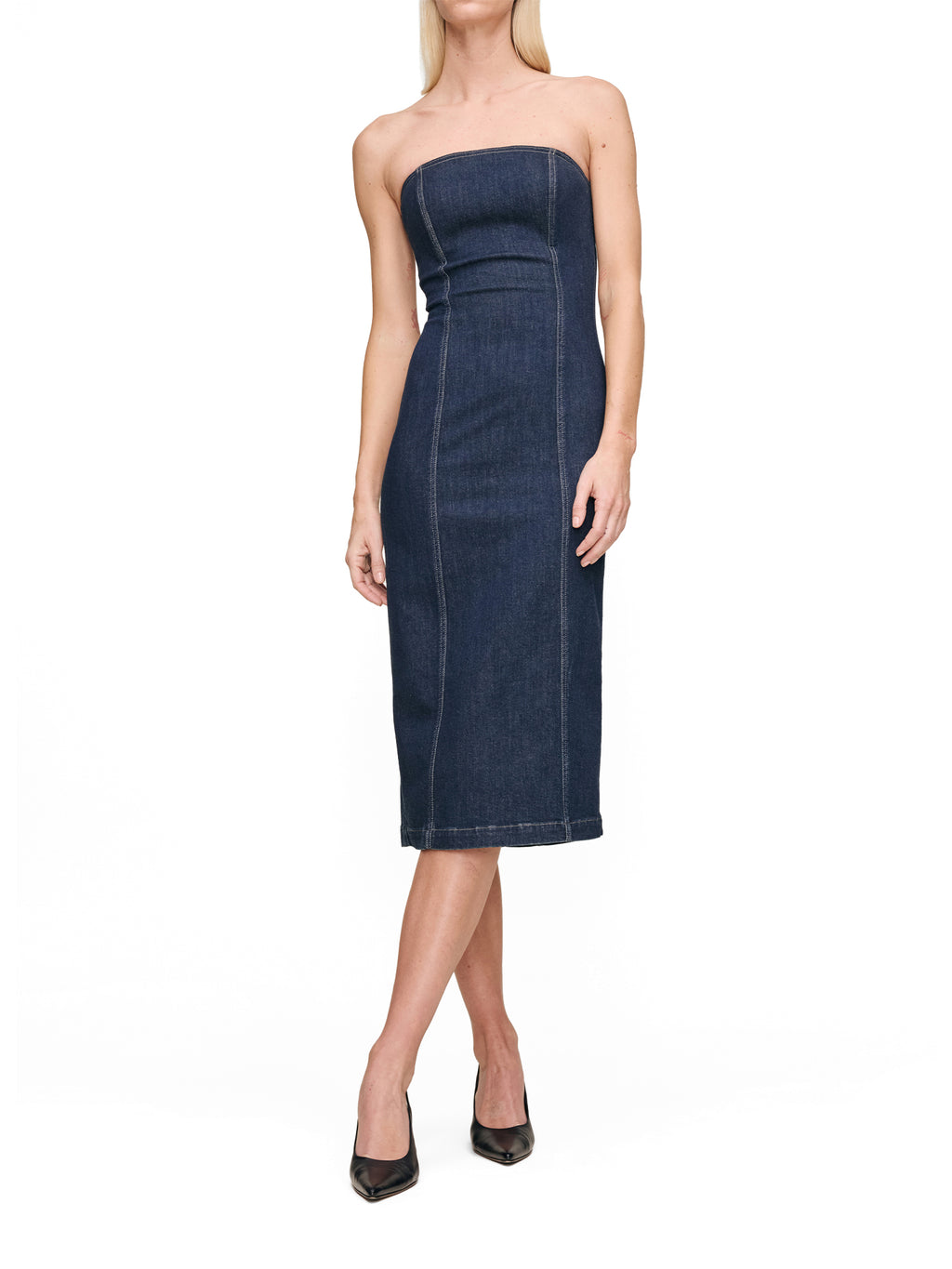 The Esme Denim Midi Dress by DL1961 is a sleek, strapless silhouette designed for a close, flattering fit. Cut in Crescent Harbor, a dark indigo wash with subtle fading, it’s finished with silver hardware, khaki stitching, and a clean hem. Crafted from DL Ultimate™ denim, the fabric blends eco-friendly fibers with advanced elastane technology for an exceptionally soft feel and a perfectly contoured fit. -