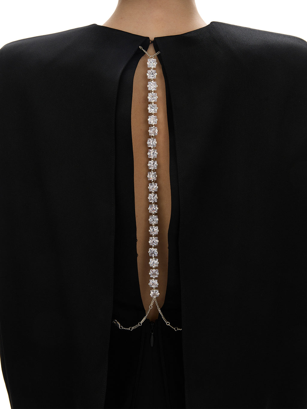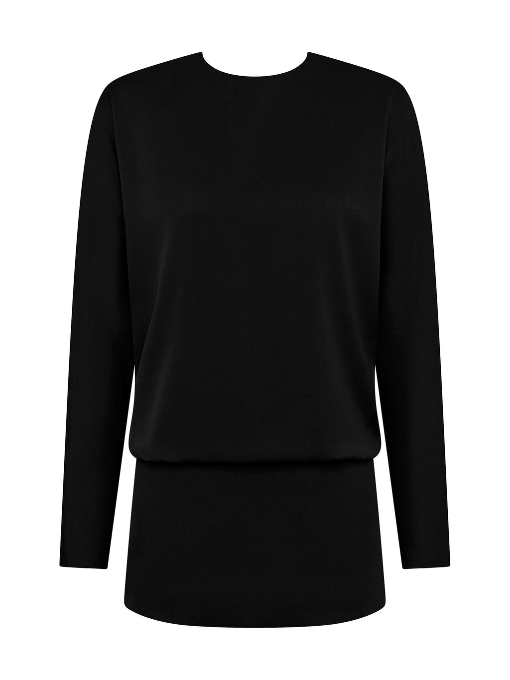 The Florida Mini Dress by Rachel Gilbert is a sleek, modern statement crafted in luminous black satin. Designed with a clean shift silhouette, it features shoulder pads for structure and relaxed batwing-style sleeves. A subtle open-back detail is finished with hand-placed embellished trim, adding a touch of sparkle. Polished yet playful, this mini is made for cocktail nights and after-dark occasions.