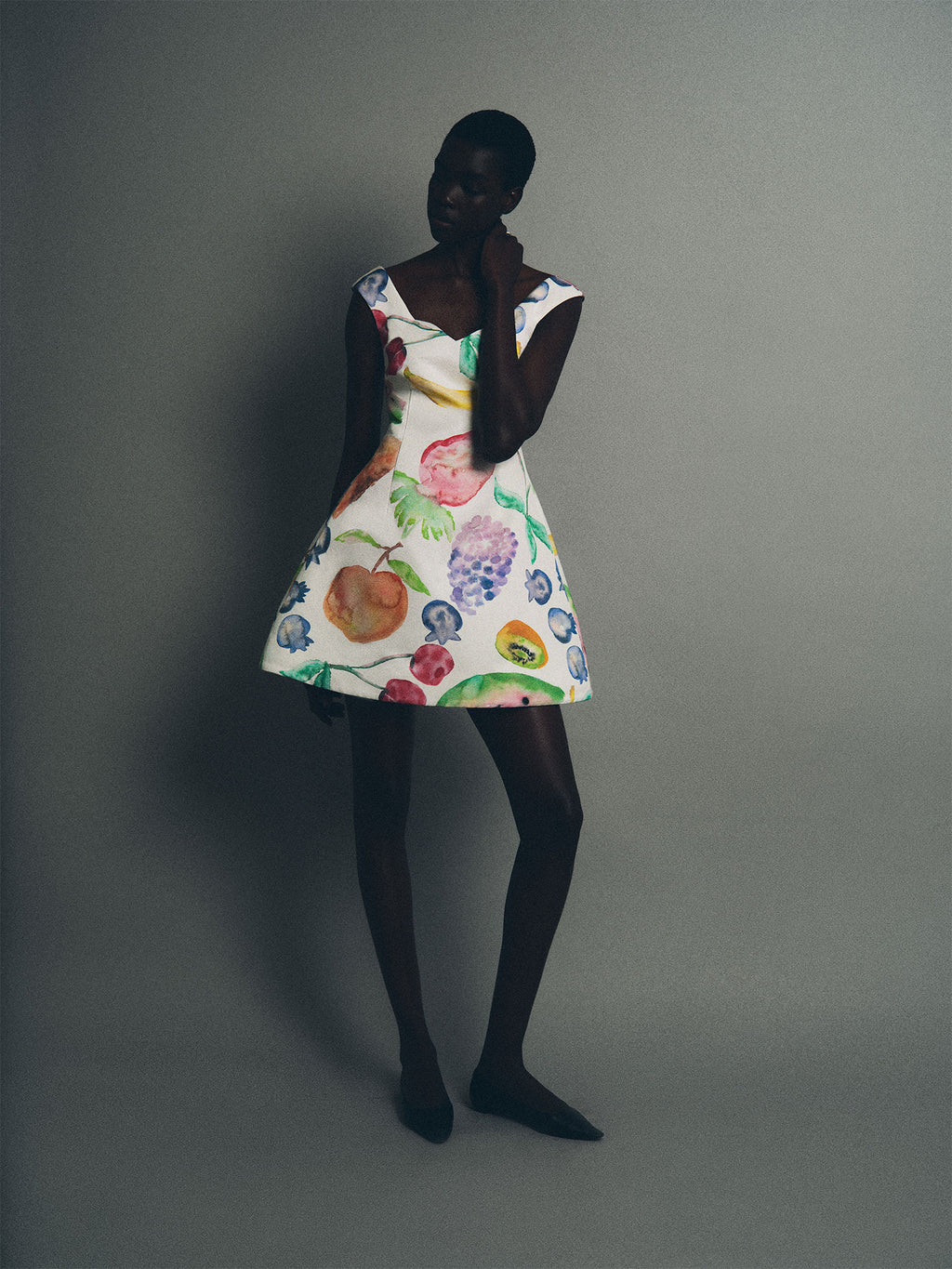 The Fruit Cotton Faille Halo Mini Dress by Rosie Assoulin reimagines classic structure through a modern lens. Crafted from crisp cotton faille, it features a contoured bodice with a subtle sweetheart neckline that transitions into a flared A-line skirt. The sculptural silhouette frames the shoulders and waist with precision, while a concealed back zip ensures a clean finish. Both playful and polished, this piece embodies effortless, architectural femininity.