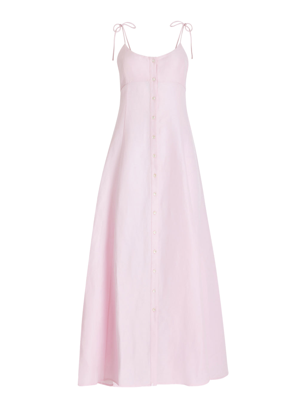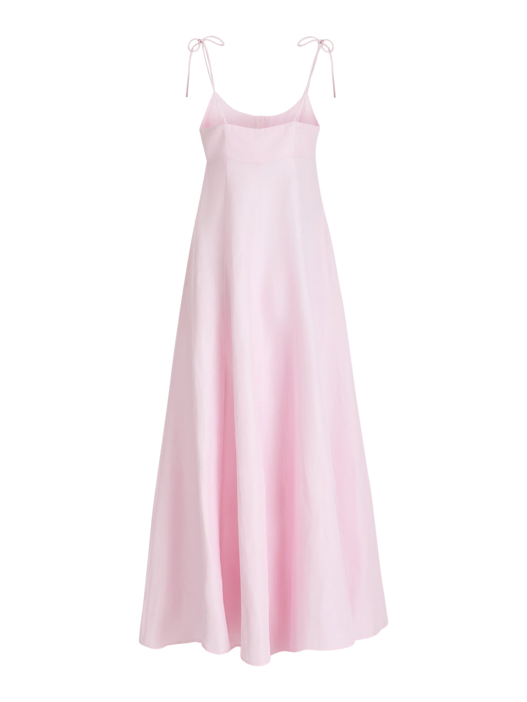 The Linen Viscose High Garden Maxi Dress by Rosie Assoulin embodies romance in motion. Cut from a lightweight linen-viscose blend in a delicate blush tone, it features slender tie straps, a gently fitted bodice, and a sweeping full-length skirt. The fabric’s drape and texture lend a sense of luxury, making it an ideal choice for warm days or sunset evenings. Effortless to style, it pairs beautifully with sandals for daytime or with heels and jewelry for an elevated finish. -