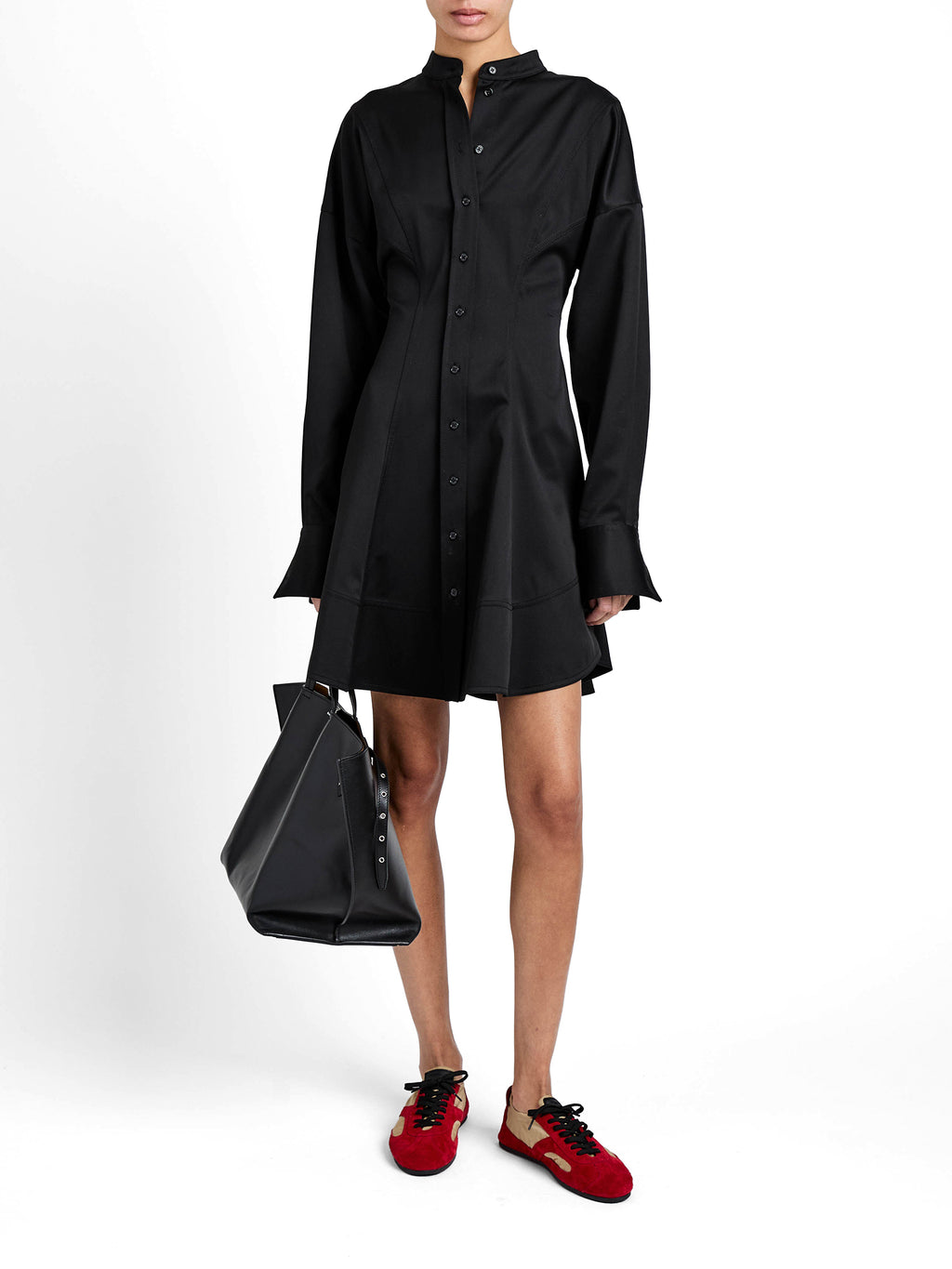 Proenza Schouler’s Janan Shirtdress reflects the house’s deconstructed, deliberately undone approach with asymmetric proportions and oversized tailoring. Designed with long sleeves and full button fastenings, it features a clean banded collar balanced by a flared mini skirt for a relaxed, modern take on the classic shirtdress silhouette. -