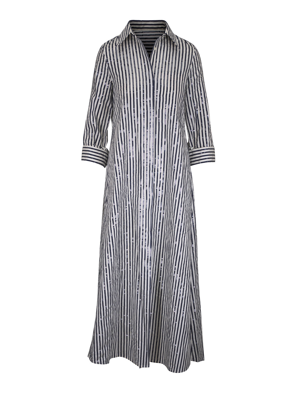 The Jenny’s Gown by TWP is an oversized maxi shirt dress cut from superfine Italian cotton shirting illuminated with clear sequins over a crisp stripe. The relaxed A-line silhouette moves with ease, framed by a spread collar and finished with a button-up placket, chest patch pocket, and TWP’s signature single roll button cuffs. It’s a polished, light-reflective take on an essential silhouette. -
